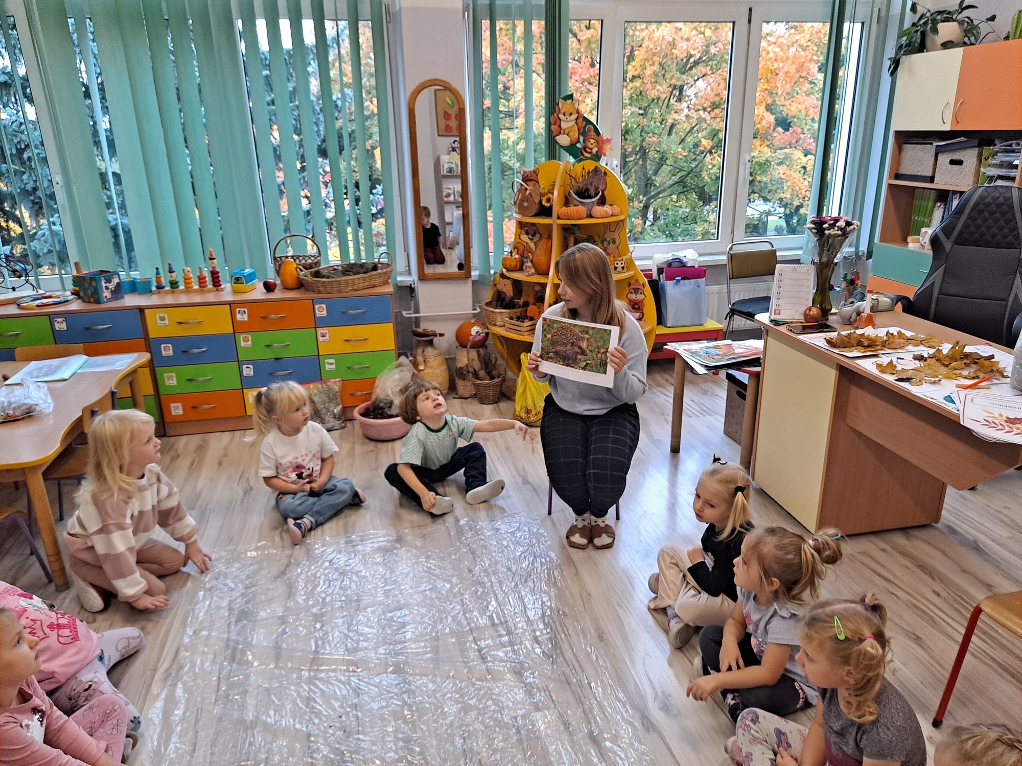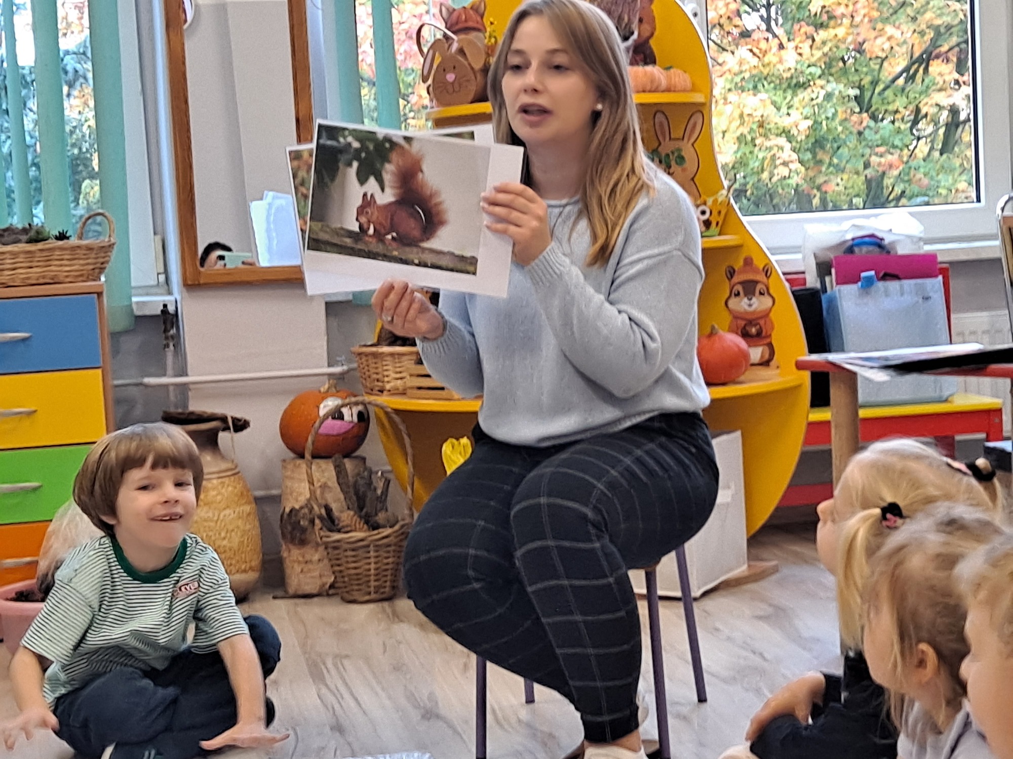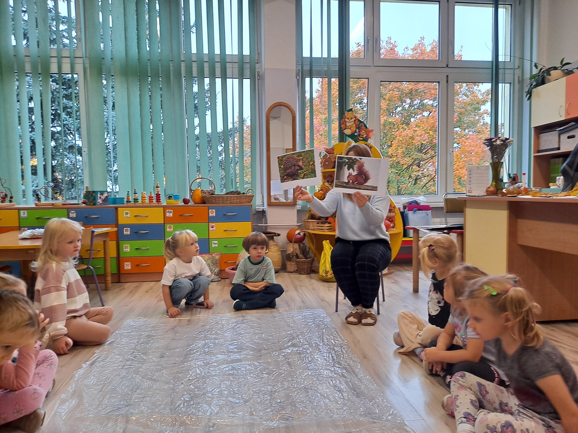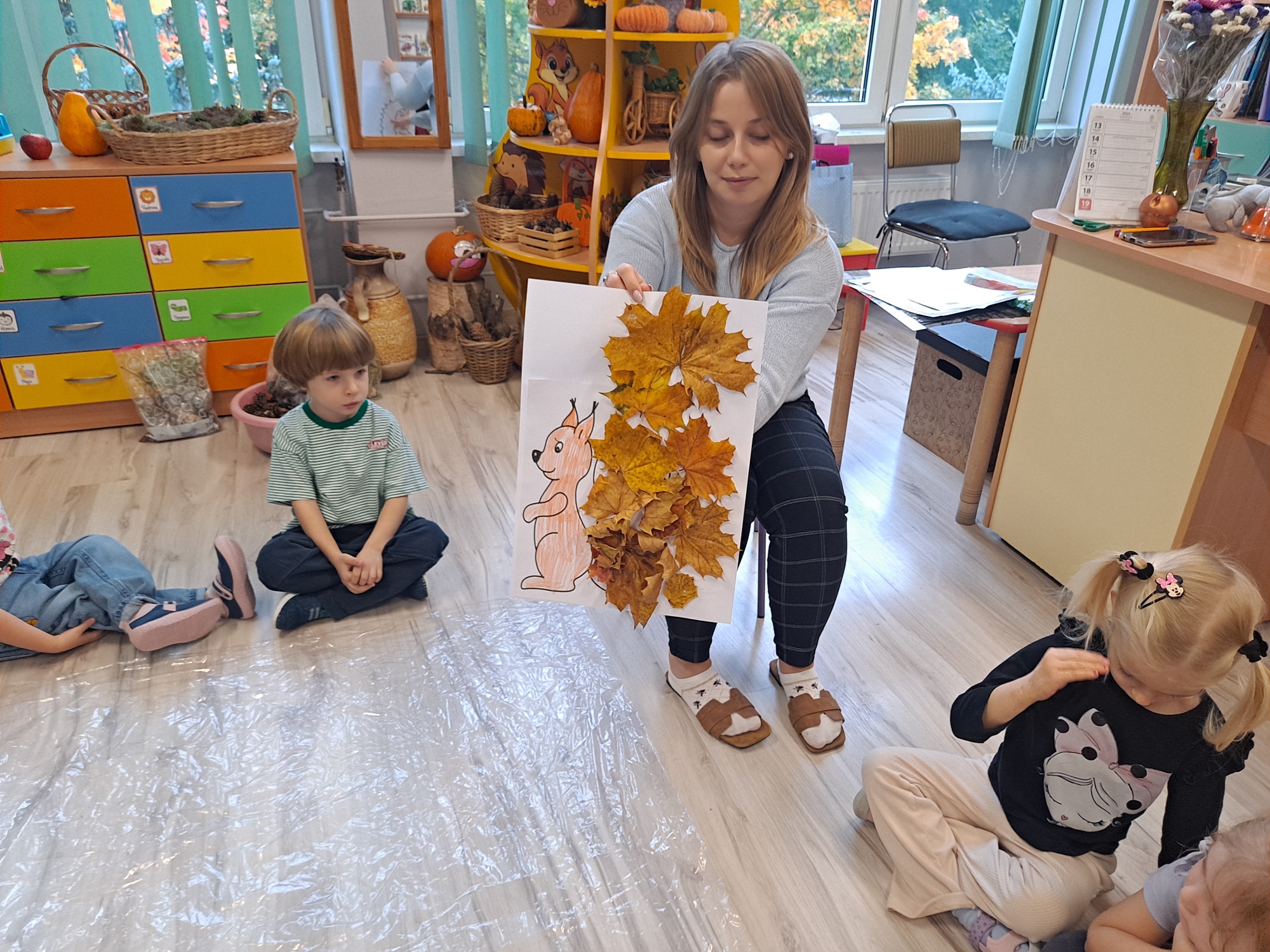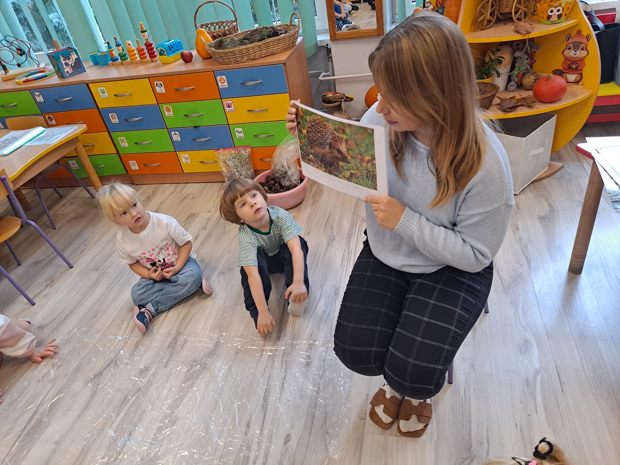 Dzisiaj na zajęciach dzieci poznały zwierzęta, które najczęściej możemy spotkać jesienią – jeża i wiewiórkę.