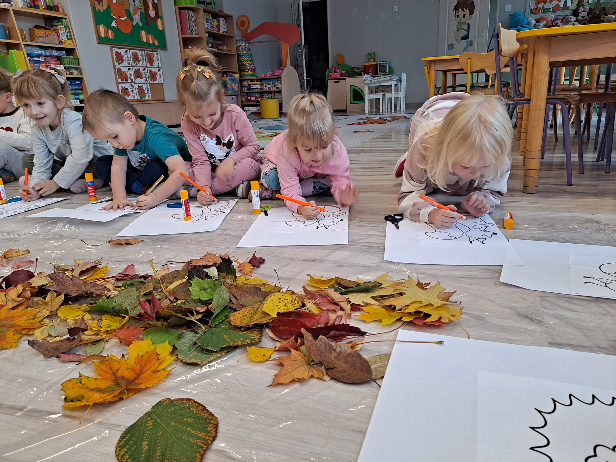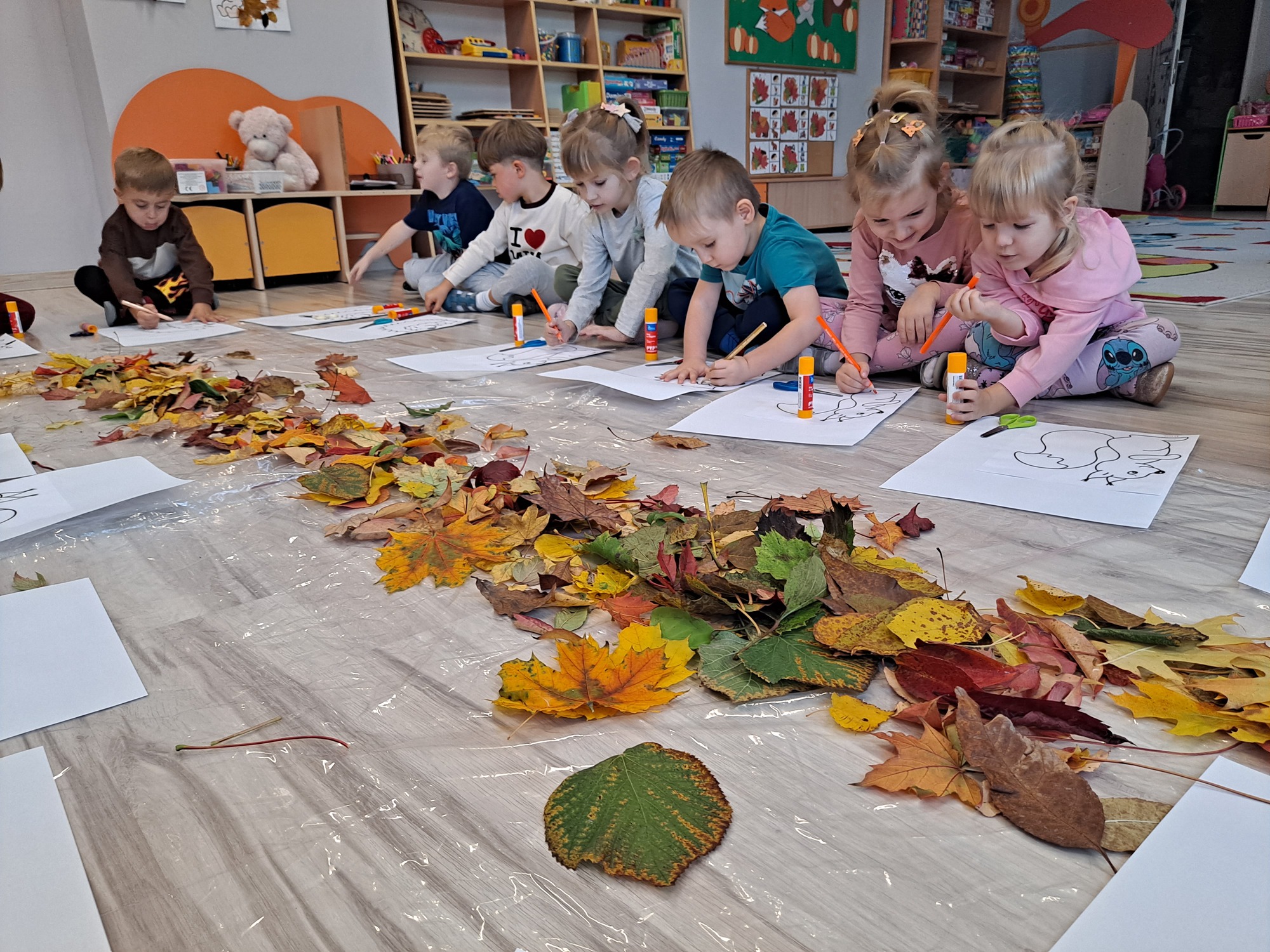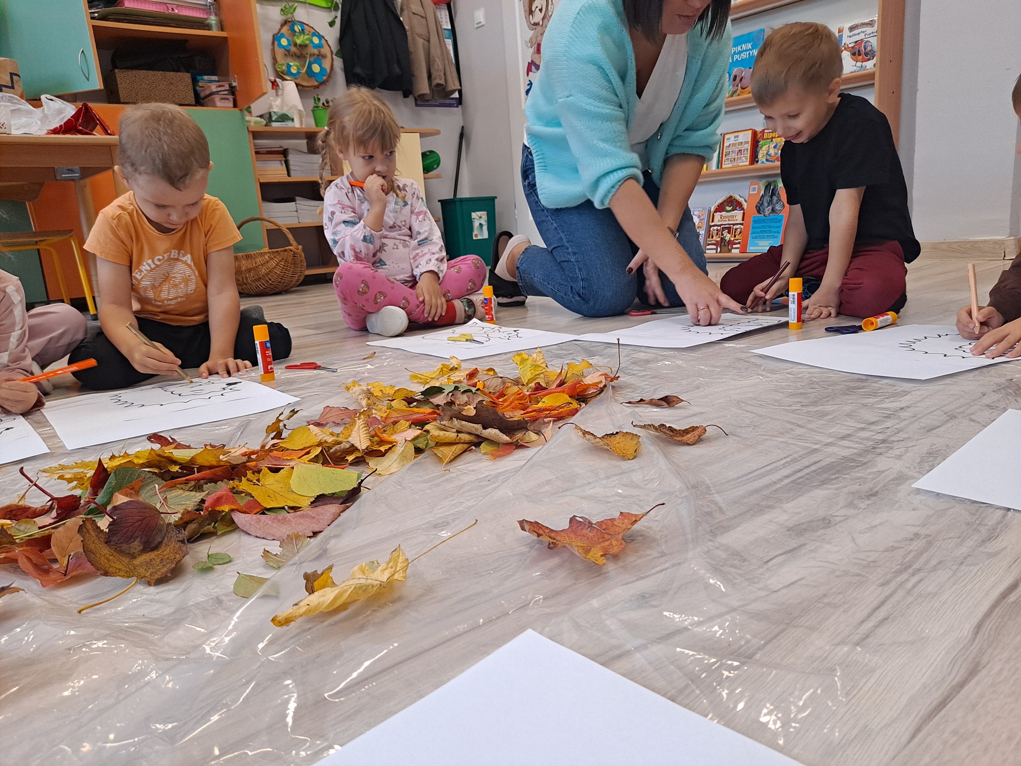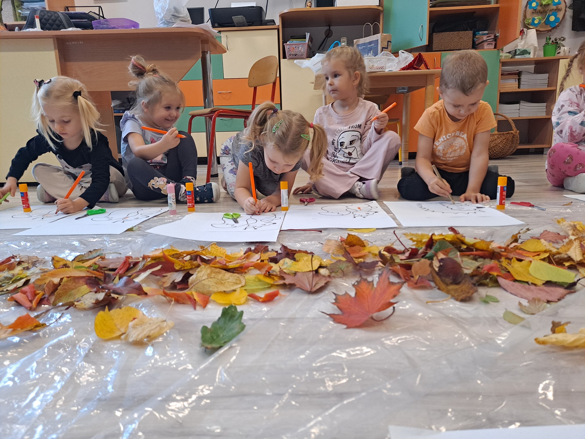 Dzieci dobierały liście według kształtu i koloru, smarowały je klejem i starannie przyklejały do swoich prac.