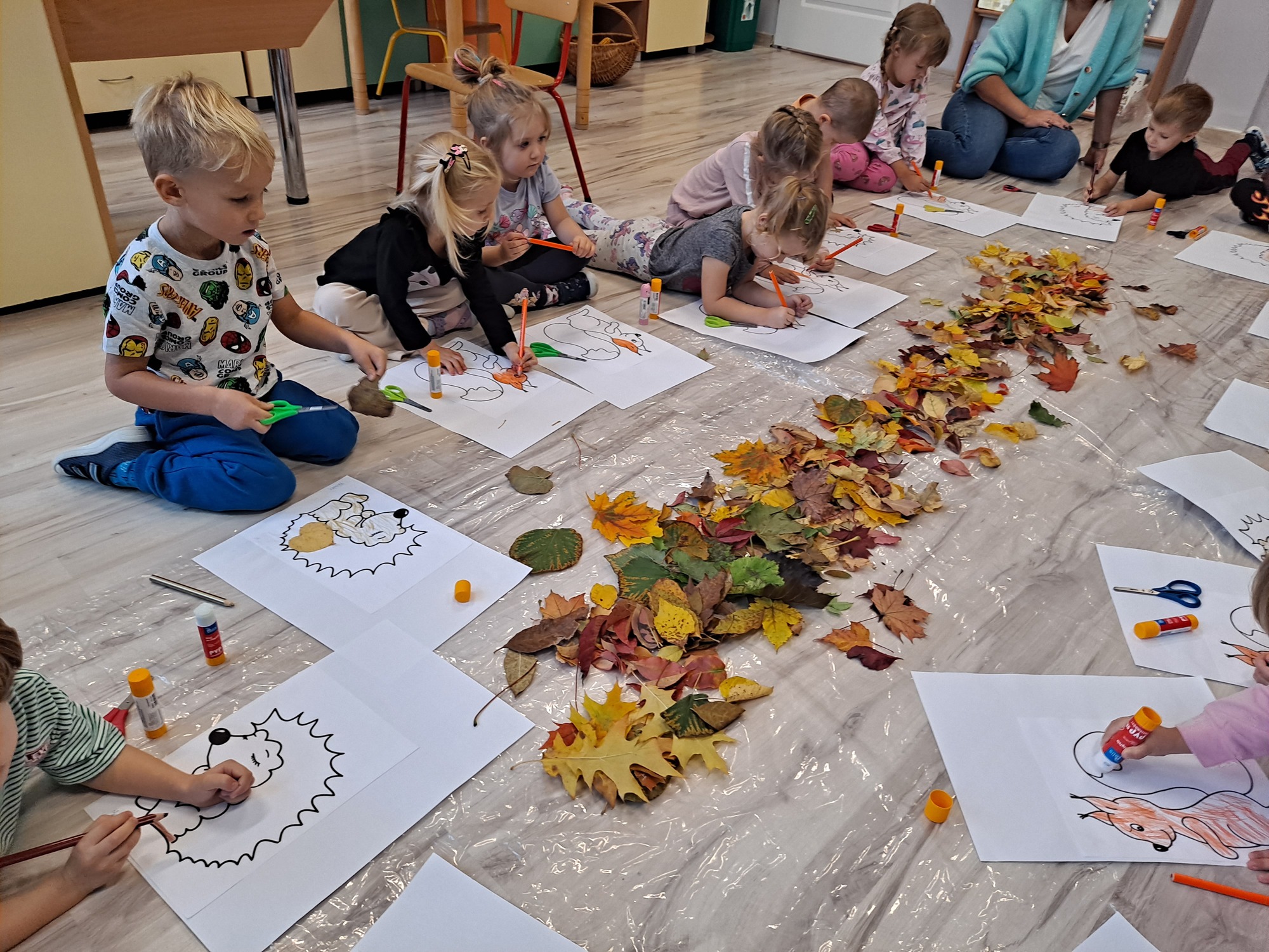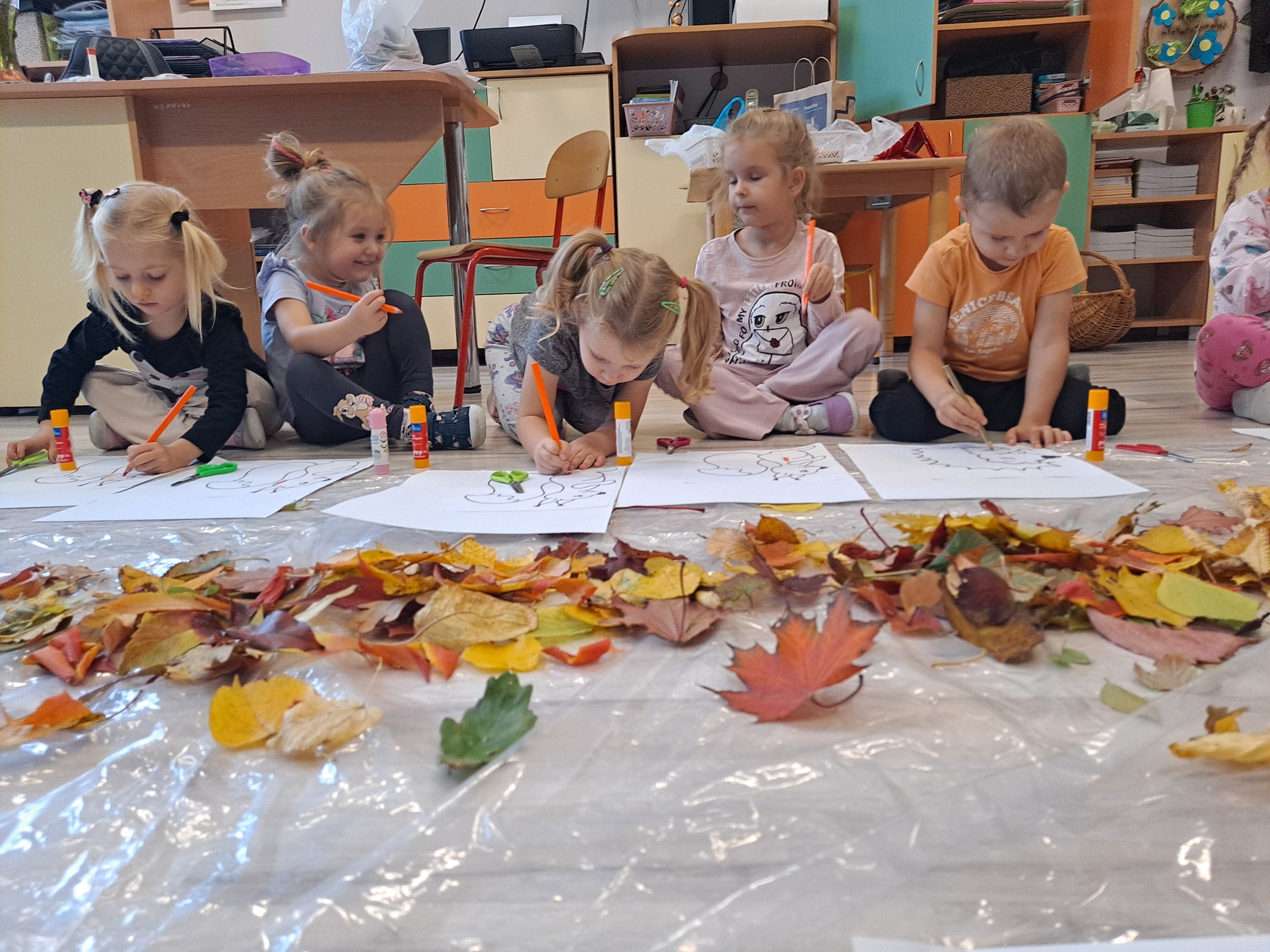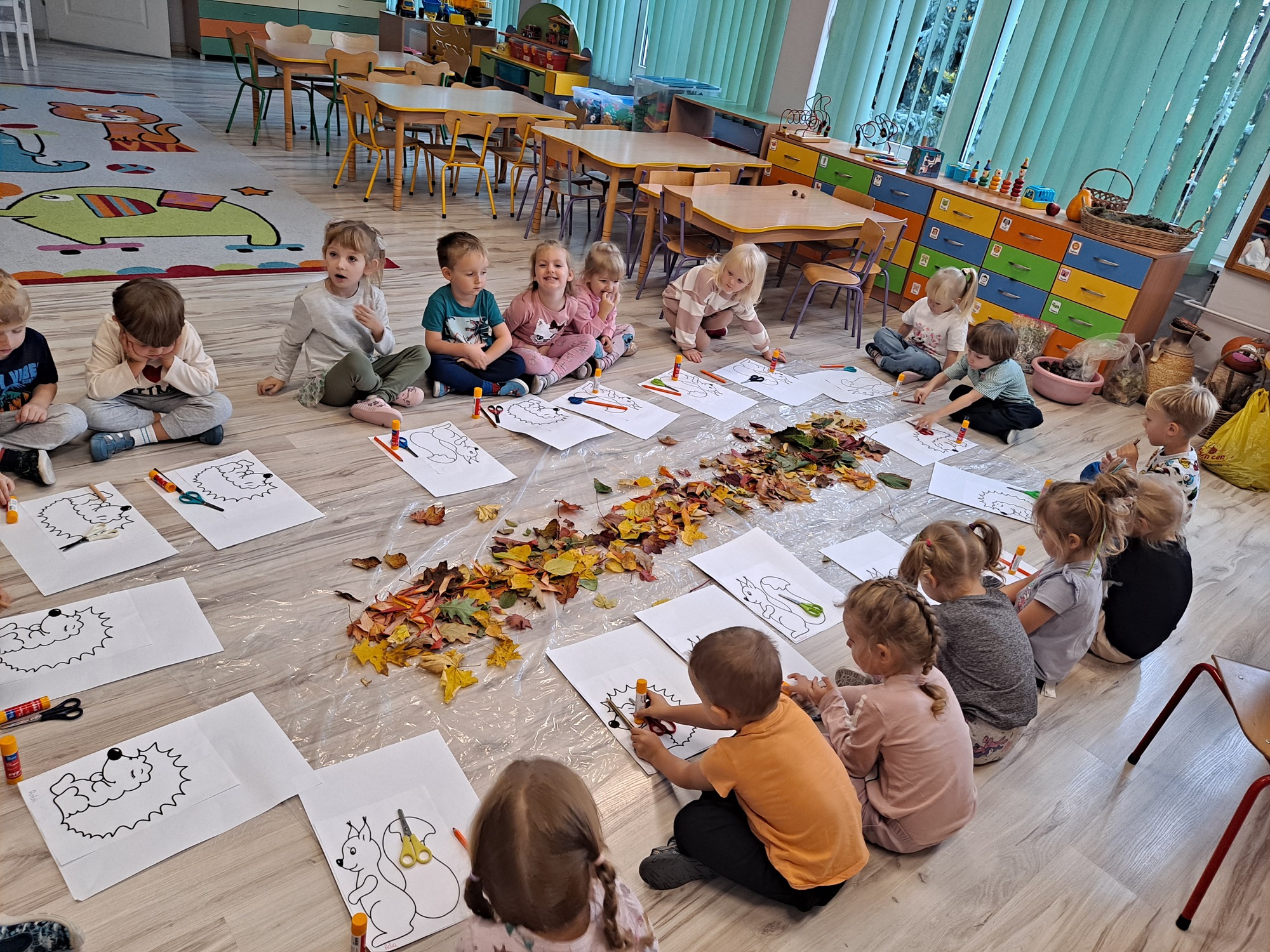 Dzieci dobierały liście według kształtu i koloru, smarowały je klejem i starannie przyklejały do swoich prac.