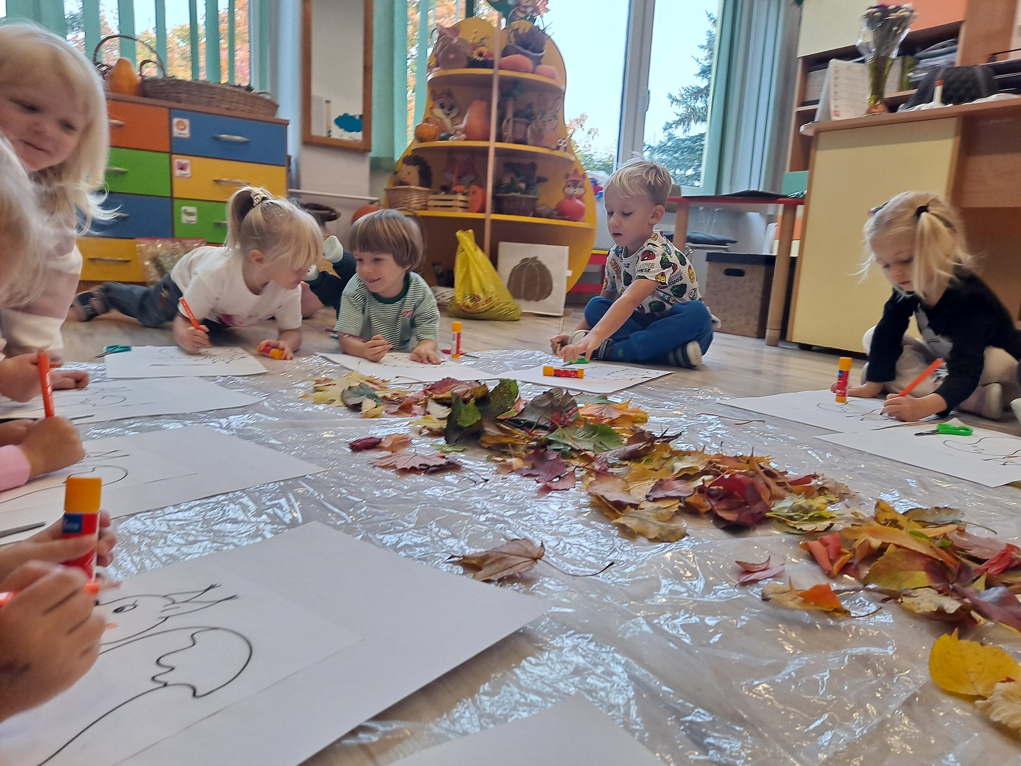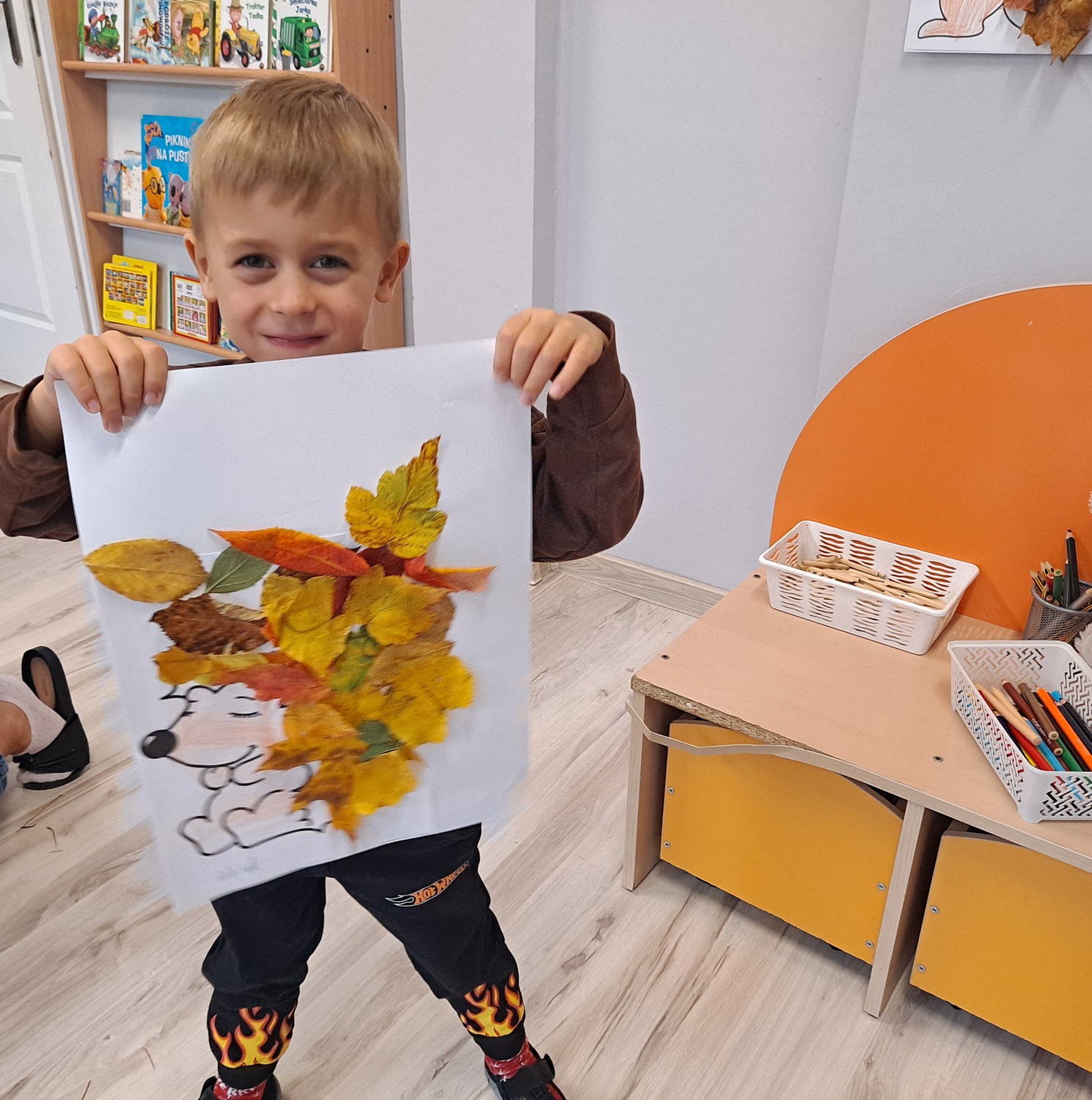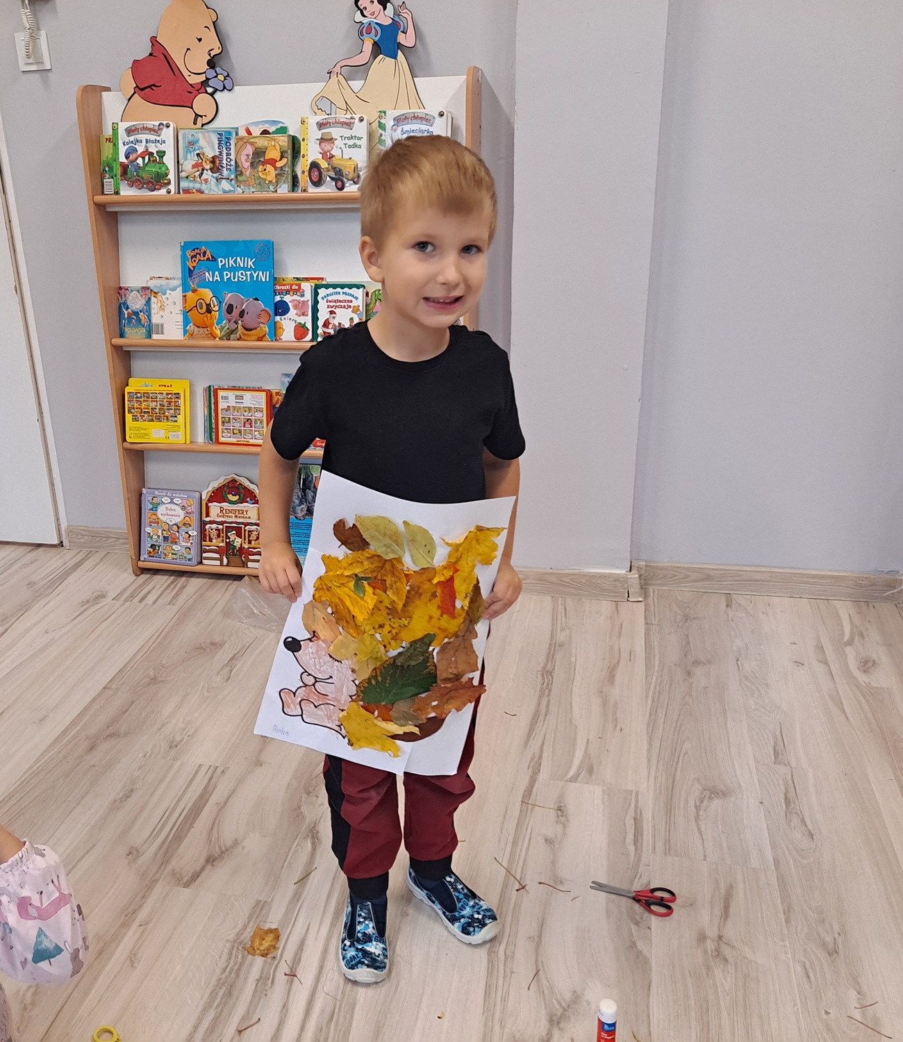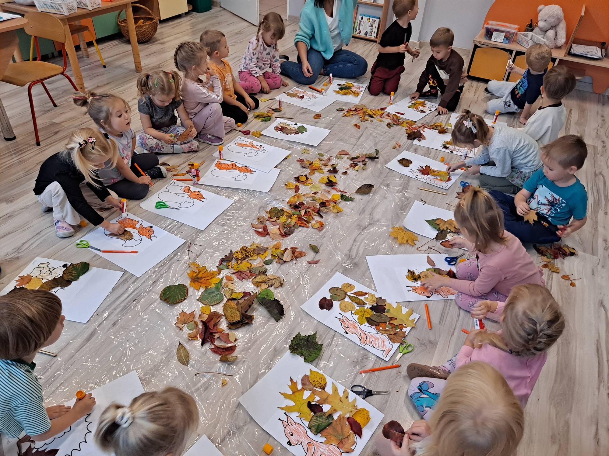 Dzieci dobierały liście według kształtu i koloru, smarowały je klejem i starannie przyklejały do swoich prac.