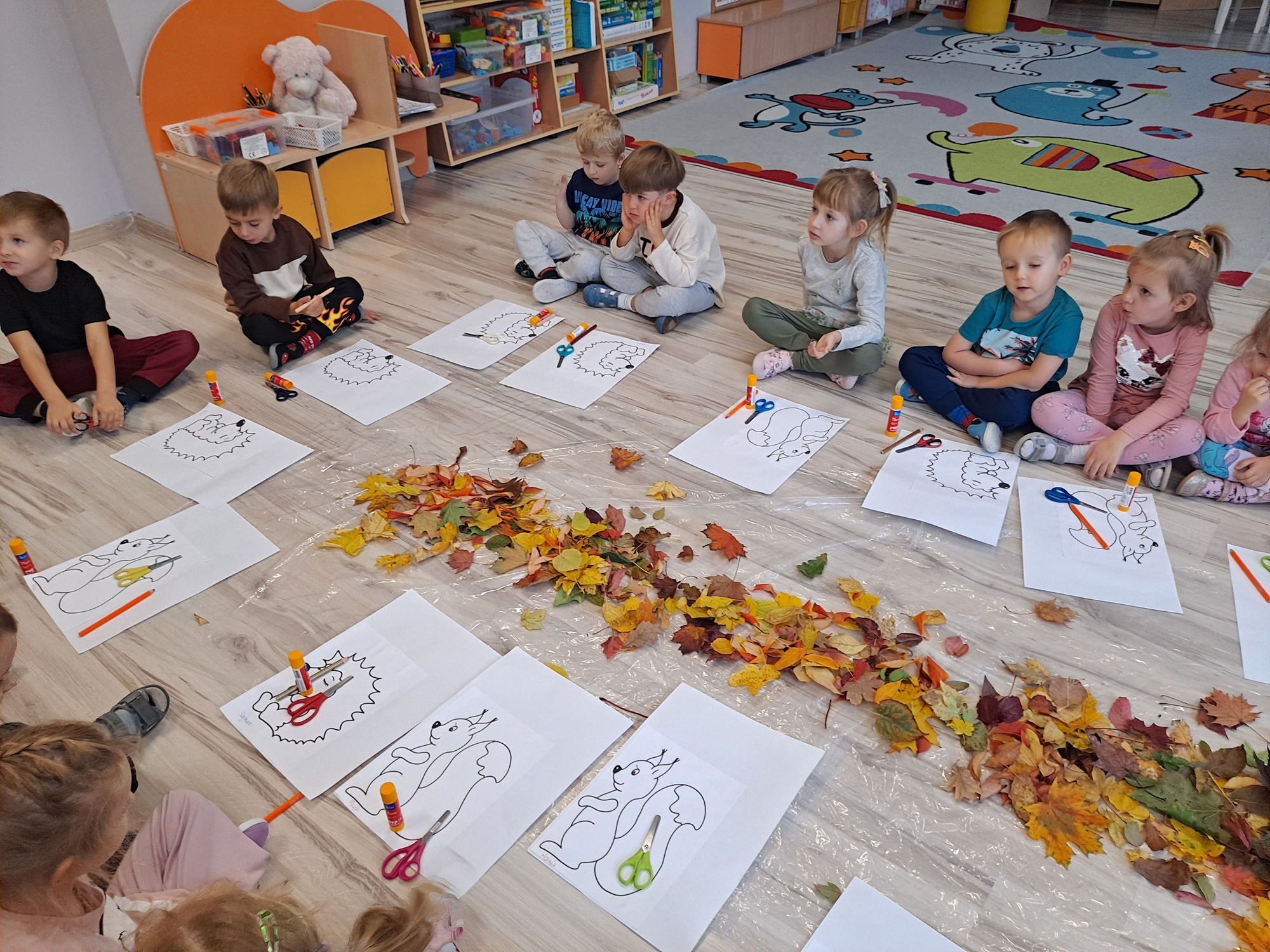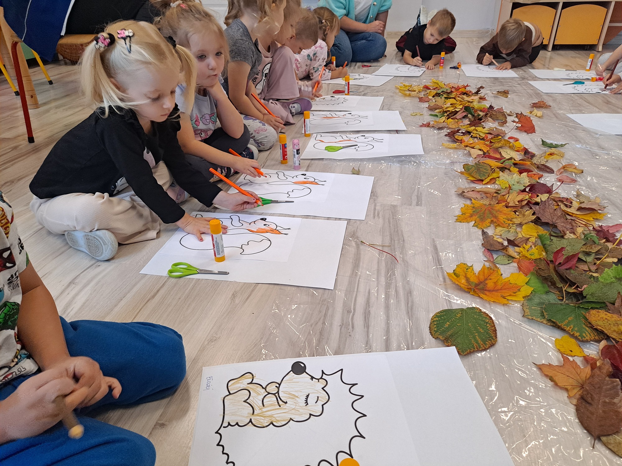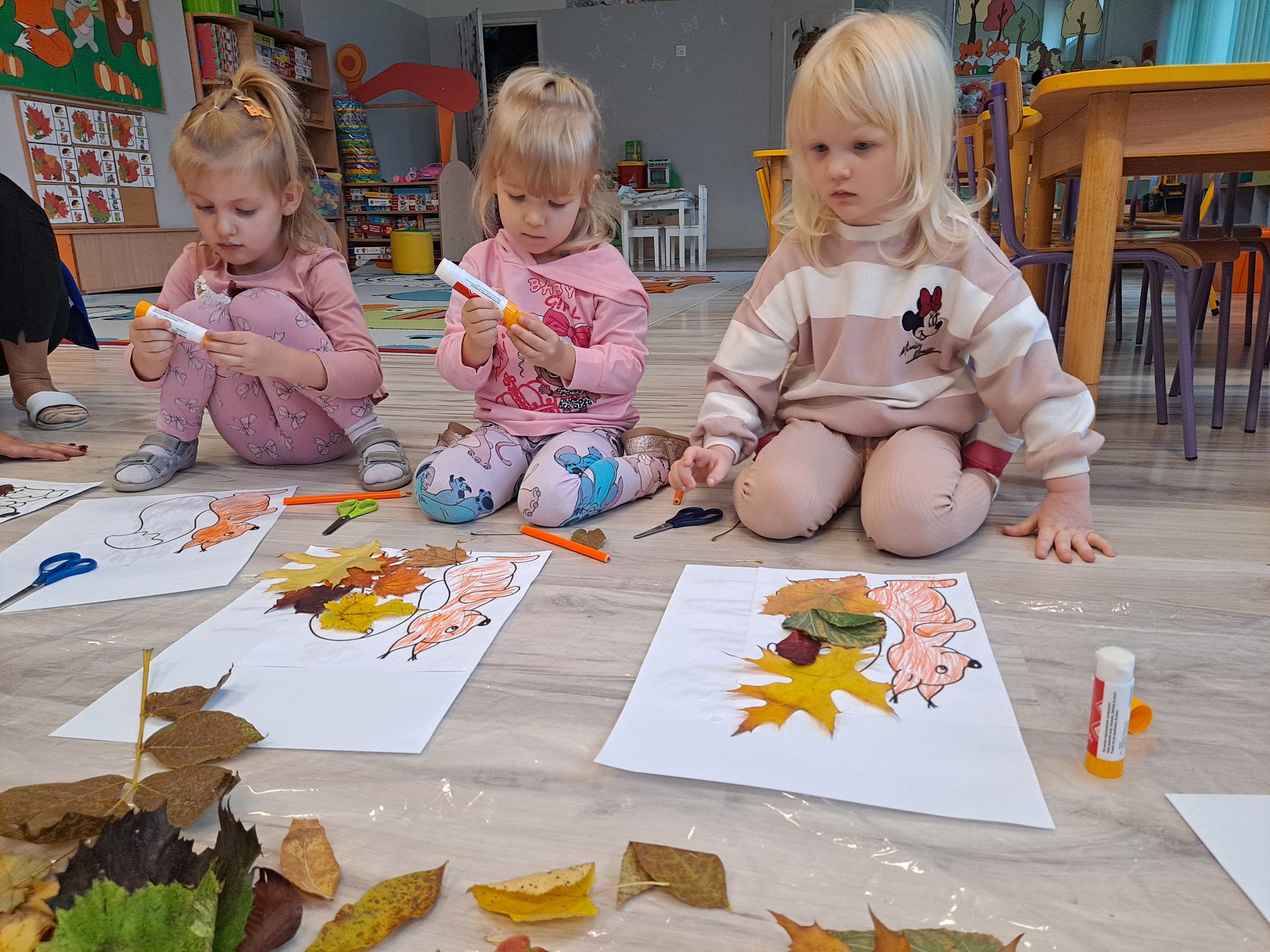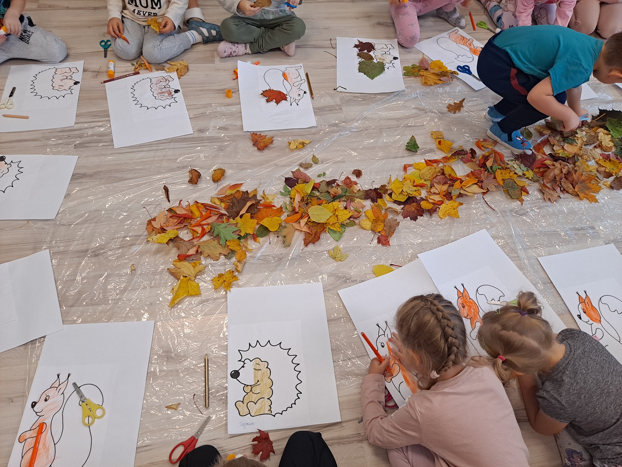 Następnie wykonały pracę plastyczną – na przygotowanych kartach z konturami zwierząt naklejały kolorowe, jesienne liście, tworząc futerka oraz tło.