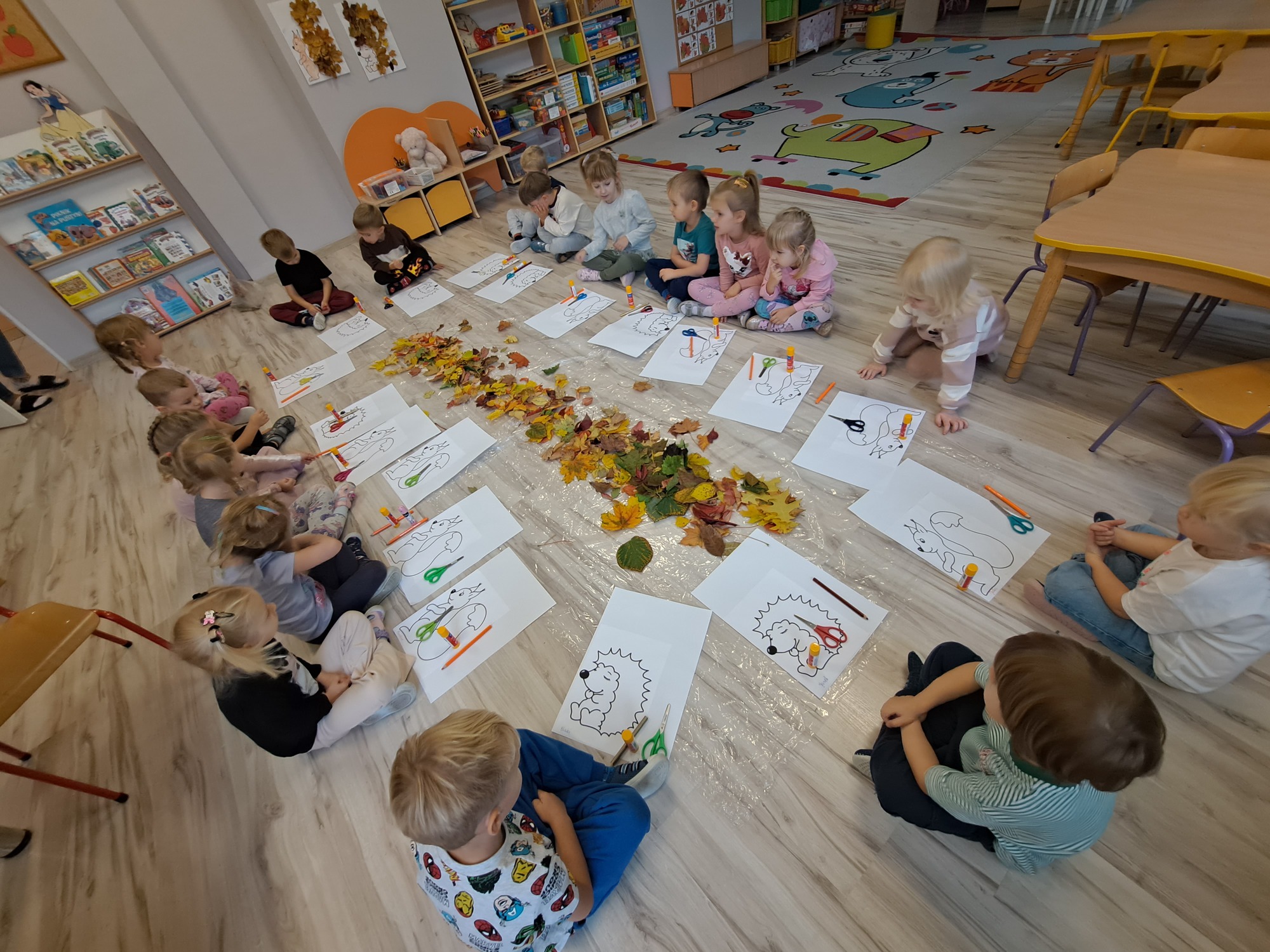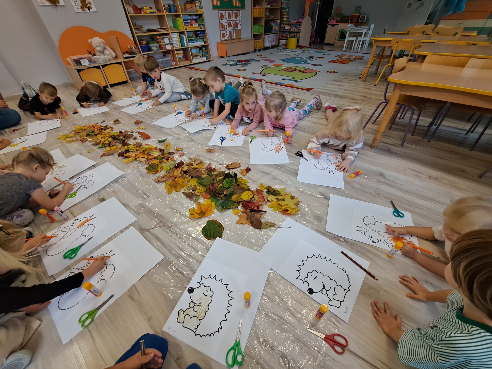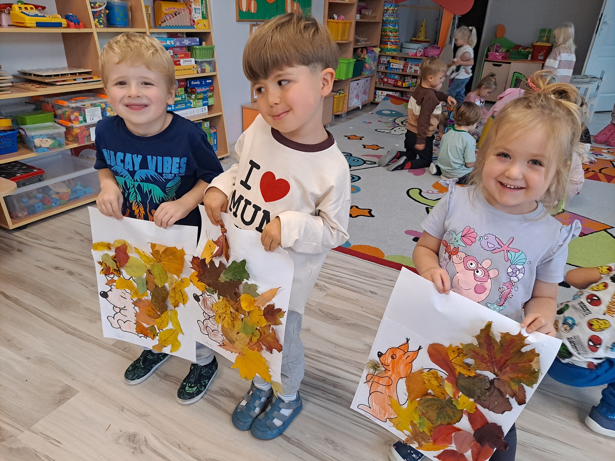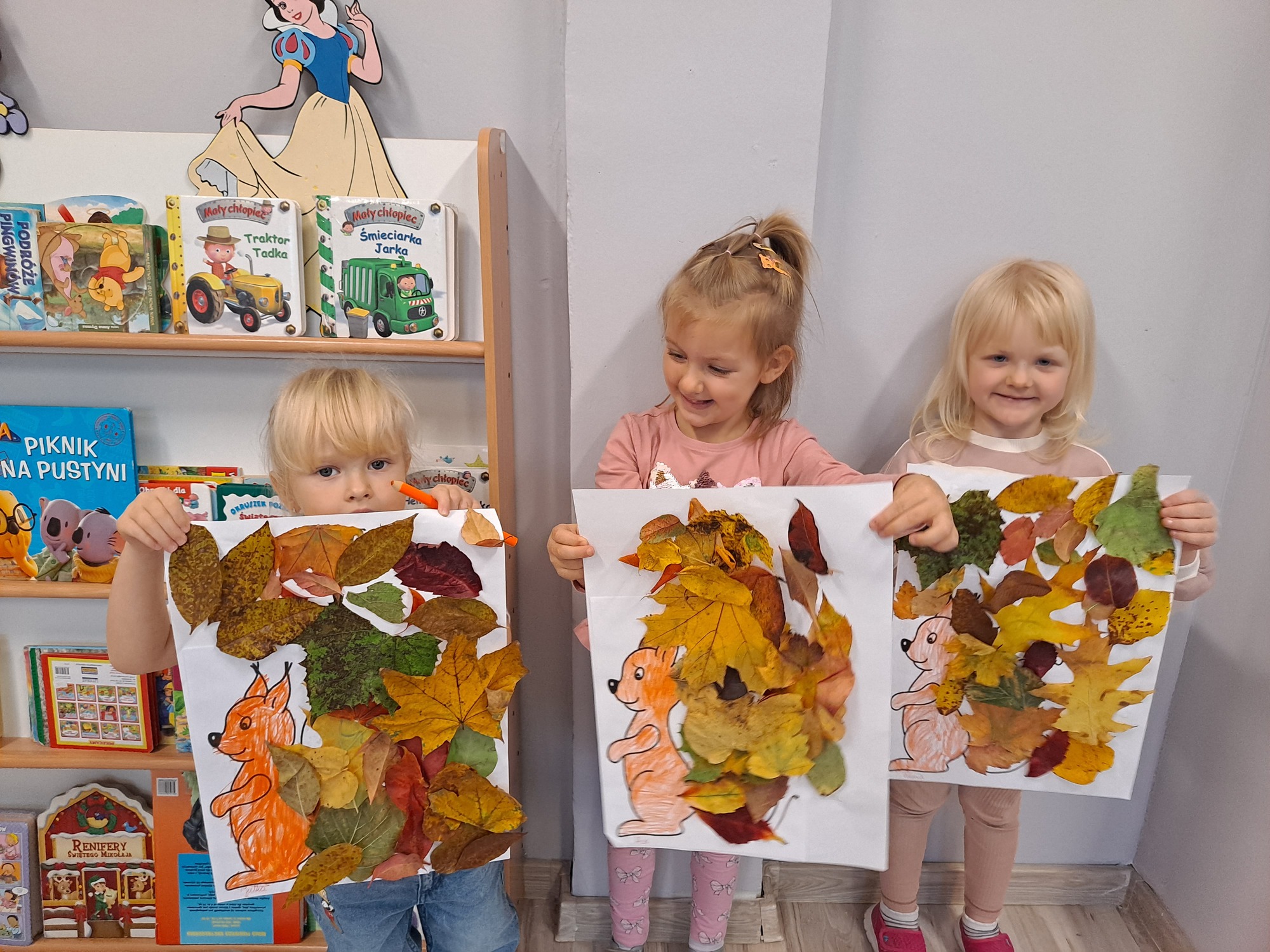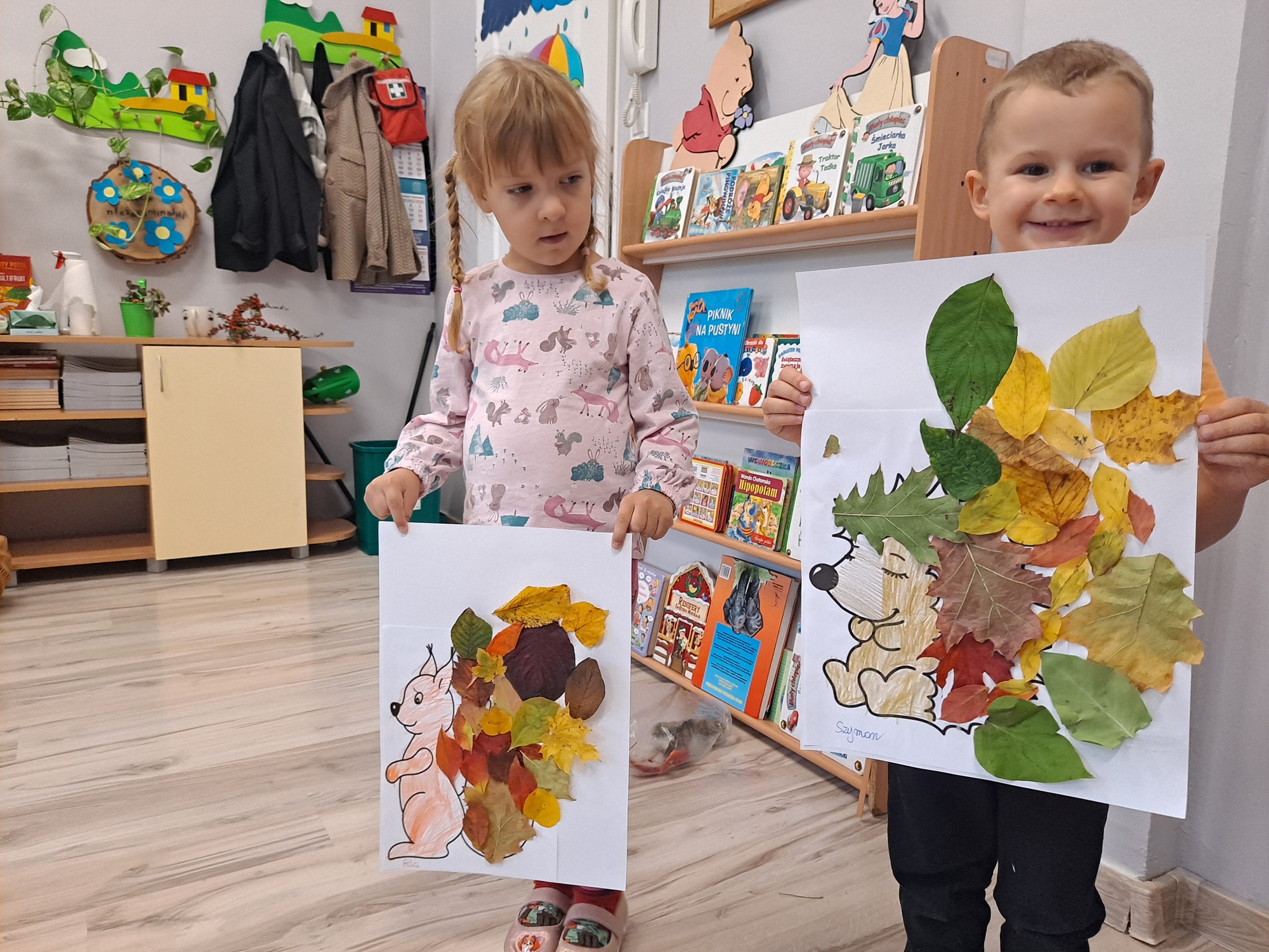 Następnie wykonały pracę plastyczną – na przygotowanych kartach z konturami zwierząt naklejały kolorowe, jesienne liście, tworząc futerka oraz tło.