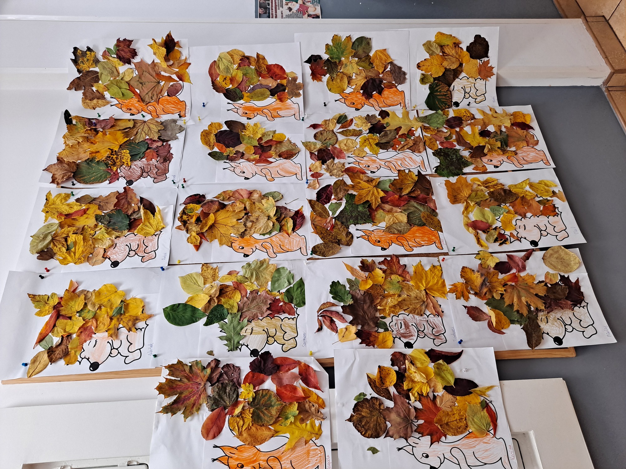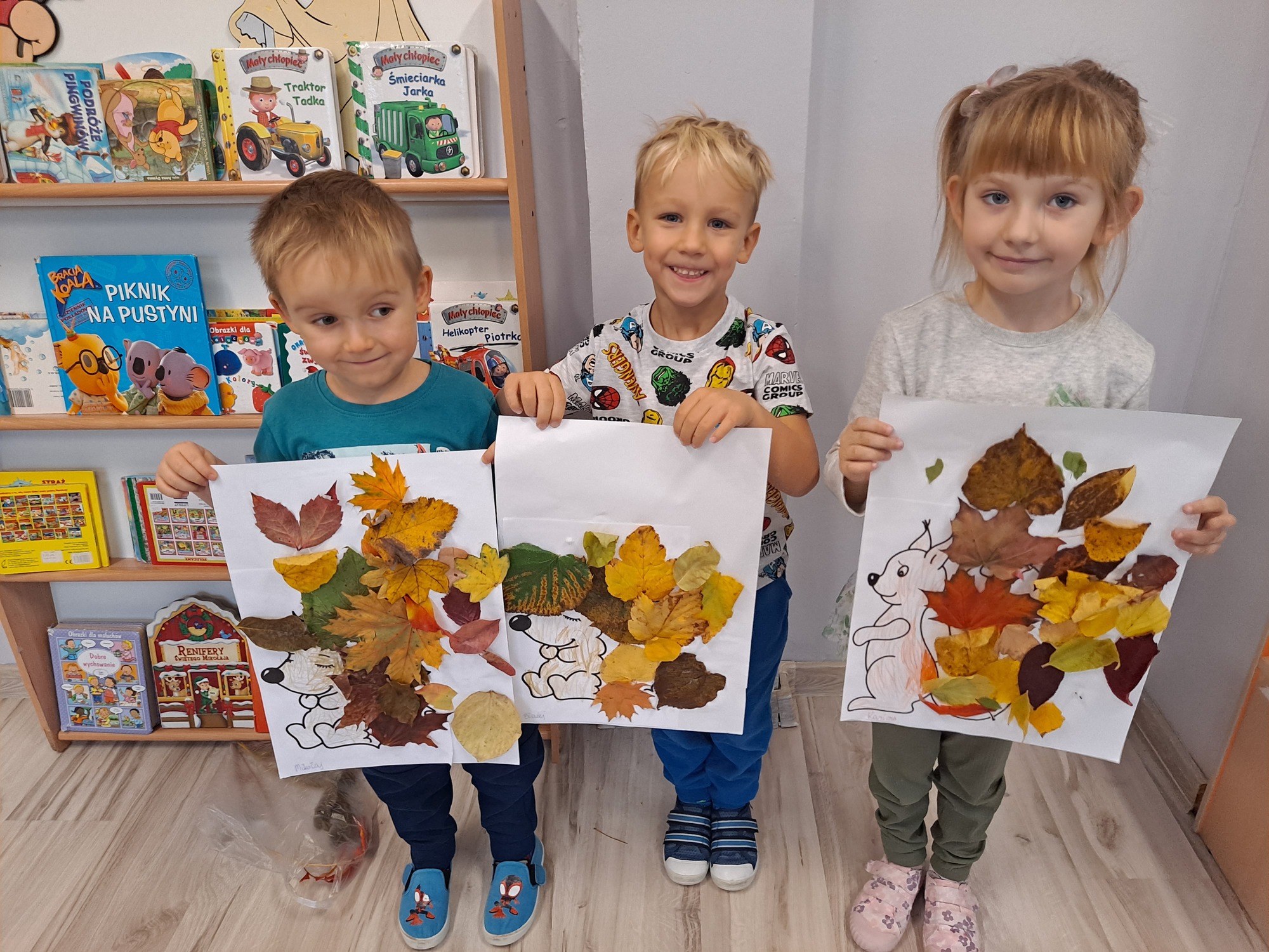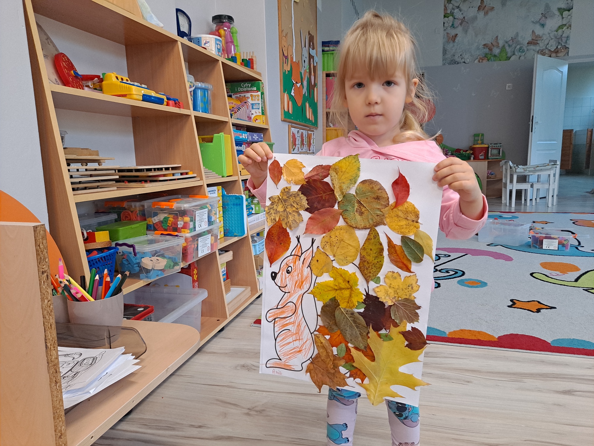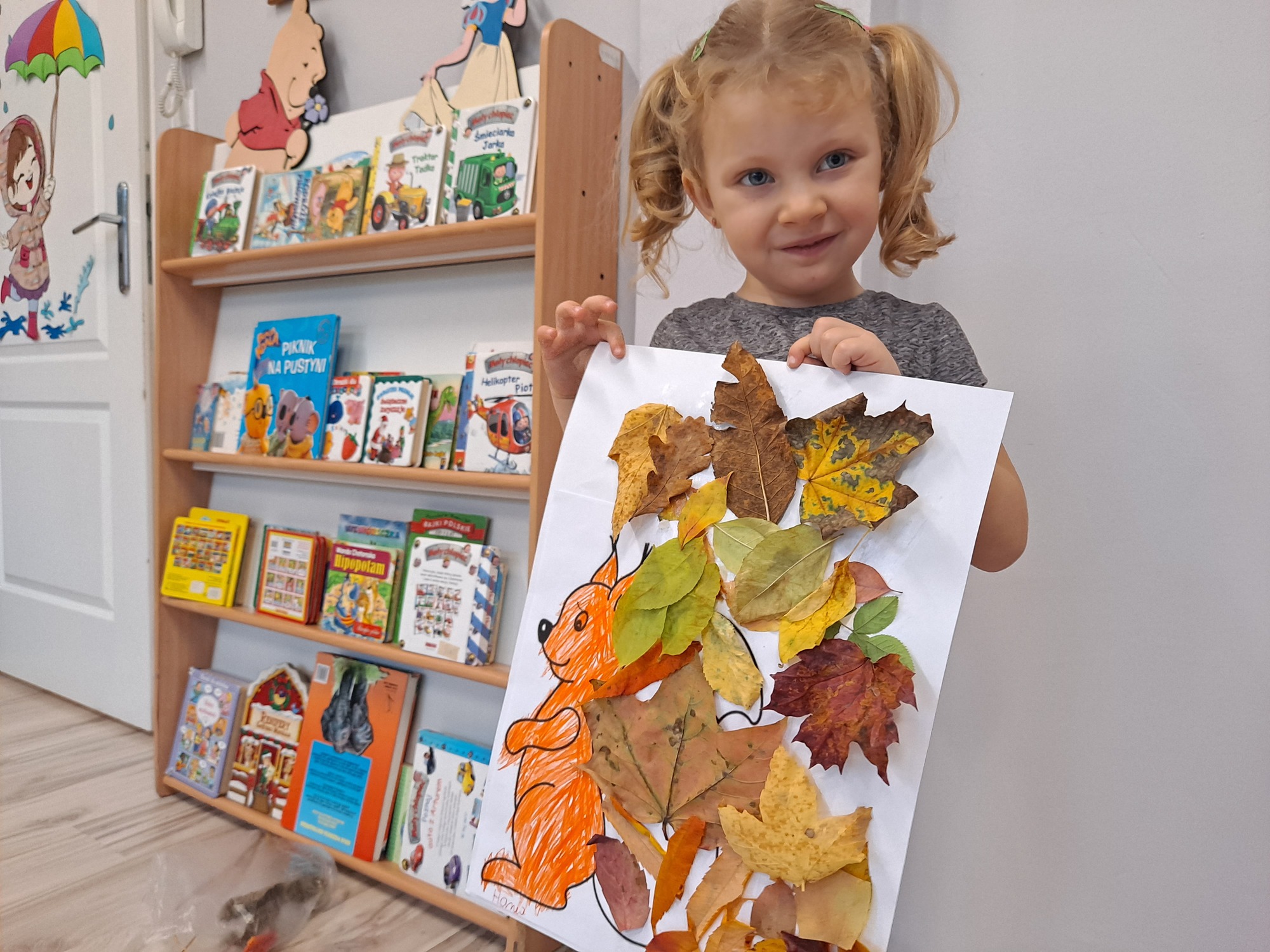 Następnie wykonały pracę plastyczną – na przygotowanych kartach z konturami zwierząt naklejały kolorowe, jesienne liście, tworząc futerka oraz tło.