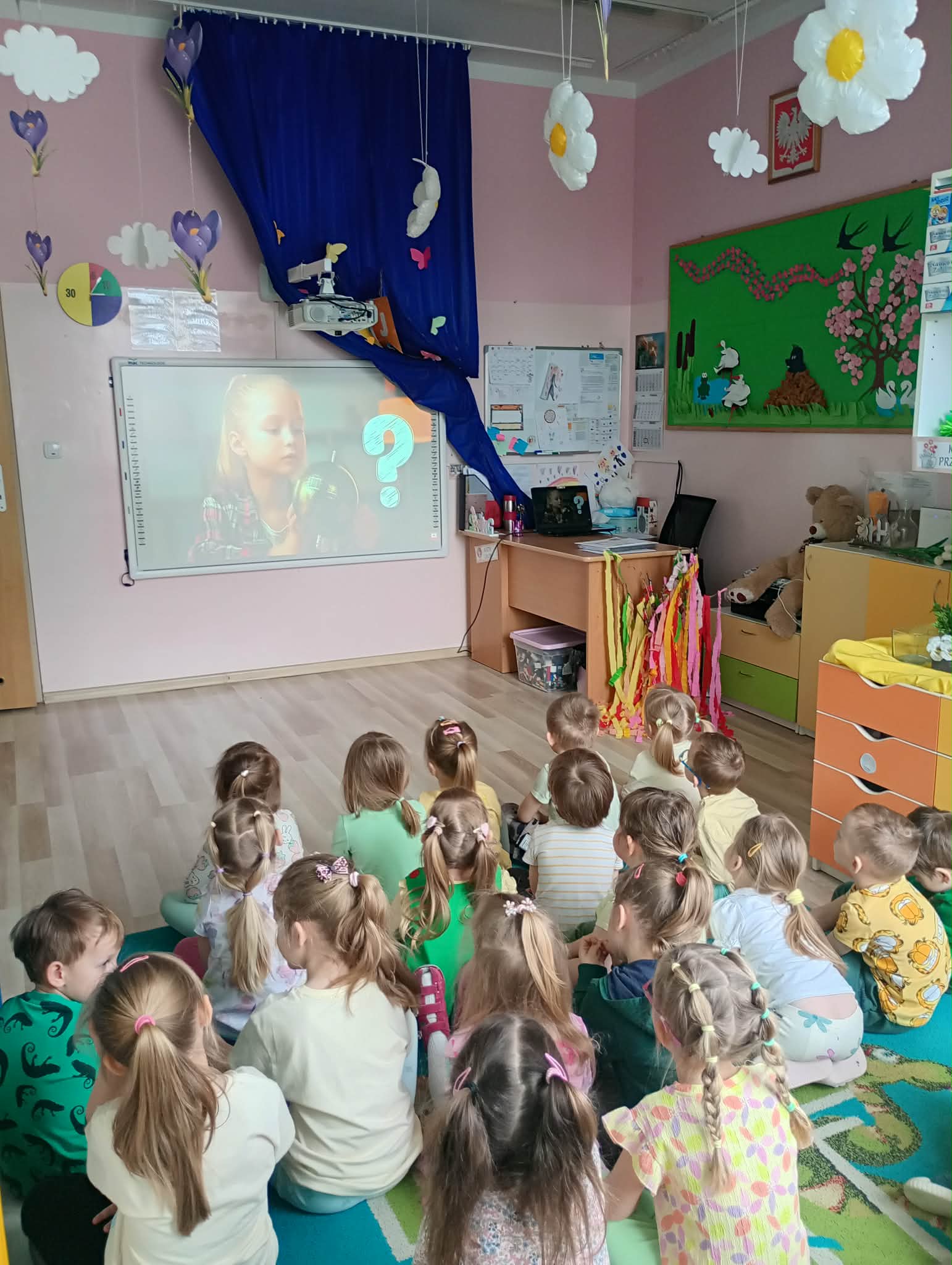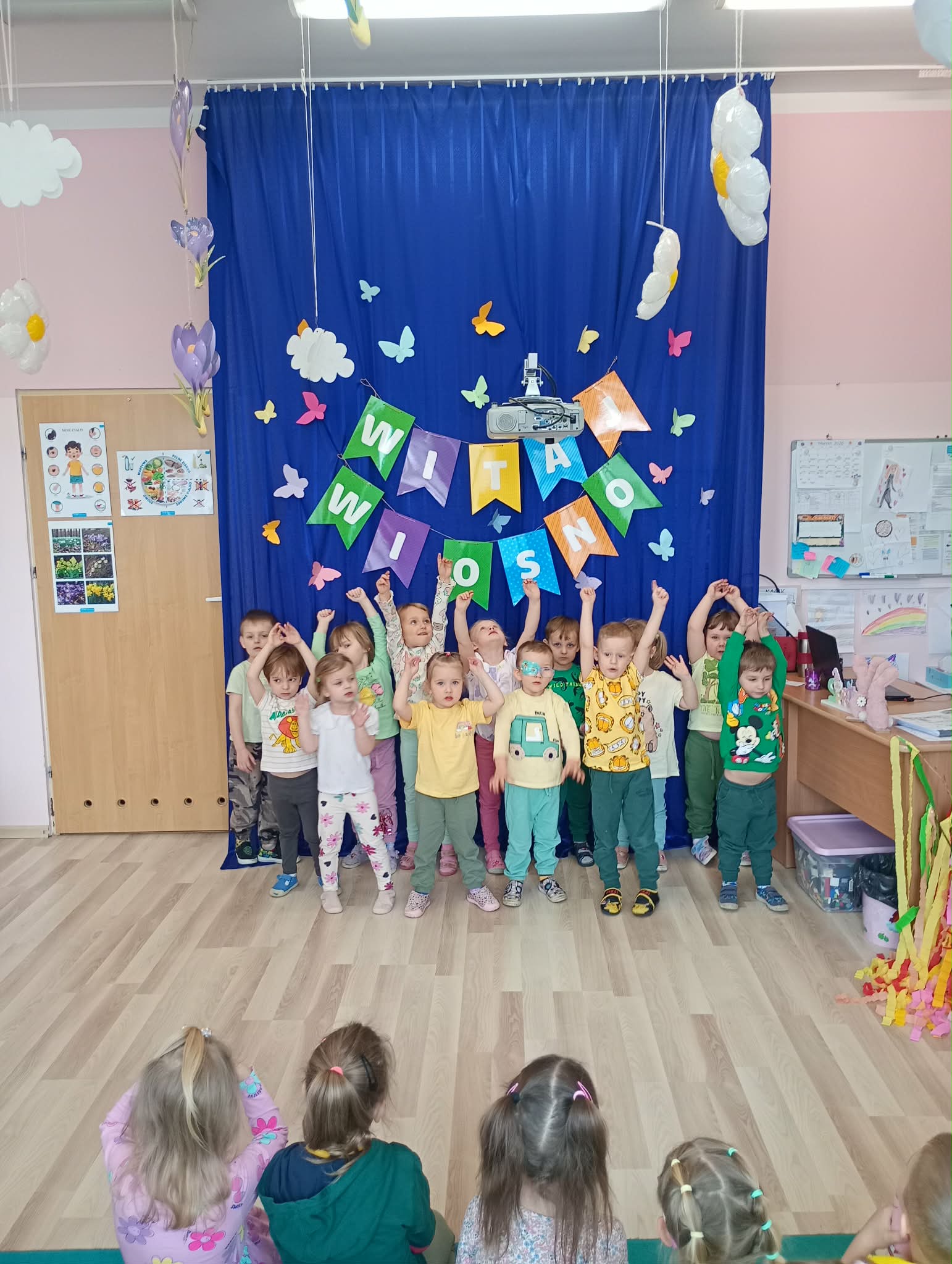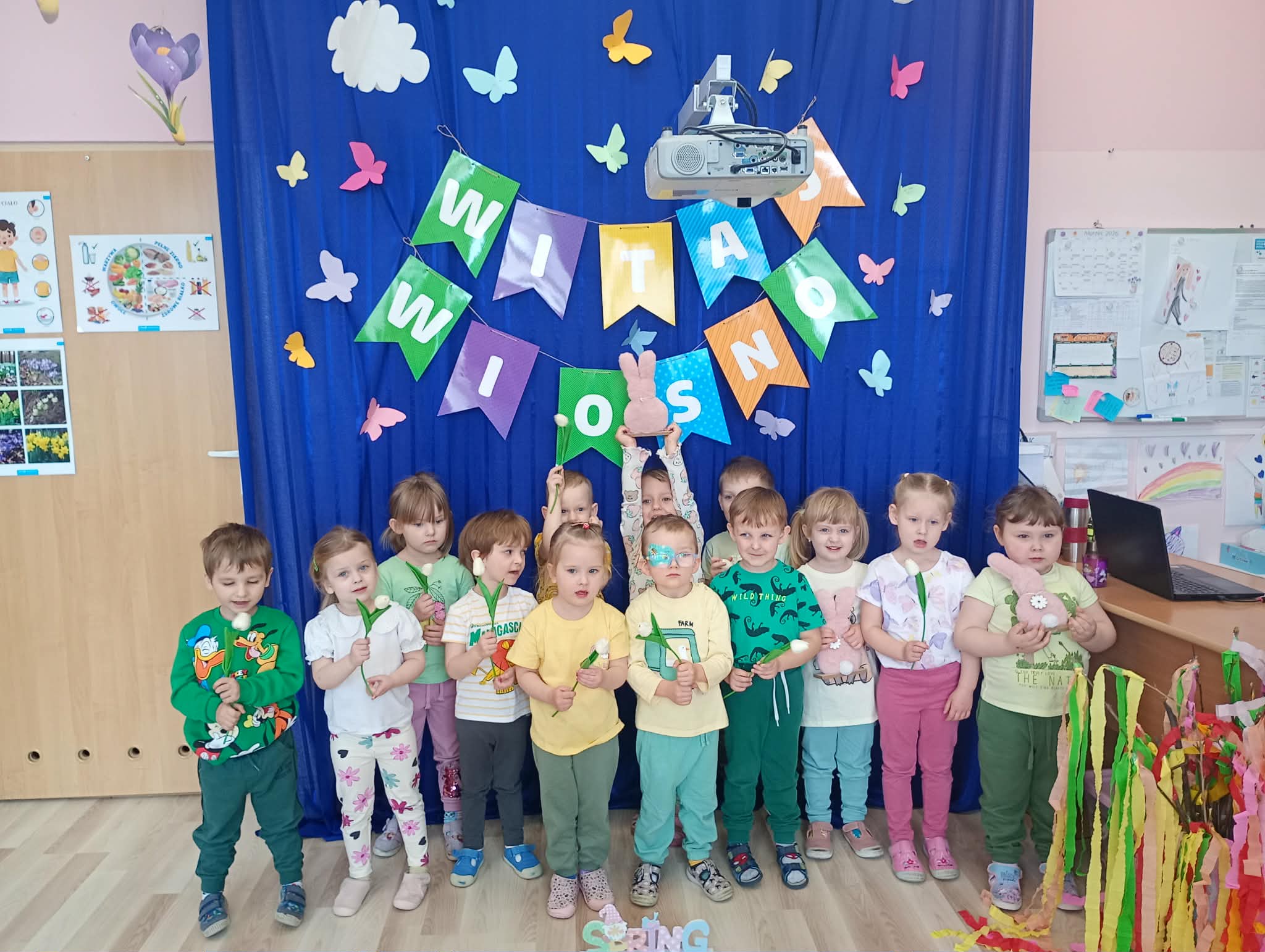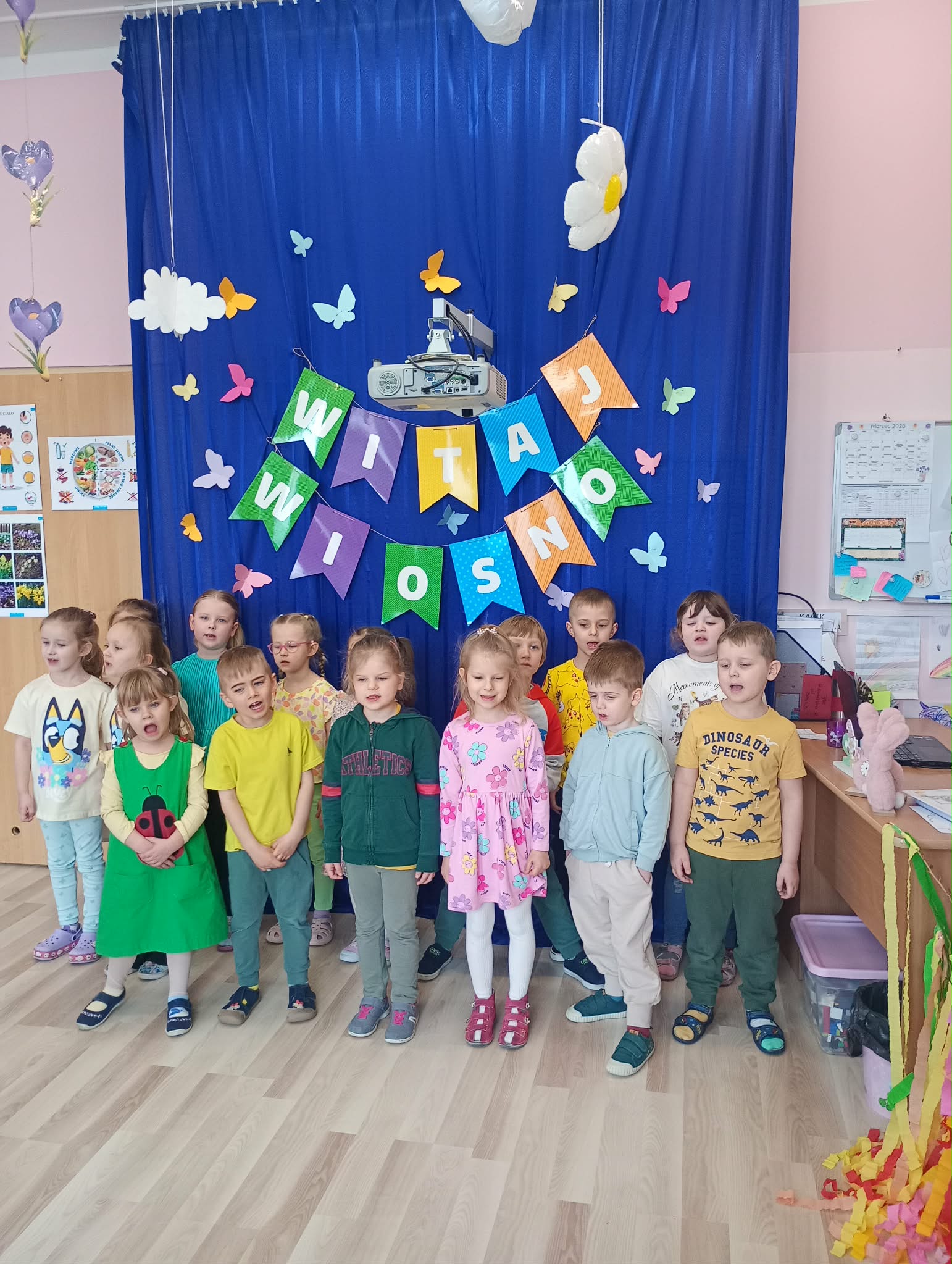 Przyszła do nas Pani Wiosna, taka piękna i radosna. Zasypała kwiatki w polu, a skowronek śpiewa w górze. Bocian biały już klekoce, dłuższe są już jasne noce. Zniknął śnieg, już nie ma mrozu, wiosna idzie bez przewozu!