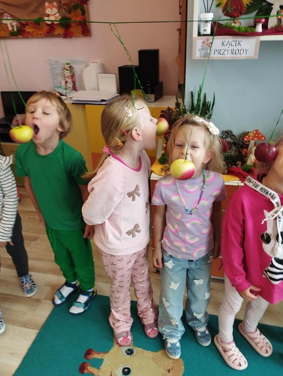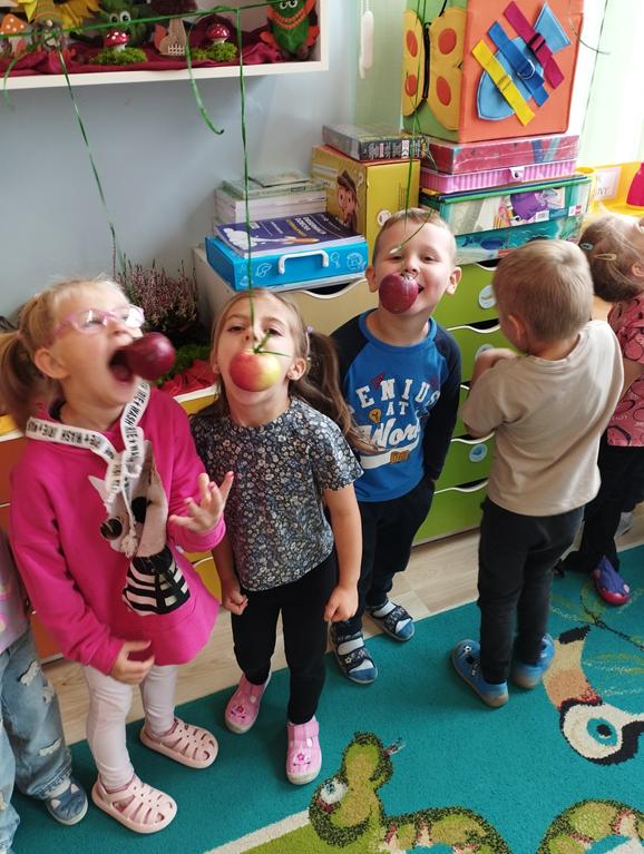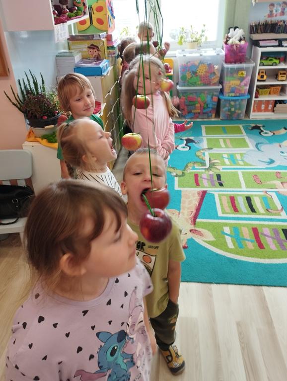 Dzieci poznały różne rodzaje jabłek, ich kolory, kształty i zapachy. Dzieci bawiły się w zjadanie jabłka bez użycia rączek :)
