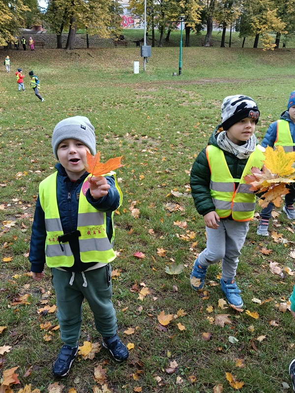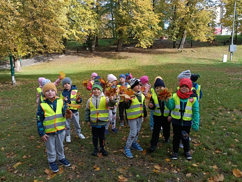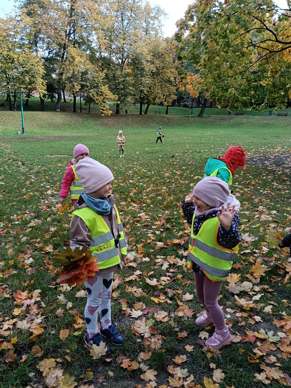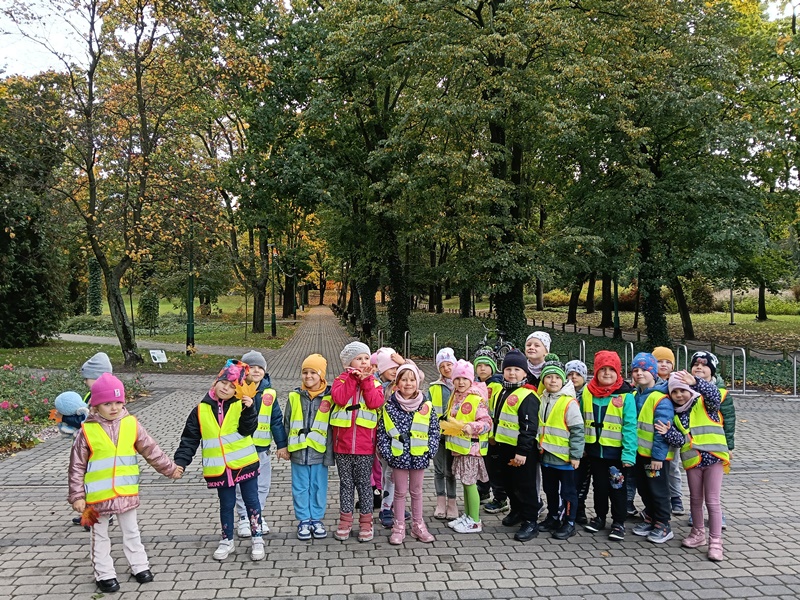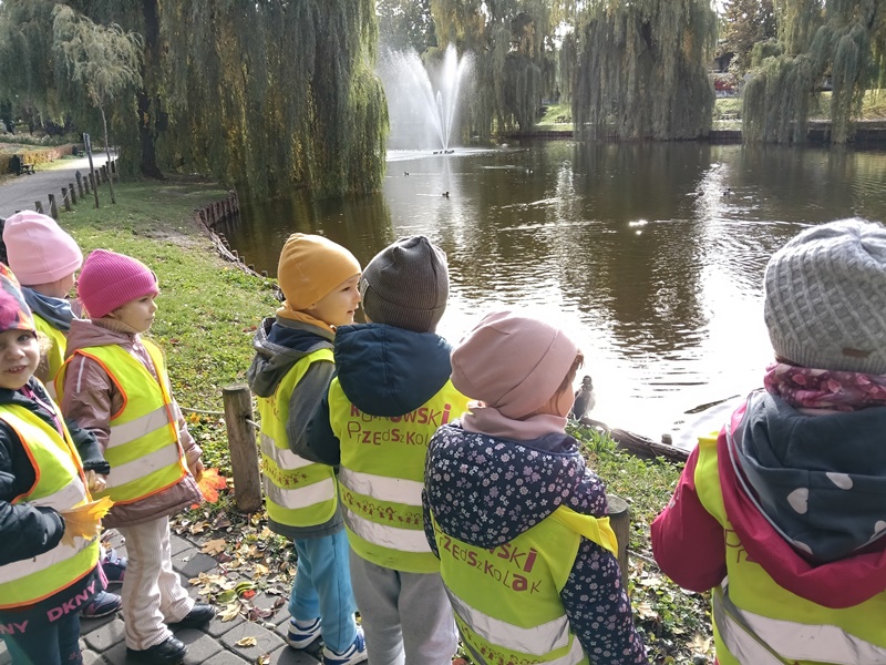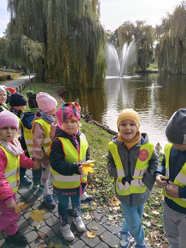 W Październiku przedszkolaki wybrały się na jesienny spacer do parku, gdzie zbierały kolorowe liście i rozmawiały o charakterystycznych cechach tej pory roku. Dzieci obserwowały zmiany w przyrodzie, słuchały szelestu liści pod stopami i podziwiały barwy drzew. Na zakończenie odwiedziły parkowy staw, przy którym z zaciekawieniem oglądały pływające kaczki.