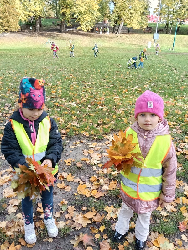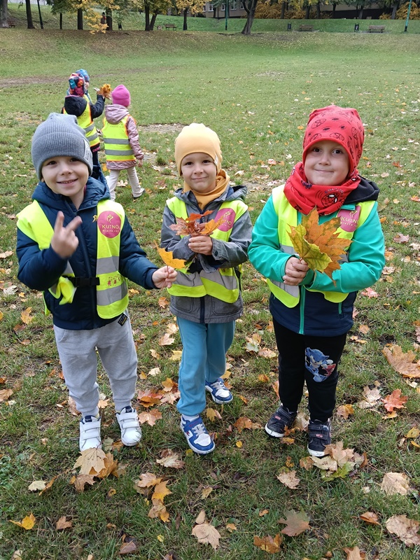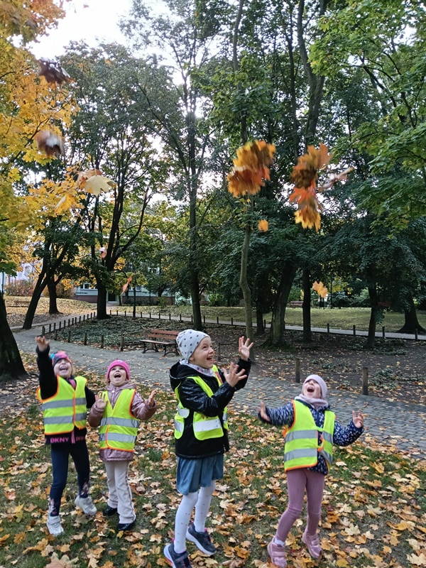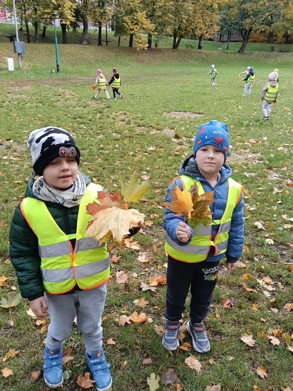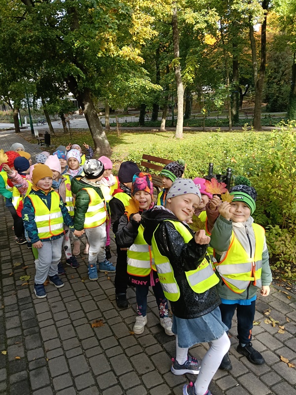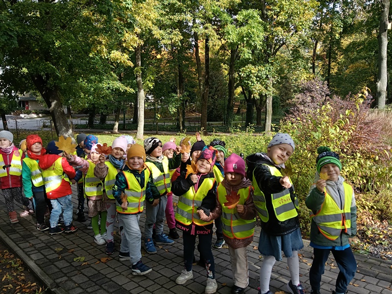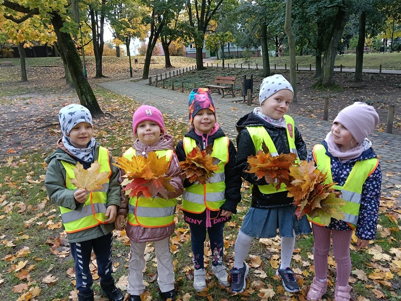 W Październiku przedszkolaki wybrały się na jesienny spacer do parku, gdzie zbierały kolorowe liście i rozmawiały o charakterystycznych cechach tej pory roku. Dzieci obserwowały zmiany w przyrodzie, słuchały szelestu liści pod stopami i podziwiały barwy drzew. Na zakończenie odwiedziły parkowy staw, przy którym z zaciekawieniem oglądały pływające kaczki.