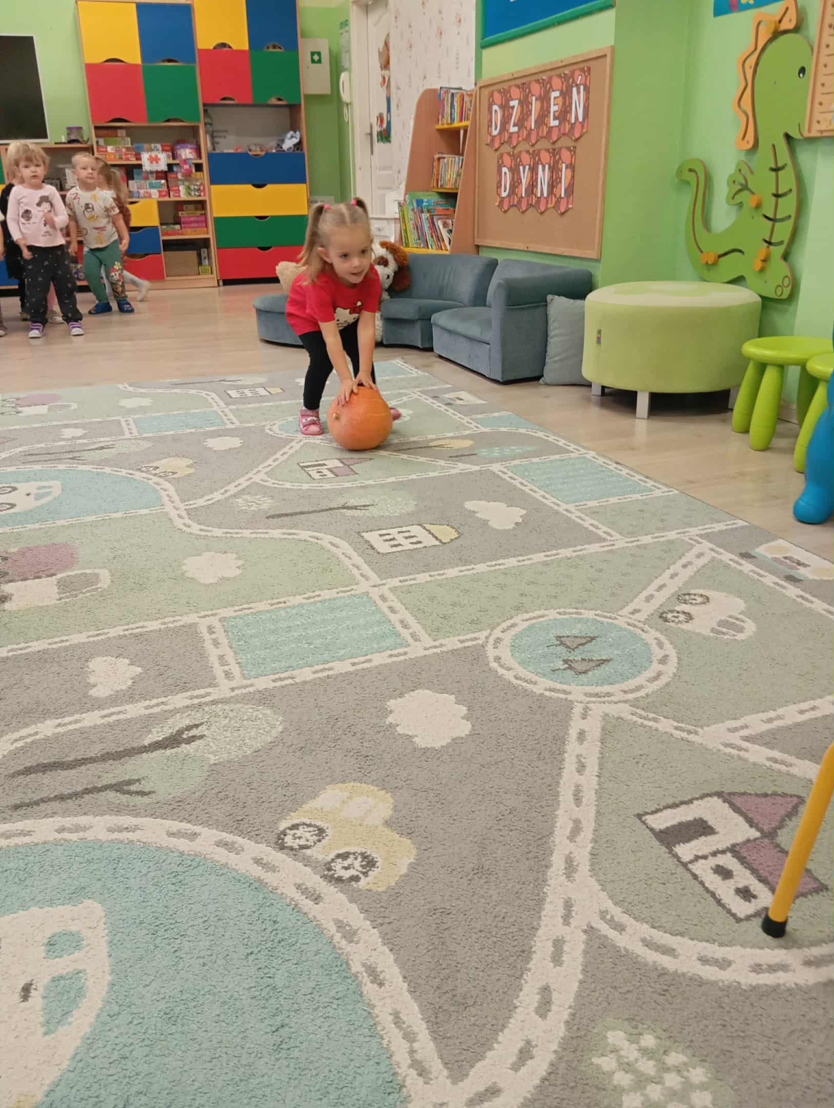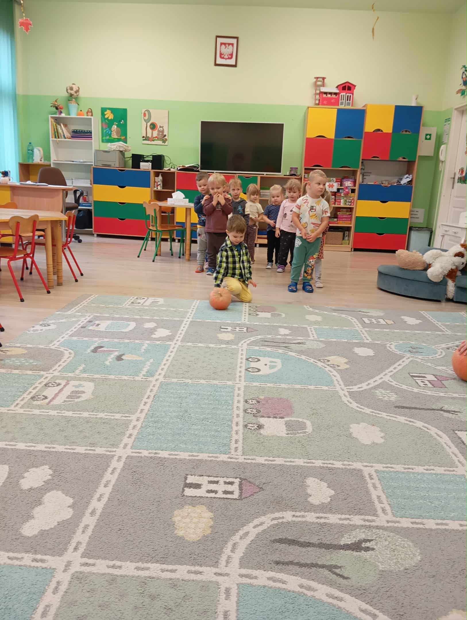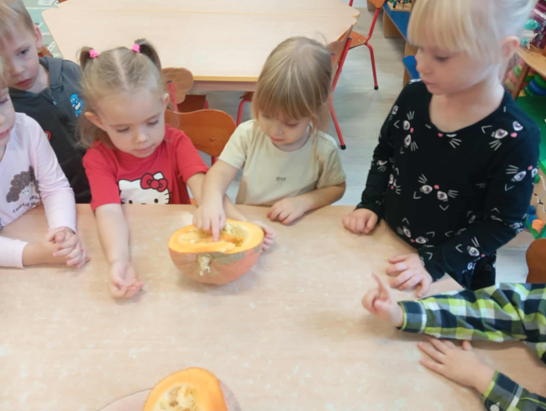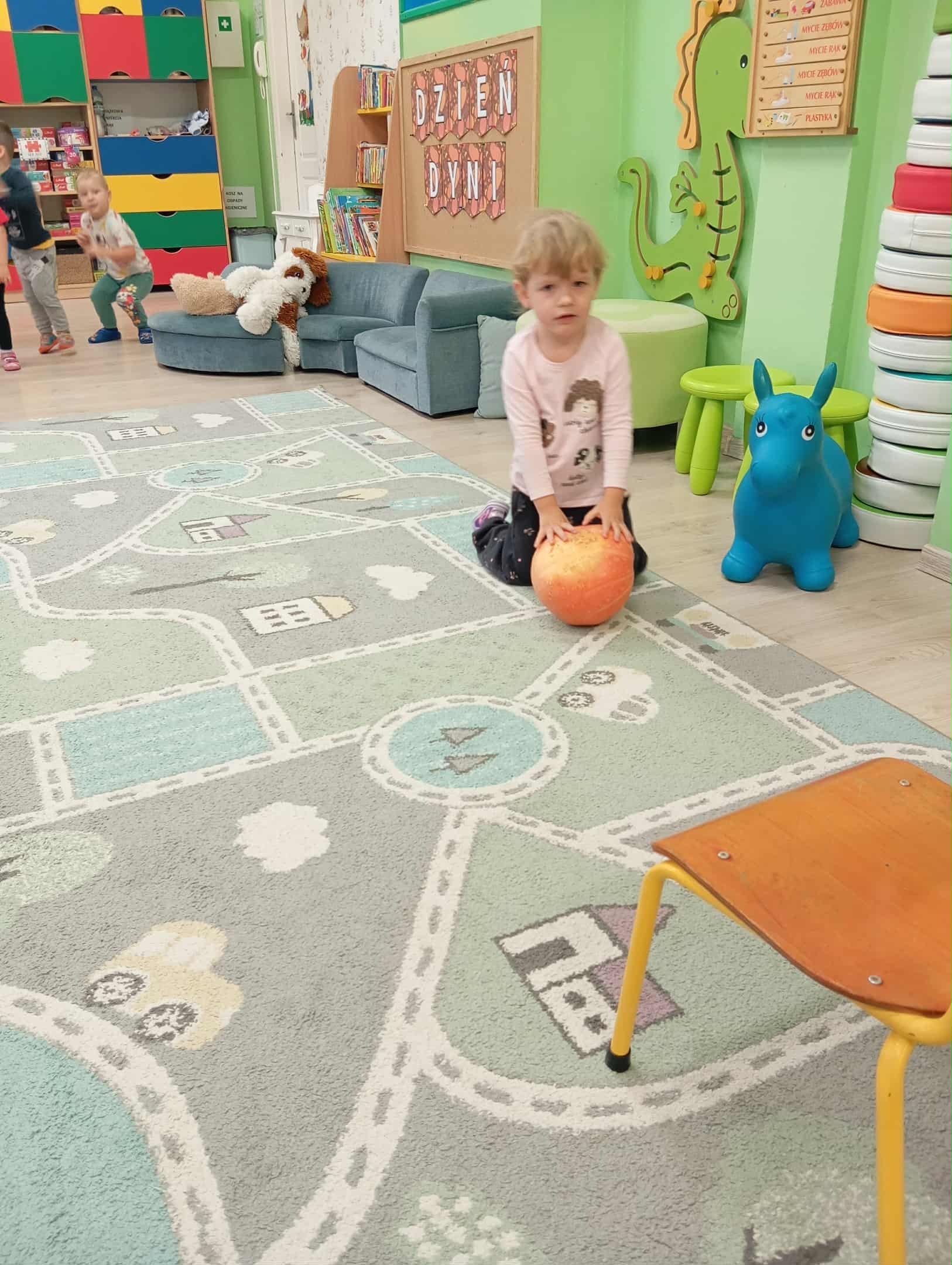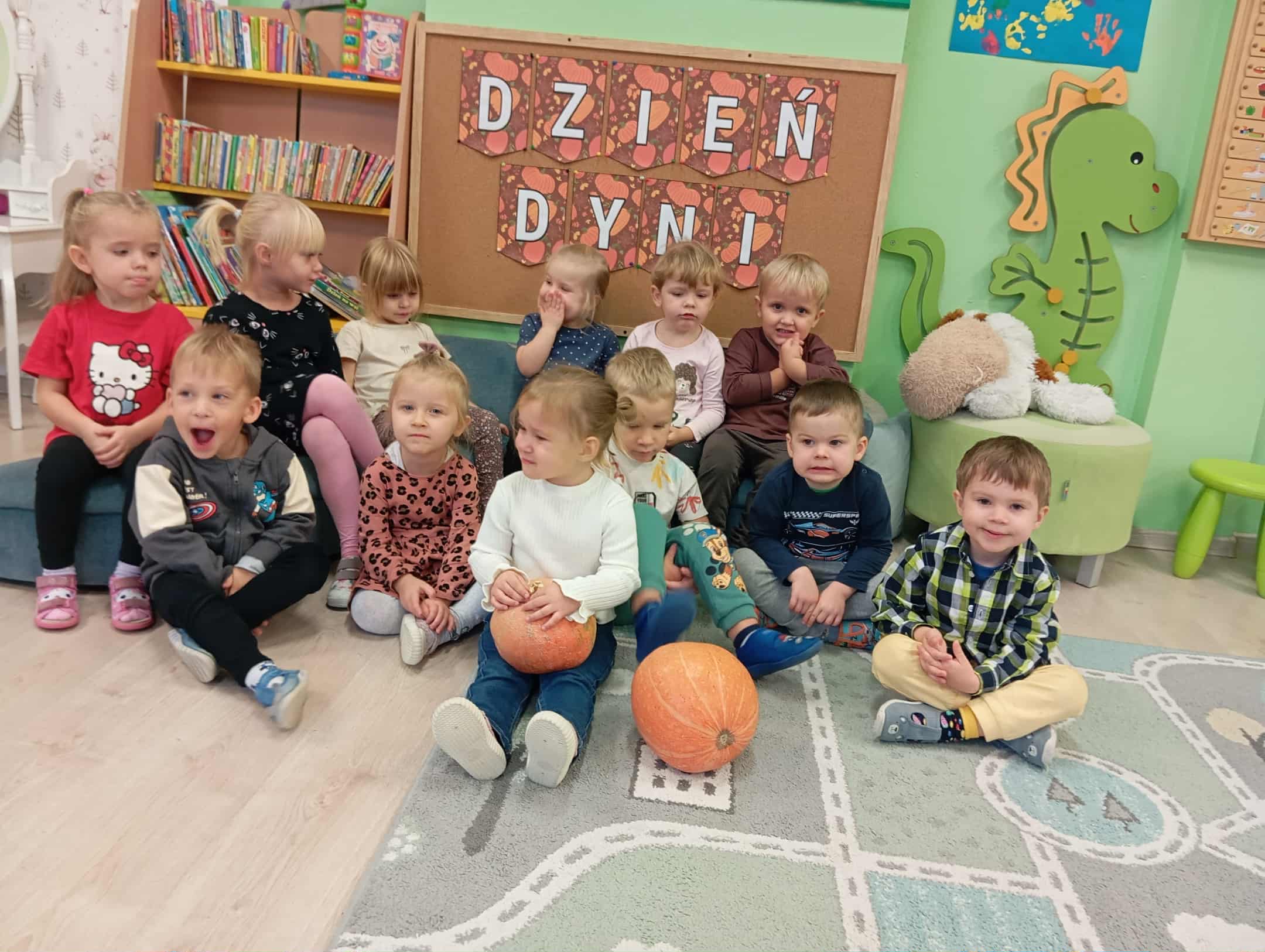 W naszym przedszkolu odbył się radosny „Dzień Dyni”, który wprowadził dzieci w jesienny nastrój pełen pomarańczowych barw i wesołej zabawy. Celem zajęć było rozwijanie spostrzegawczości, utrwalanie nazw kolorów oraz doskonalenie sprawności ruchowej poprzez zabawy tematyczne związane z dynią. Na początku dnia dzieci z zainteresowaniem obejrzały różne rodzaje dyń – małe, duże, gładkie i chropowate. Wspólnie określały ich kolory i kształty, a także porównywały zapach i ciężar. Przedszkolaki dowiedziały się, że dynia to nie tylko ozdoba jesieni, ale także zdrowe warzywo, z którego można przygotować pyszne potrawy. Podczas zabawy dydaktycznej „Dynia w kolorach” dzieci rozpoznawały i nazywały kolory, dopasowując papierowe dynie do odpowiednich barw – pomarańczowej, żółtej, zielonej czy niebieskiej. Zabawa wprowadziła dużo śmiechu i pozytywnej rywalizacji. Następnie odbyły się zabawy ruchowe: dzieci toczyły dynie po podłodze, pokonywały tor przeszkód z „dynią” w rękach, a także brały udział w zabawie „Tańczące dynie”, poruszając się do rytmu wesołej muzyki. W ten sposób ćwiczyły równowagę, koordynację ruchową i współpracę w grupie. Nie zabrakło także ćwiczeń spostrzegawczości – w zabawie „Znajdź dynię” dzieci wyszukiwały ukryte dynie lub różnice między ilustracjami przedstawiającymi dynie o odmiennych minach i kształtach. Na zakończenie dnia przedszkolaki wykonały własne prace plastyczne „Wesoła dynia”, tworząc pomarańczowe dynie malując farbami. Powstała piękna wystawa, która ozdobiła salę i przypominała o wspólnie spędzonym dniu pełnym zabawy i nauki.