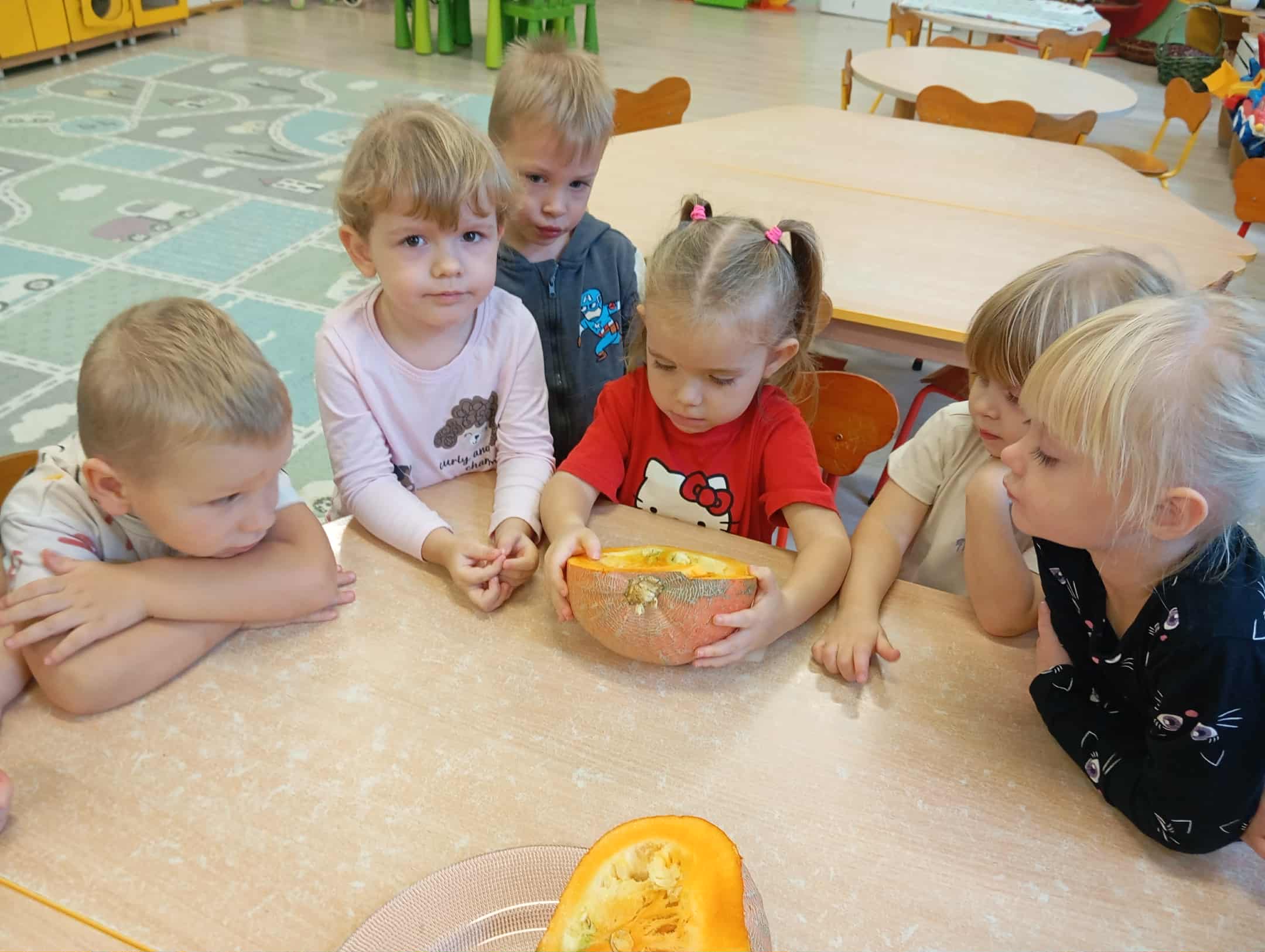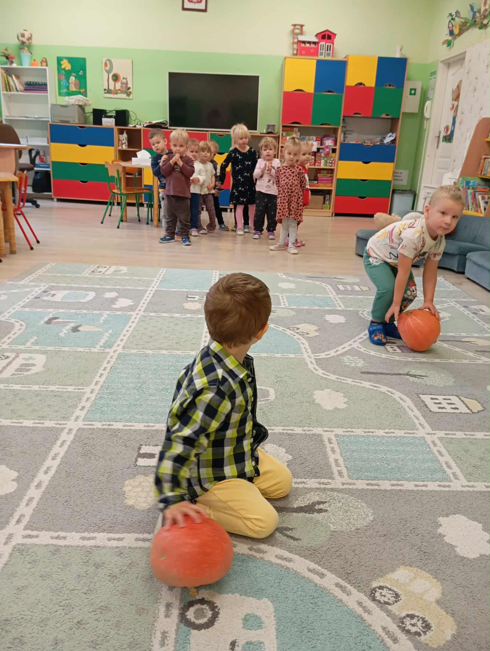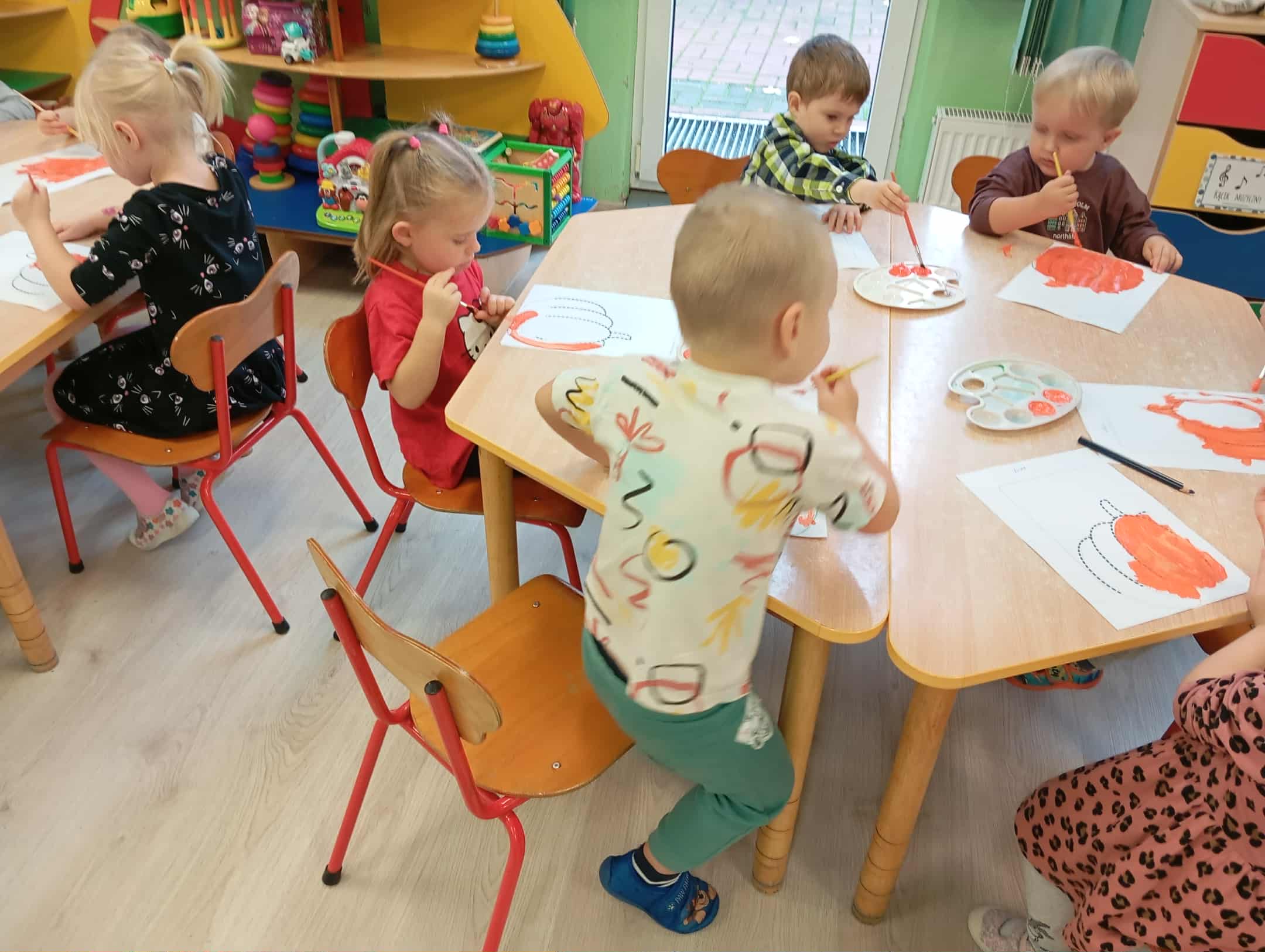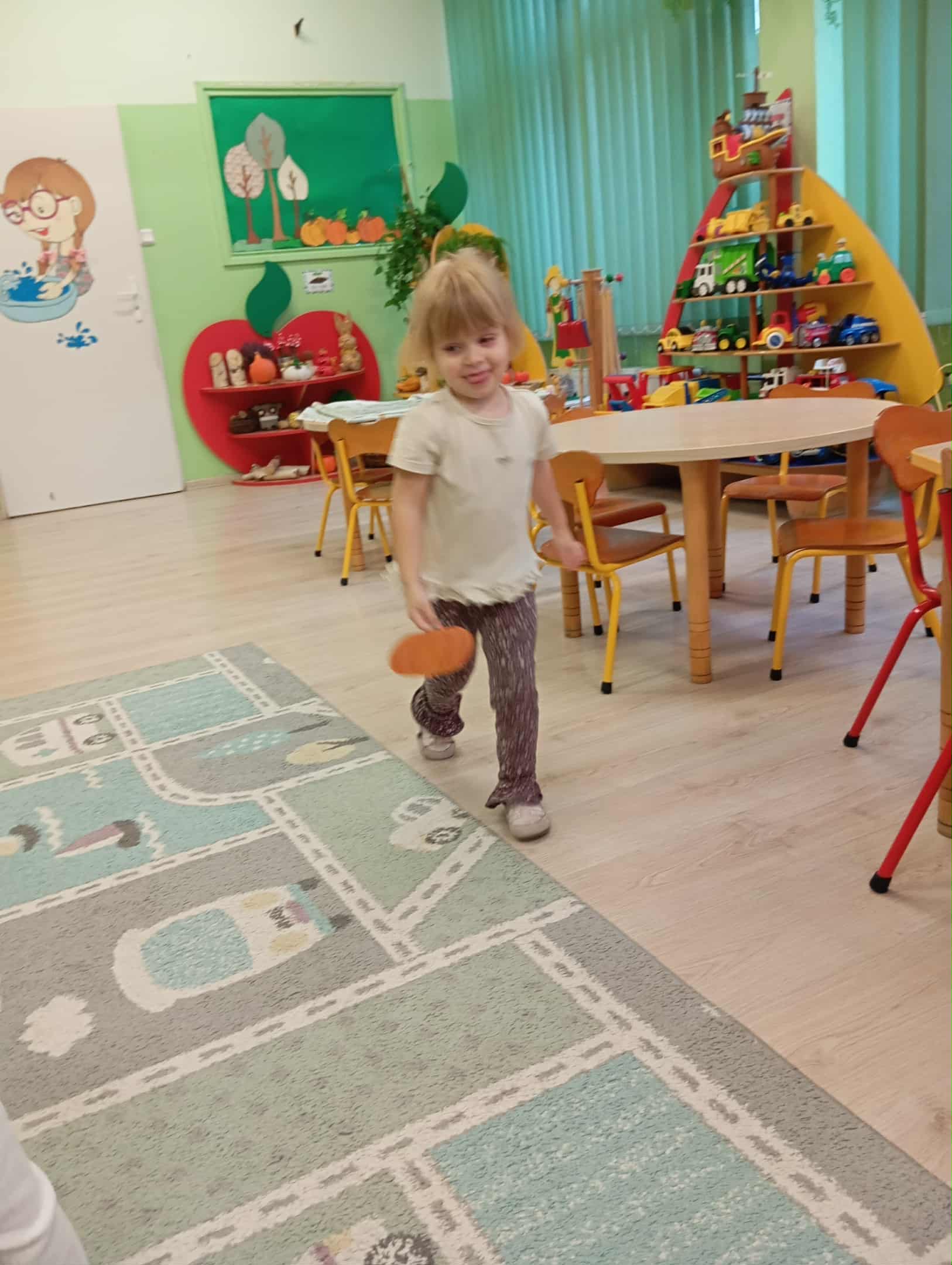 W naszym przedszkolu odbył się radosny „Dzień Dyni”, który wprowadził dzieci w jesienny nastrój pełen pomarańczowych barw i wesołej zabawy. Celem zajęć było rozwijanie spostrzegawczości, utrwalanie nazw kolorów oraz doskonalenie sprawności ruchowej poprzez zabawy tematyczne związane z dynią. Na początku dnia dzieci z zainteresowaniem obejrzały różne rodzaje dyń – małe, duże, gładkie i chropowate. Wspólnie określały ich kolory i kształty, a także porównywały zapach i ciężar. Przedszkolaki dowiedziały się, że dynia to nie tylko ozdoba jesieni, ale także zdrowe warzywo, z którego można przygotować pyszne potrawy. Podczas zabawy dydaktycznej „Dynia w kolorach” dzieci rozpoznawały i nazywały kolory, dopasowując papierowe dynie do odpowiednich barw – pomarańczowej, żółtej, zielonej czy niebieskiej. Zabawa wprowadziła dużo śmiechu i pozytywnej rywalizacji. Następnie odbyły się zabawy ruchowe: dzieci toczyły dynie po podłodze, pokonywały tor przeszkód z „dynią” w rękach, a także brały udział w zabawie „Tańczące dynie”, poruszając się do rytmu wesołej muzyki. W ten sposób ćwiczyły równowagę, koordynację ruchową i współpracę w grupie. Nie zabrakło także ćwiczeń spostrzegawczości – w zabawie „Znajdź dynię” dzieci wyszukiwały ukryte dynie lub różnice między ilustracjami przedstawiającymi dynie o odmiennych minach i kształtach. Na zakończenie dnia przedszkolaki wykonały własne prace plastyczne „Wesoła dynia”, tworząc pomarańczowe dynie malując farbami. Powstała piękna wystawa, która ozdobiła salę i przypominała o wspólnie spędzonym dniu pełnym zabawy i nauki.