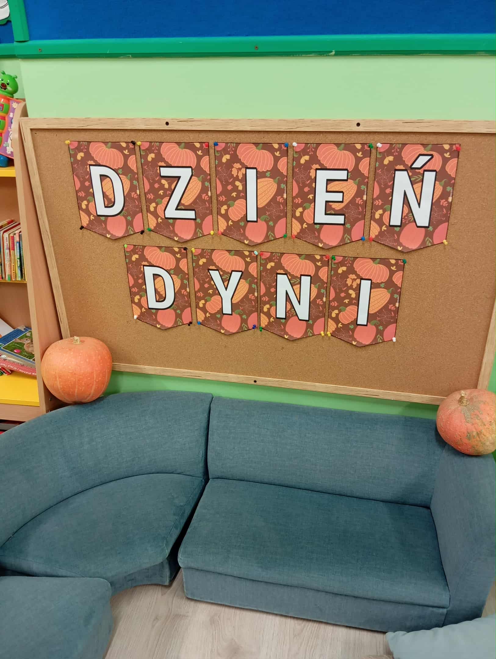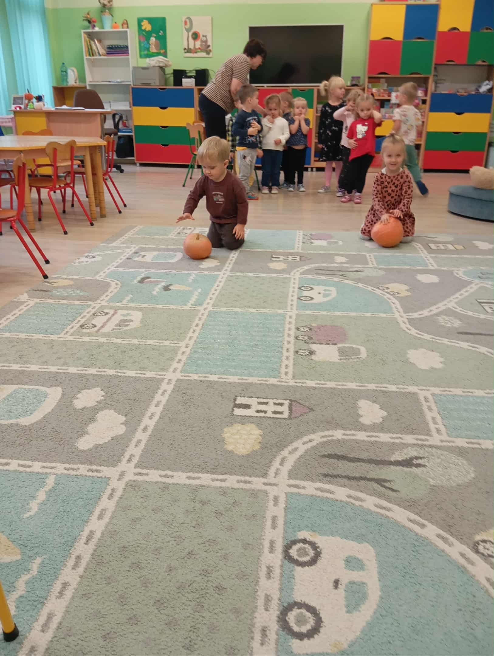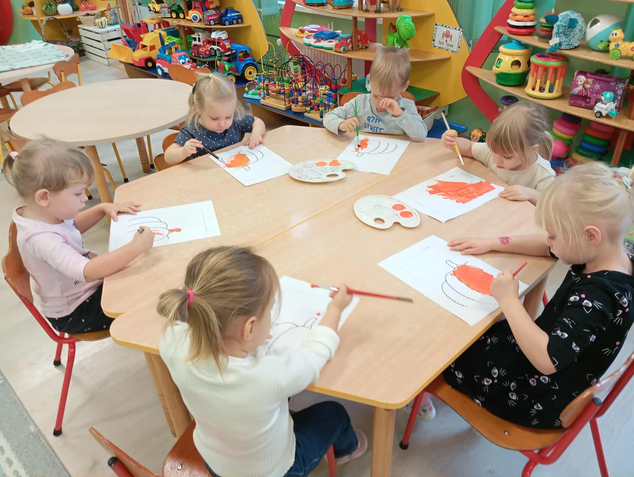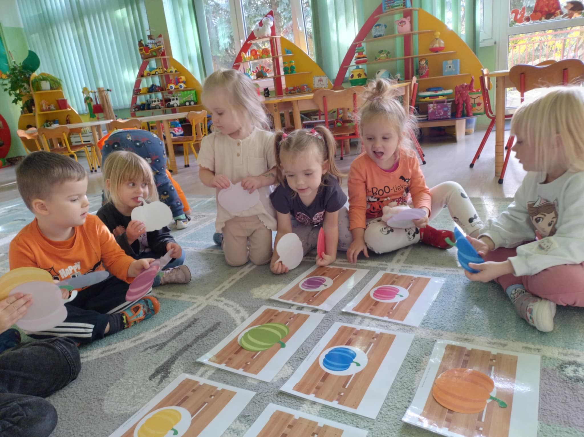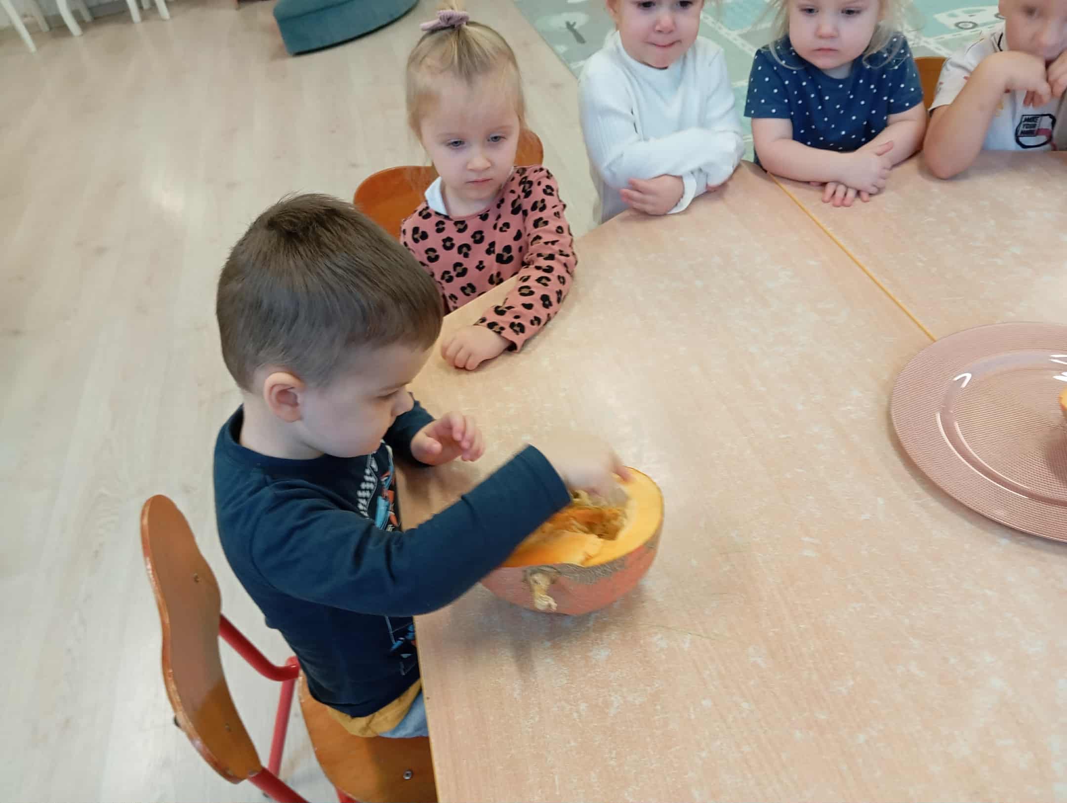 W naszym przedszkolu odbył się radosny „Dzień Dyni”, który wprowadził dzieci w jesienny nastrój pełen pomarańczowych barw i wesołej zabawy. Celem zajęć było rozwijanie spostrzegawczości, utrwalanie nazw kolorów oraz doskonalenie sprawności ruchowej poprzez zabawy tematyczne związane z dynią. Na początku dnia dzieci z zainteresowaniem obejrzały różne rodzaje dyń – małe, duże, gładkie i chropowate. Wspólnie określały ich kolory i kształty, a także porównywały zapach i ciężar. Przedszkolaki dowiedziały się, że dynia to nie tylko ozdoba jesieni, ale także zdrowe warzywo, z którego można przygotować pyszne potrawy. Podczas zabawy dydaktycznej „Dynia w kolorach” dzieci rozpoznawały i nazywały kolory, dopasowując papierowe dynie do odpowiednich barw – pomarańczowej, żółtej, zielonej czy niebieskiej. Zabawa wprowadziła dużo śmiechu i pozytywnej rywalizacji. Następnie odbyły się zabawy ruchowe: dzieci toczyły dynie po podłodze, pokonywały tor przeszkód z „dynią” w rękach, a także brały udział w zabawie „Tańczące dynie”, poruszając się do rytmu wesołej muzyki. W ten sposób ćwiczyły równowagę, koordynację ruchową i współpracę w grupie. Nie zabrakło także ćwiczeń spostrzegawczości – w zabawie „Znajdź dynię” dzieci wyszukiwały ukryte dynie lub różnice między ilustracjami przedstawiającymi dynie o odmiennych minach i kształtach. Na zakończenie dnia przedszkolaki wykonały własne prace plastyczne „Wesoła dynia”, tworząc pomarańczowe dynie malując farbami. Powstała piękna wystawa, która ozdobiła salę i przypominała o wspólnie spędzonym dniu pełnym zabawy i nauki.