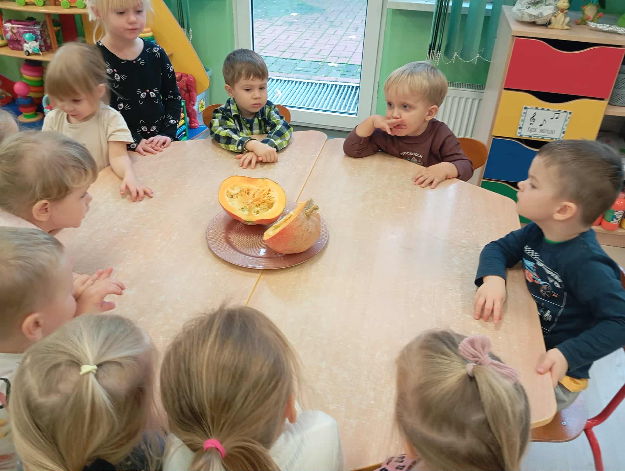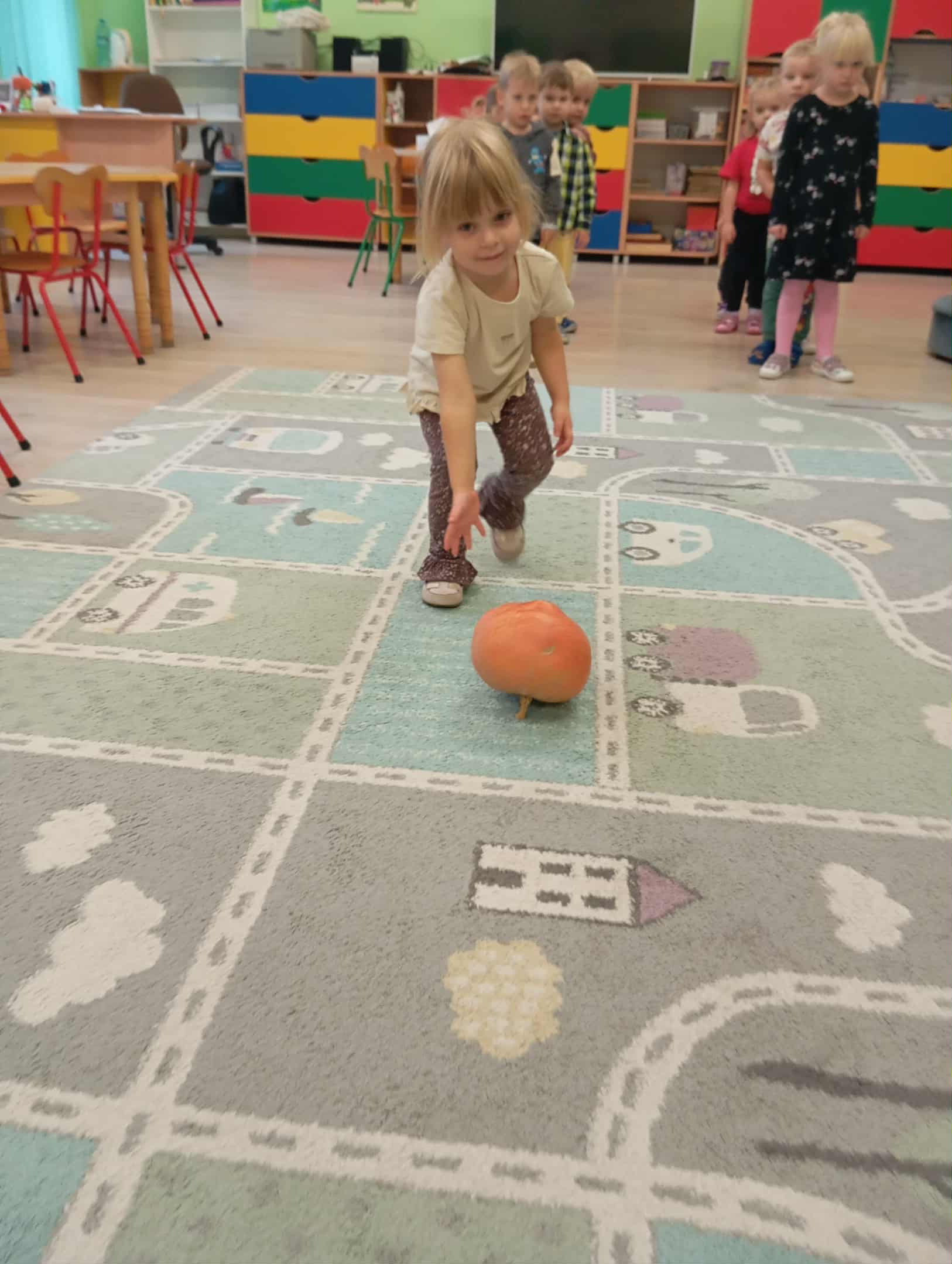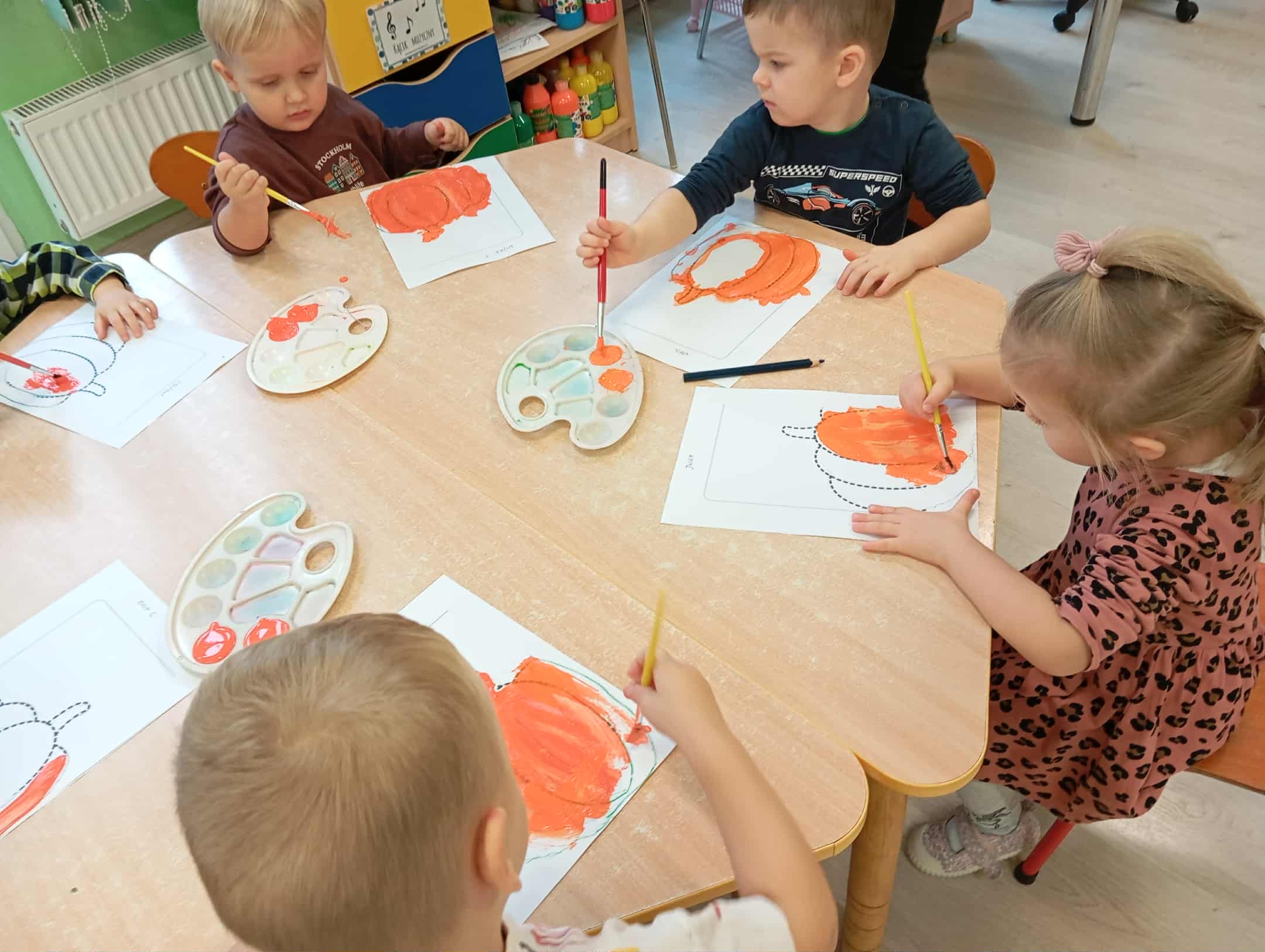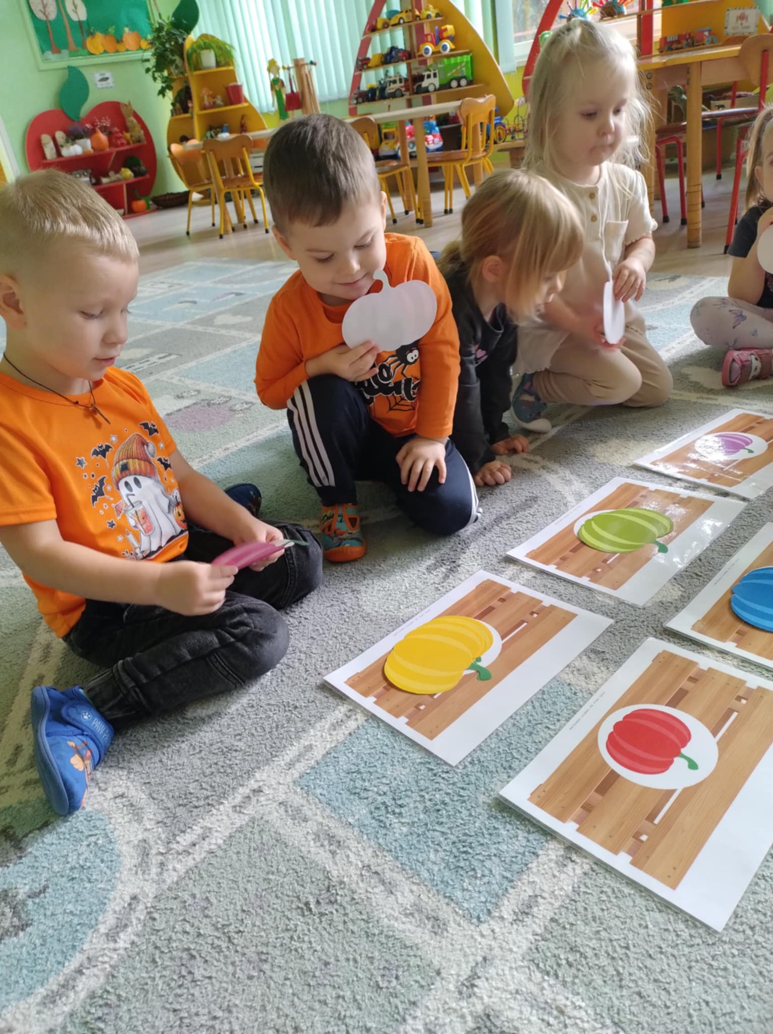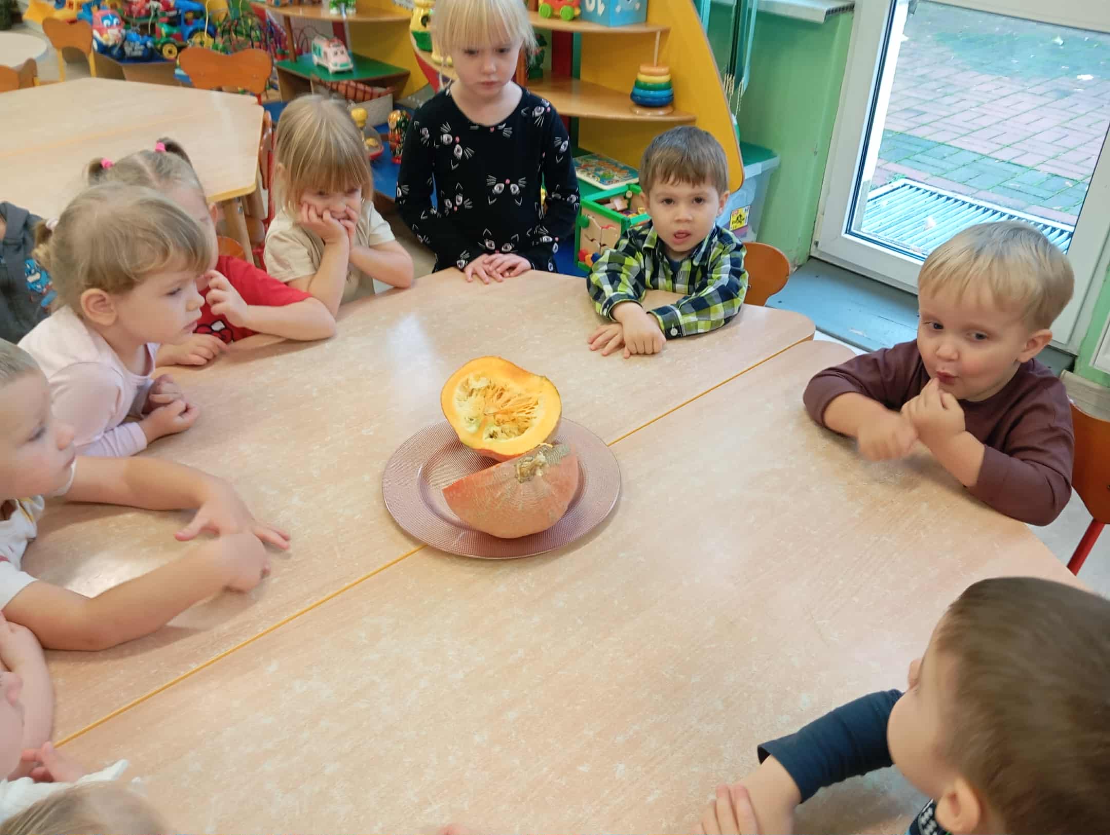 W naszym przedszkolu odbył się radosny „Dzień Dyni”, który wprowadził dzieci w jesienny nastrój pełen pomarańczowych barw i wesołej zabawy. Celem zajęć było rozwijanie spostrzegawczości, utrwalanie nazw kolorów oraz doskonalenie sprawności ruchowej poprzez zabawy tematyczne związane z dynią. Na początku dnia dzieci z zainteresowaniem obejrzały różne rodzaje dyń – małe, duże, gładkie i chropowate. Wspólnie określały ich kolory i kształty, a także porównywały zapach i ciężar. Przedszkolaki dowiedziały się, że dynia to nie tylko ozdoba jesieni, ale także zdrowe warzywo, z którego można przygotować pyszne potrawy. Podczas zabawy dydaktycznej „Dynia w kolorach” dzieci rozpoznawały i nazywały kolory, dopasowując papierowe dynie do odpowiednich barw – pomarańczowej, żółtej, zielonej czy niebieskiej. Zabawa wprowadziła dużo śmiechu i pozytywnej rywalizacji. Następnie odbyły się zabawy ruchowe: dzieci toczyły dynie po podłodze, pokonywały tor przeszkód z „dynią” w rękach, a także brały udział w zabawie „Tańczące dynie”, poruszając się do rytmu wesołej muzyki. W ten sposób ćwiczyły równowagę, koordynację ruchową i współpracę w grupie. Nie zabrakło także ćwiczeń spostrzegawczości – w zabawie „Znajdź dynię” dzieci wyszukiwały ukryte dynie lub różnice między ilustracjami przedstawiającymi dynie o odmiennych minach i kształtach. Na zakończenie dnia przedszkolaki wykonały własne prace plastyczne „Wesoła dynia”, tworząc pomarańczowe dynie malując farbami. Powstała piękna wystawa, która ozdobiła salę i przypominała o wspólnie spędzonym dniu pełnym zabawy i nauki.