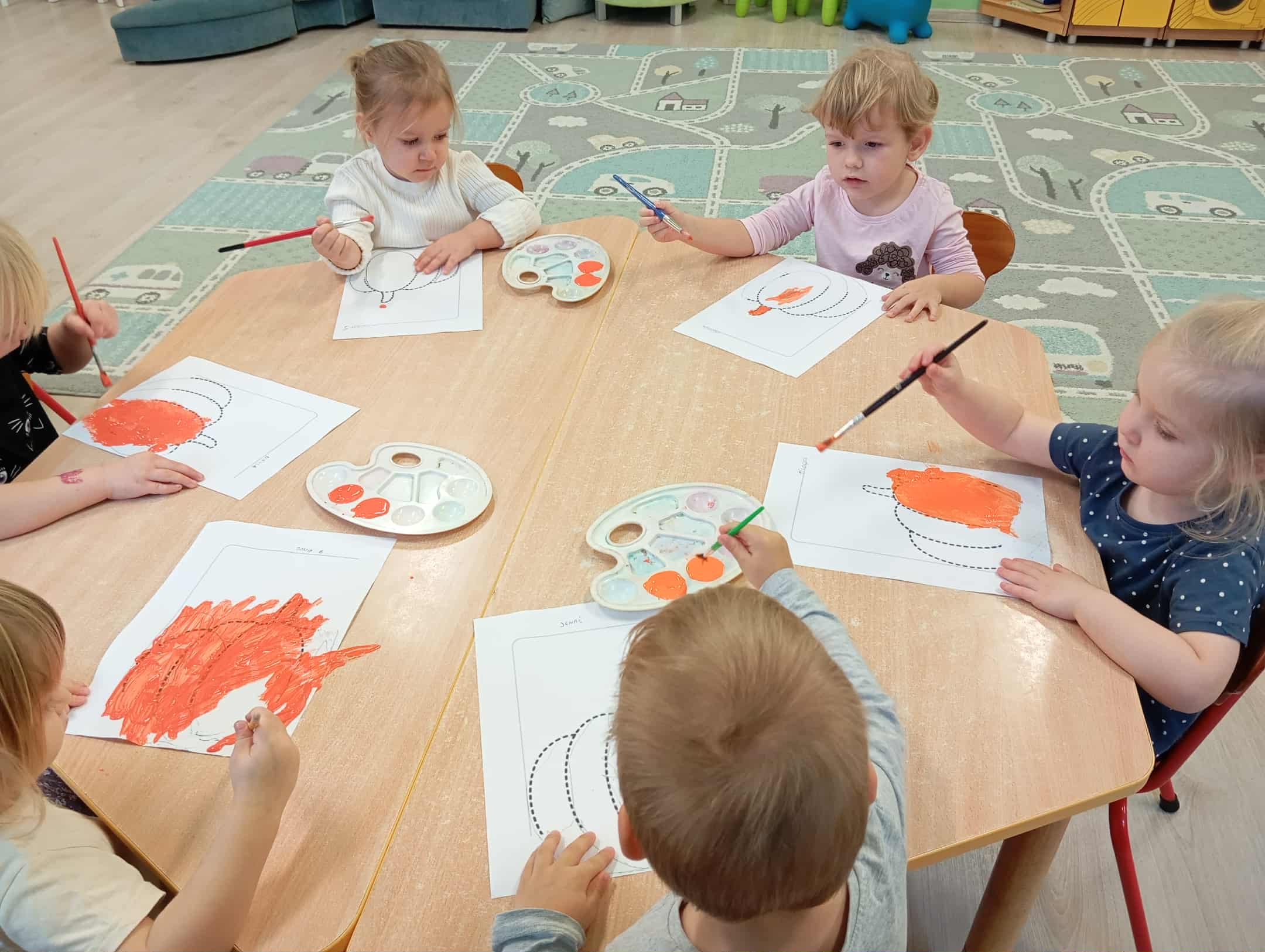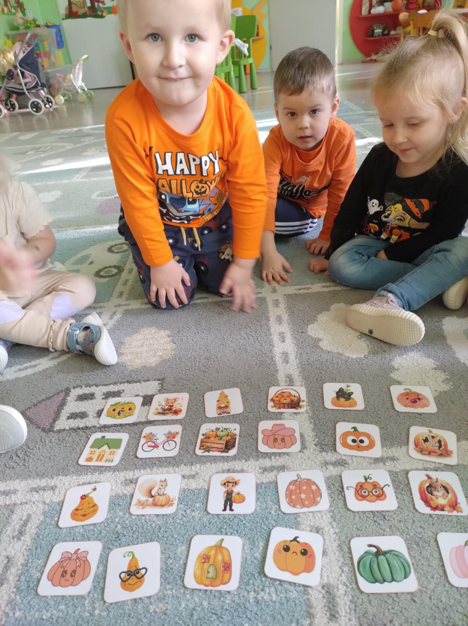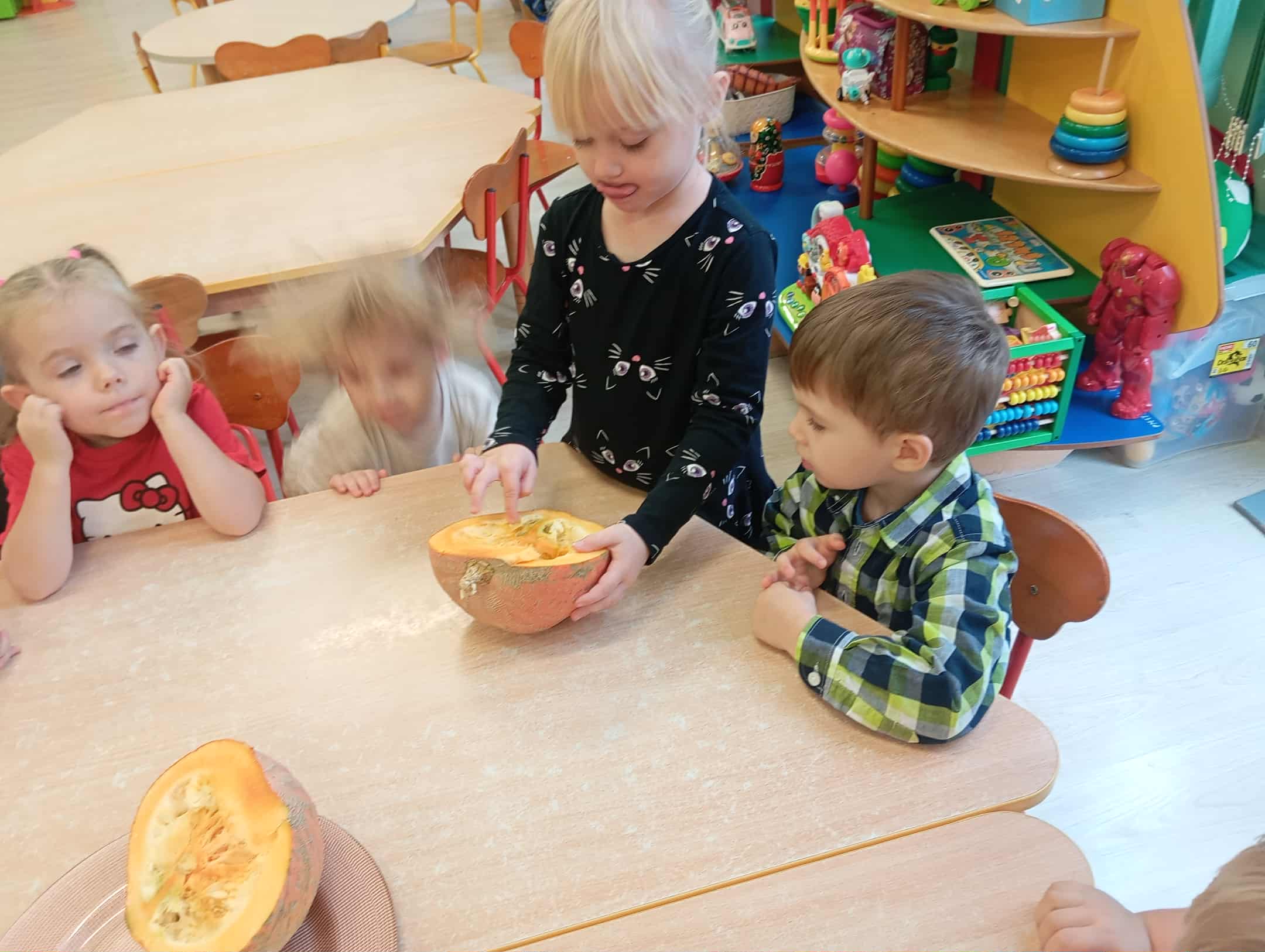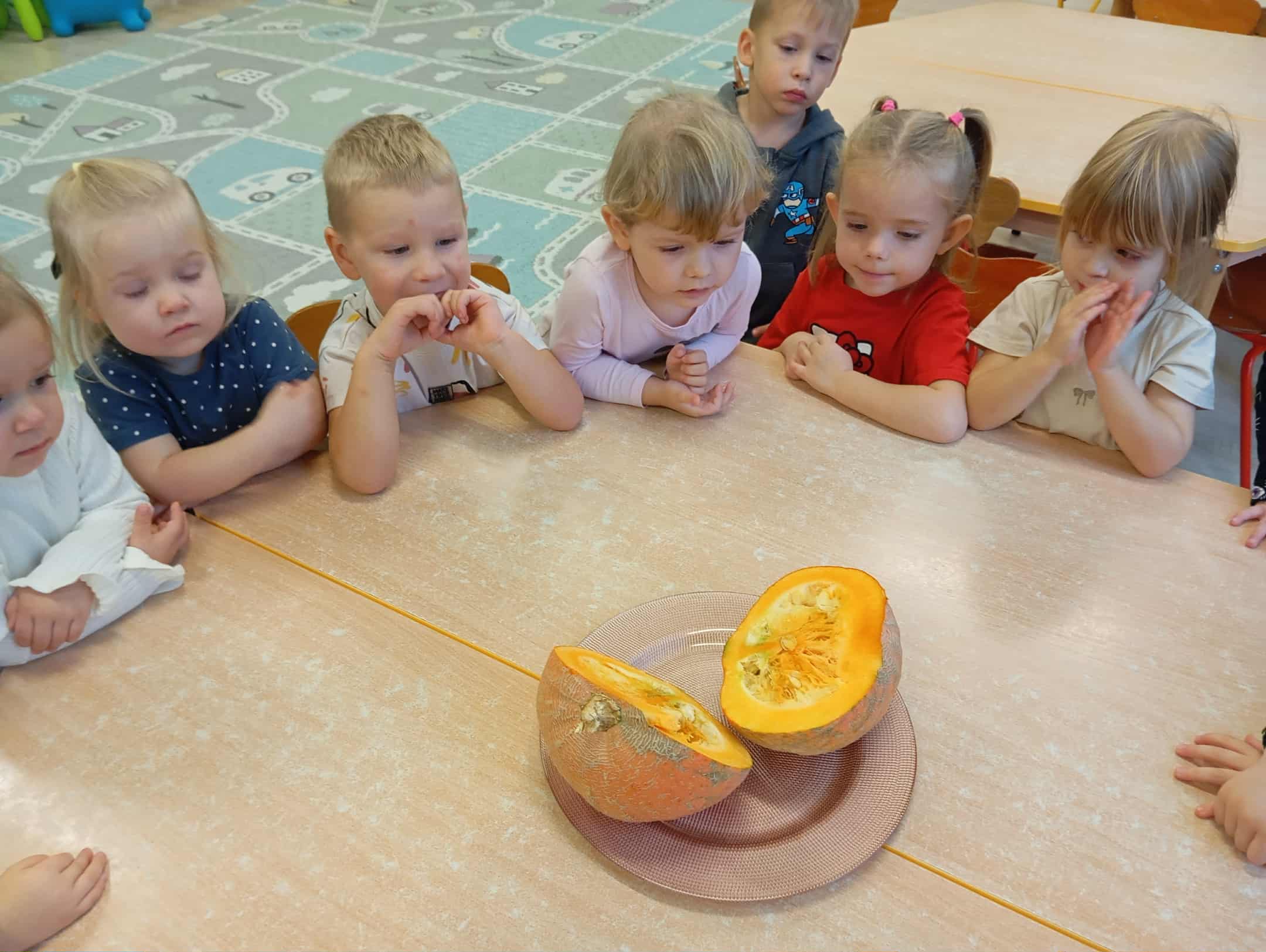 W naszym przedszkolu odbył się radosny „Dzień Dyni”, który wprowadził dzieci w jesienny nastrój pełen pomarańczowych barw i wesołej zabawy. Celem zajęć było rozwijanie spostrzegawczości, utrwalanie nazw kolorów oraz doskonalenie sprawności ruchowej poprzez zabawy tematyczne związane z dynią. Na początku dnia dzieci z zainteresowaniem obejrzały różne rodzaje dyń – małe, duże, gładkie i chropowate. Wspólnie określały ich kolory i kształty, a także porównywały zapach i ciężar. Przedszkolaki dowiedziały się, że dynia to nie tylko ozdoba jesieni, ale także zdrowe warzywo, z którego można przygotować pyszne potrawy. Podczas zabawy dydaktycznej „Dynia w kolorach” dzieci rozpoznawały i nazywały kolory, dopasowując papierowe dynie do odpowiednich barw – pomarańczowej, żółtej, zielonej czy niebieskiej. Zabawa wprowadziła dużo śmiechu i pozytywnej rywalizacji. Następnie odbyły się zabawy ruchowe: dzieci toczyły dynie po podłodze, pokonywały tor przeszkód z „dynią” w rękach, a także brały udział w zabawie „Tańczące dynie”, poruszając się do rytmu wesołej muzyki. W ten sposób ćwiczyły równowagę, koordynację ruchową i współpracę w grupie. Nie zabrakło także ćwiczeń spostrzegawczości – w zabawie „Znajdź dynię” dzieci wyszukiwały ukryte dynie lub różnice między ilustracjami przedstawiającymi dynie o odmiennych minach i kształtach. Na zakończenie dnia przedszkolaki wykonały własne prace plastyczne „Wesoła dynia”, tworząc pomarańczowe dynie malując farbami. Powstała piękna wystawa, która ozdobiła salę i przypominała o wspólnie spędzonym dniu pełnym zabawy i nauki.