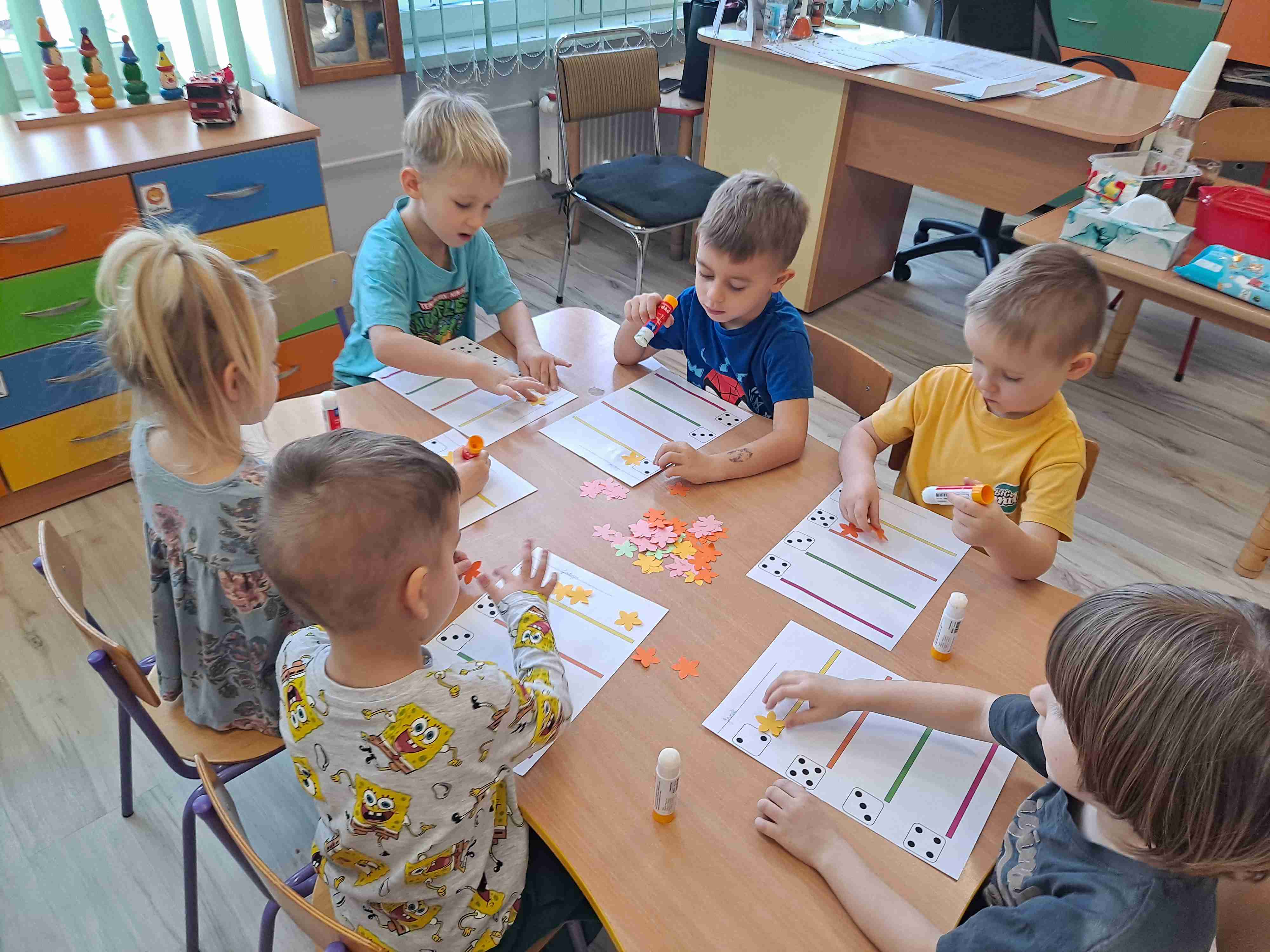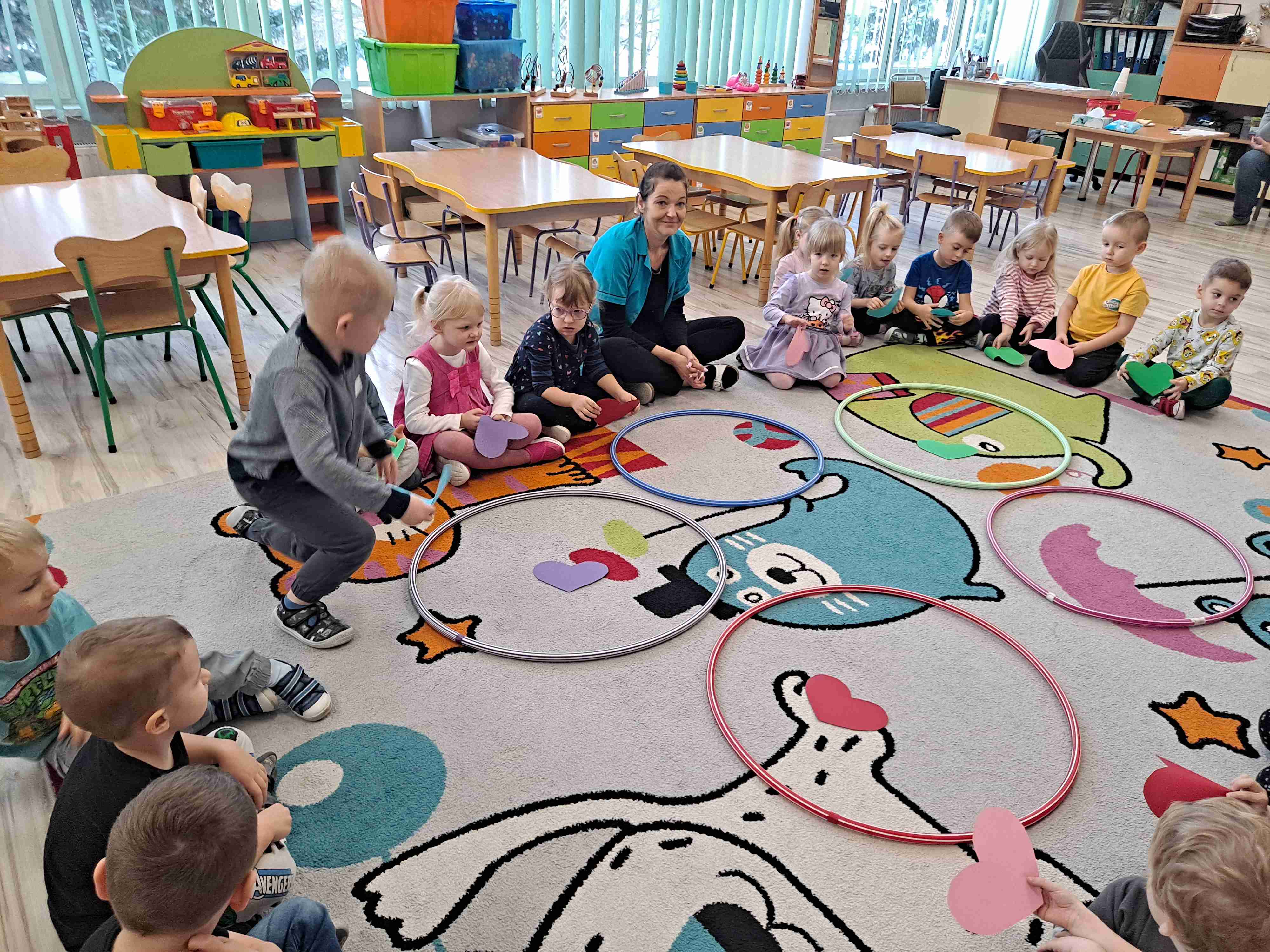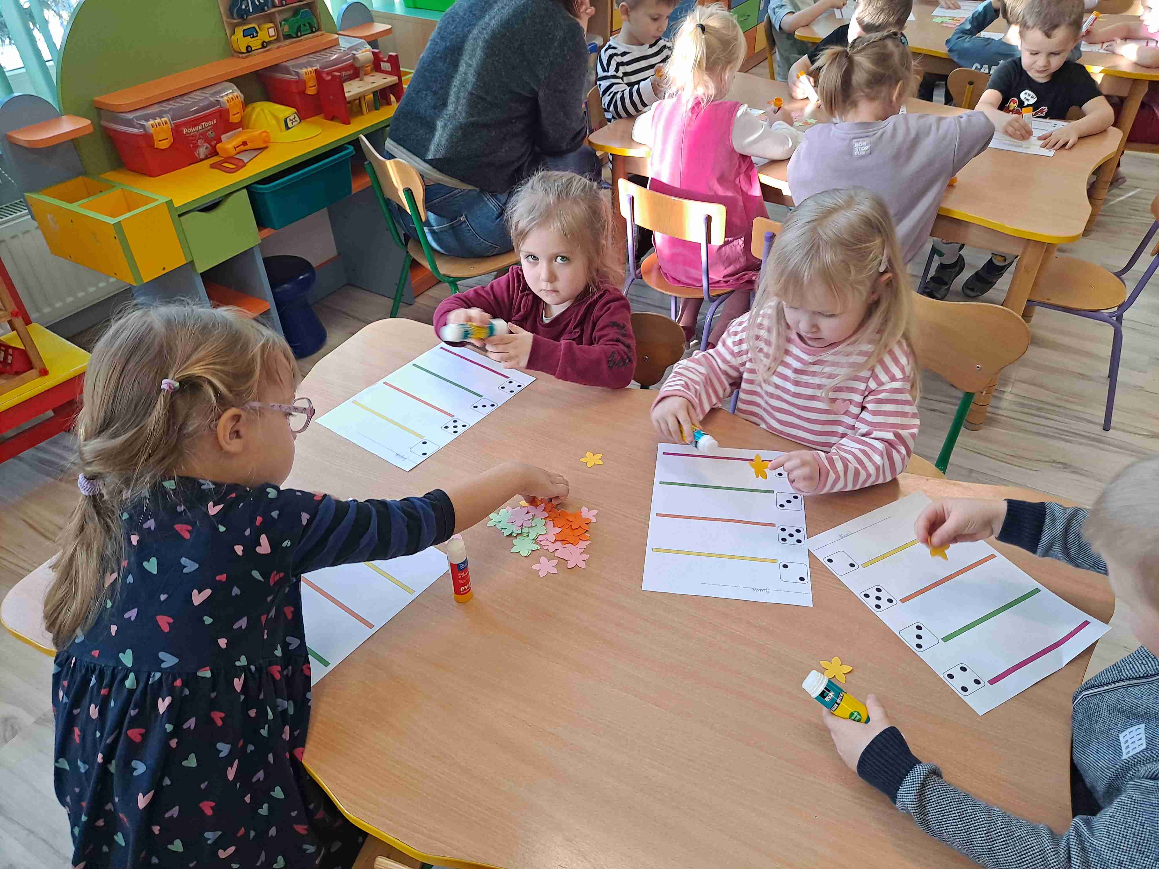 Kolejnym etapem zajęć była praca przy stolikach z kartą pracy. Zadaniem dzieci było pokolorowanie odpowiedniej liczby serduszek, zgodnie z poleceniem.