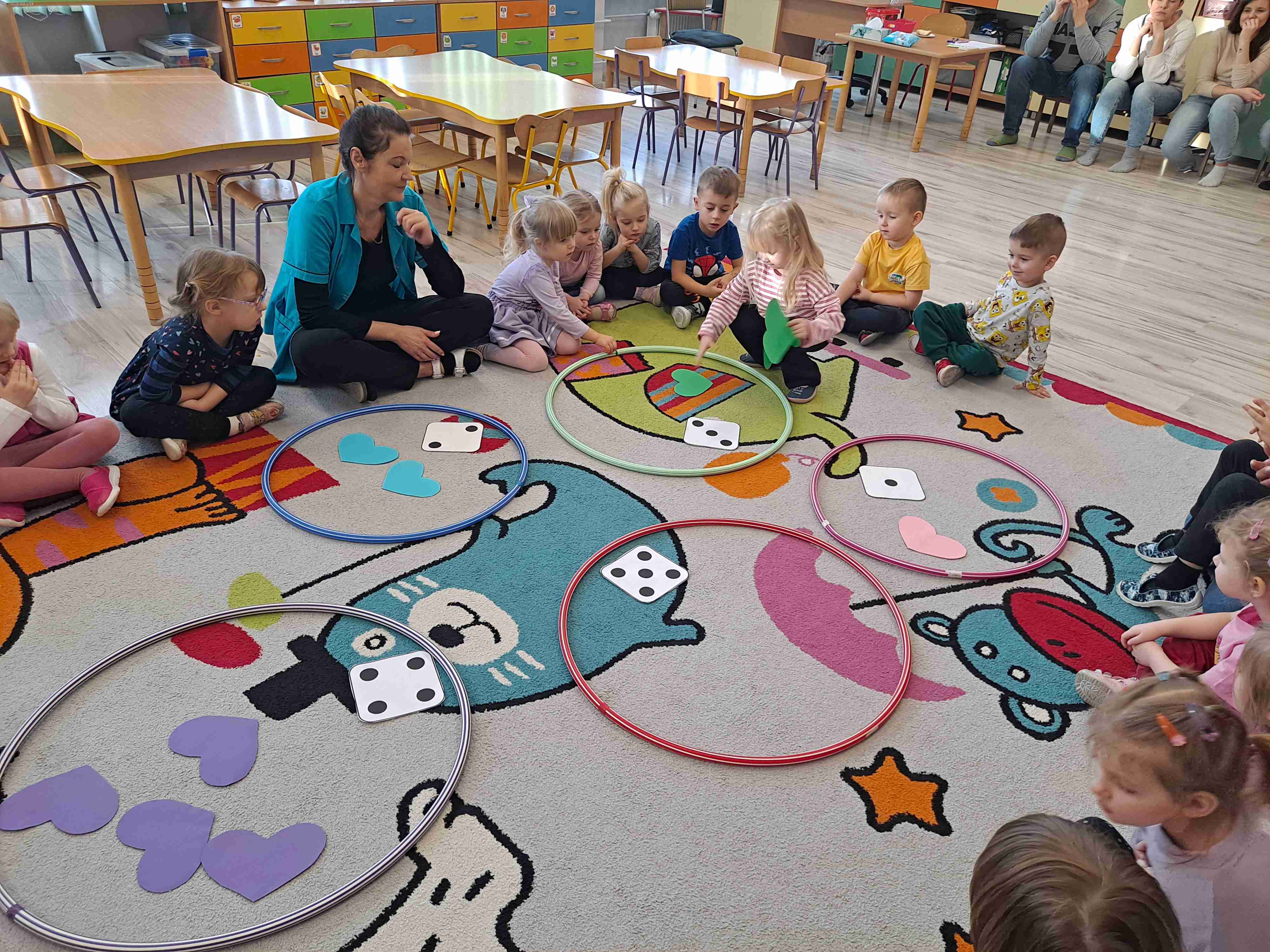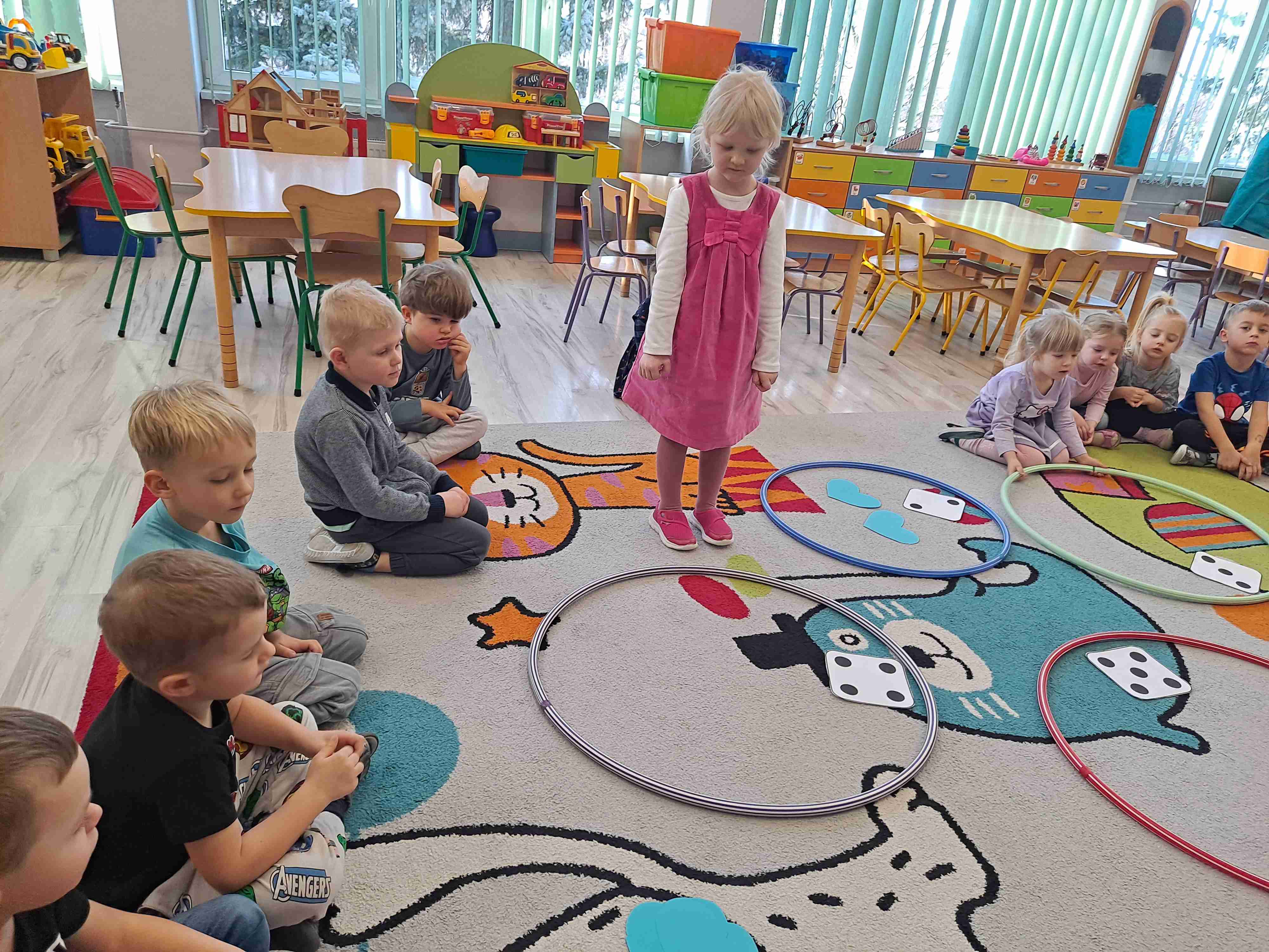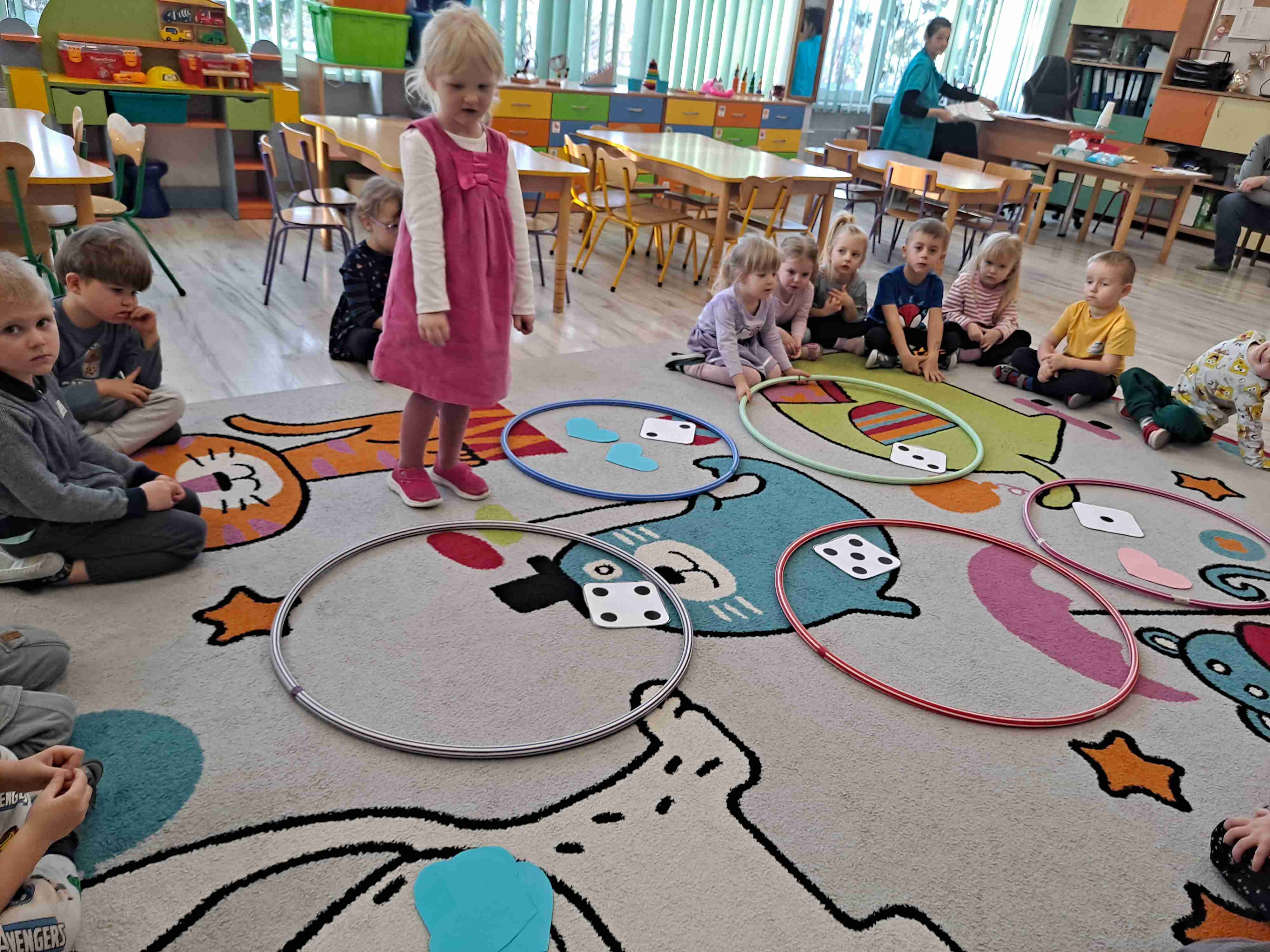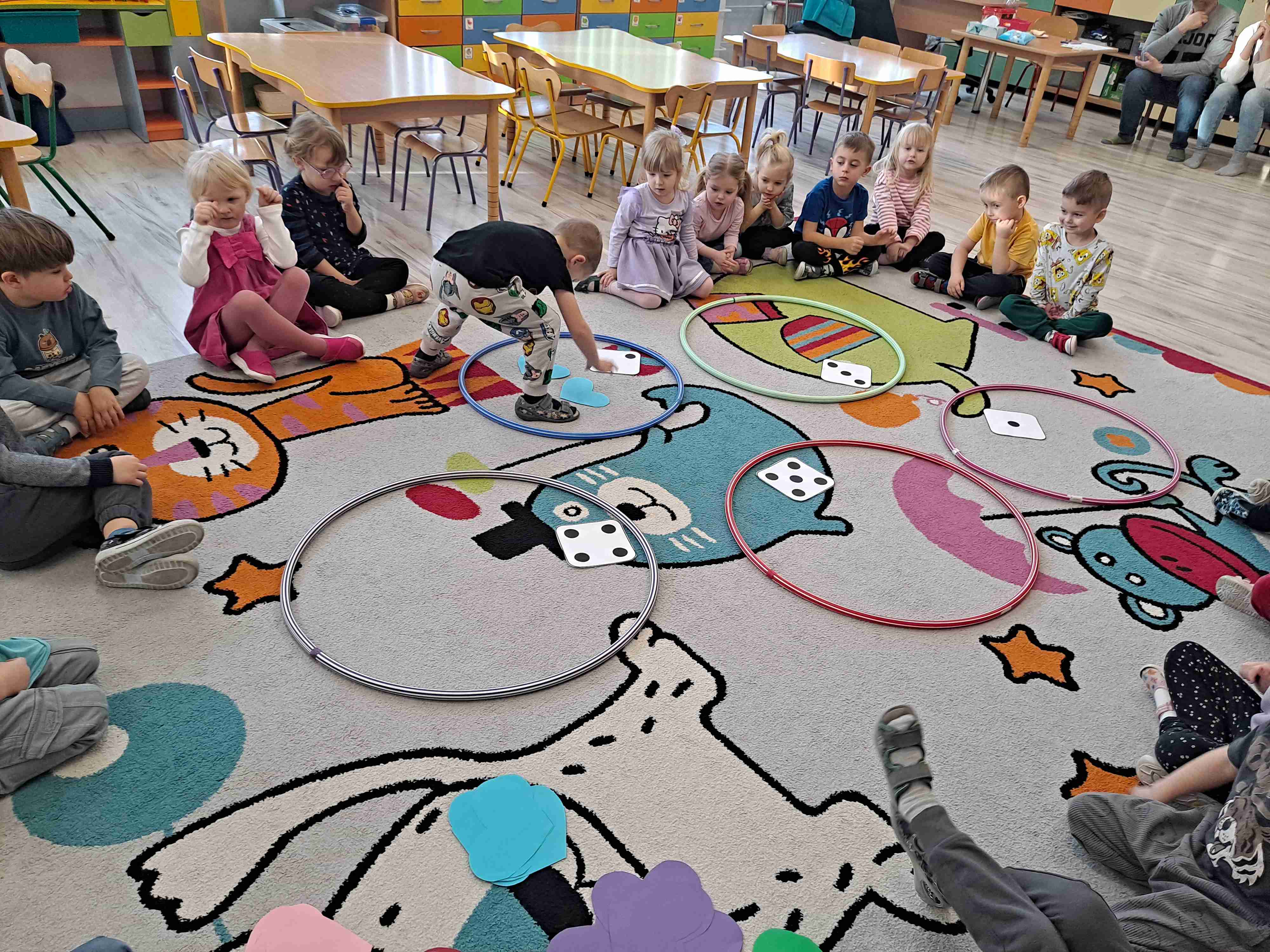 Podczas zabaw na dywanie dzieci doskonaliły umiejętności matematyczne, takie jak liczenie i rozpoznawanie ilości, ucząc się poprzez ruch i działanie. Wspólne zadania sprzyjały także współpracy w grupie, wzajemnemu czekaniu na swoją kolej oraz przestrzeganiu ustalonych zasad.