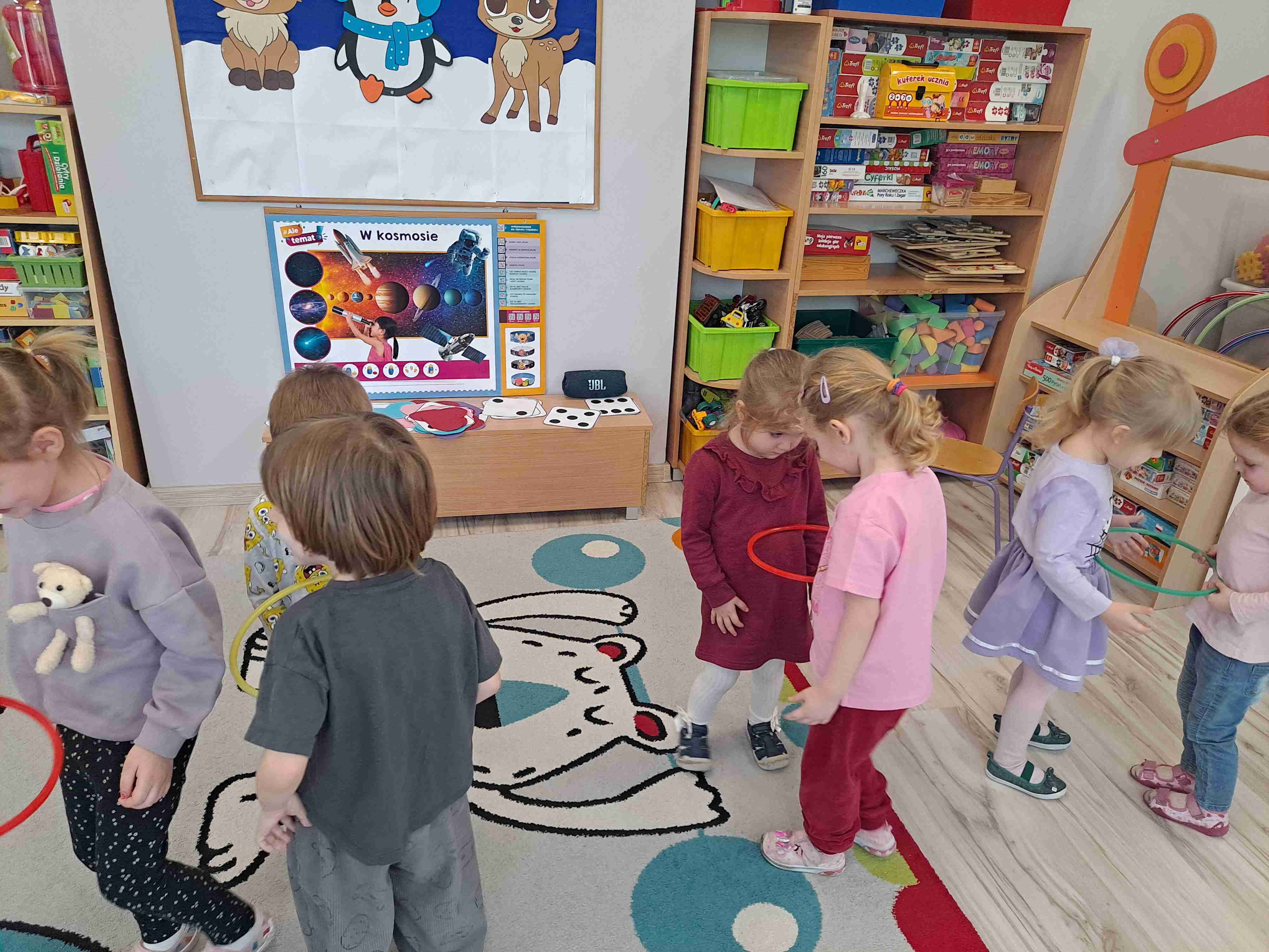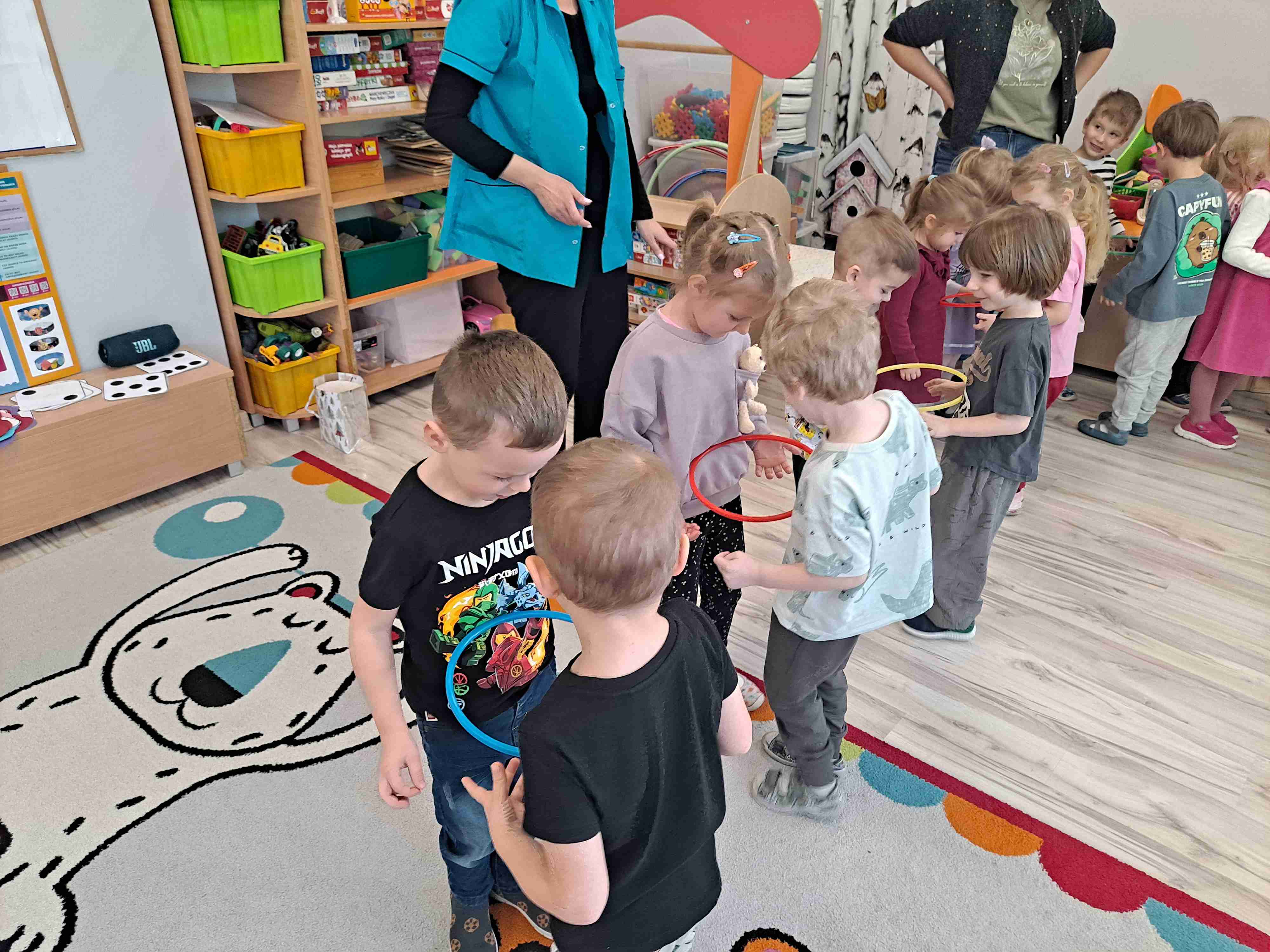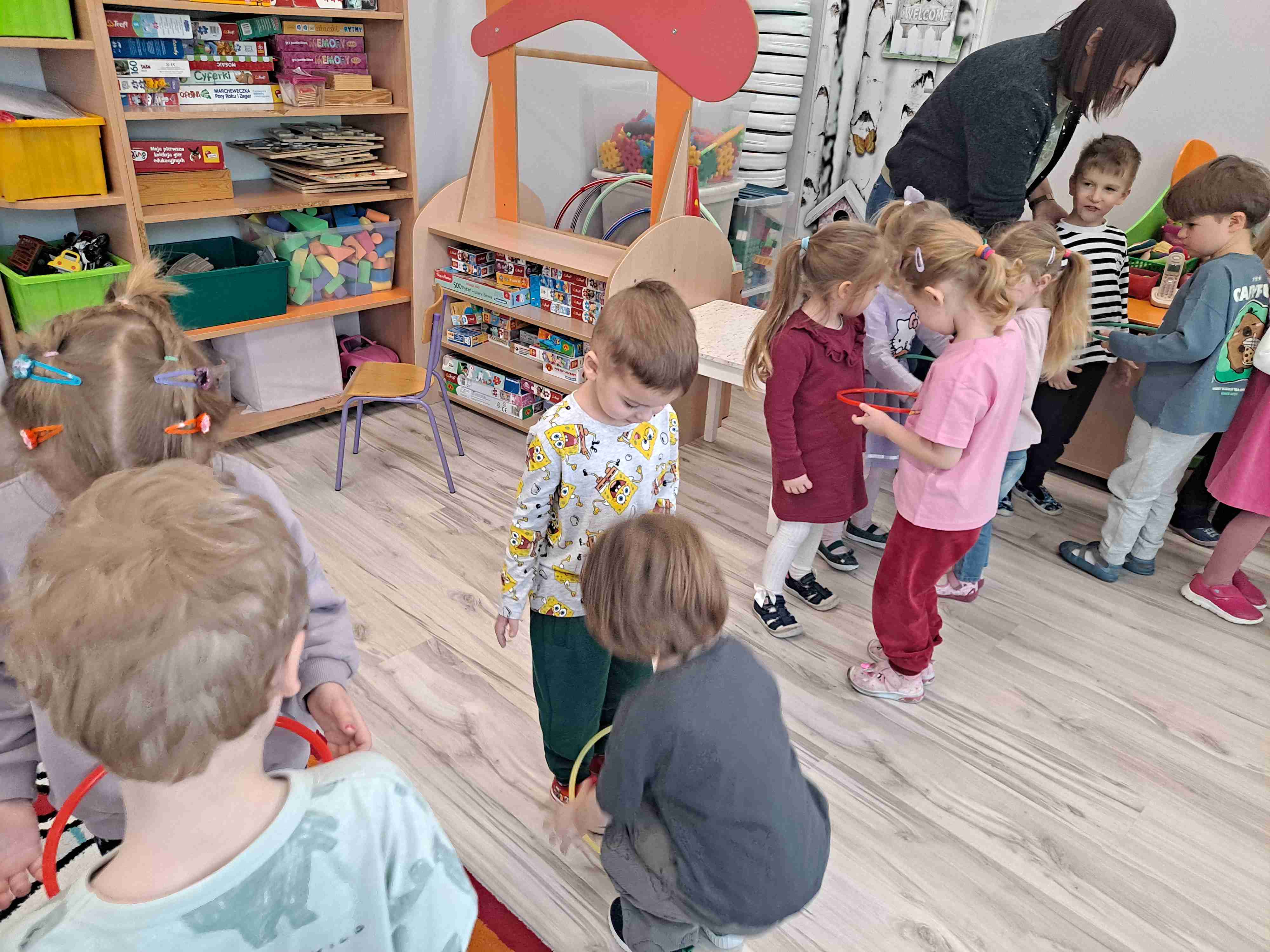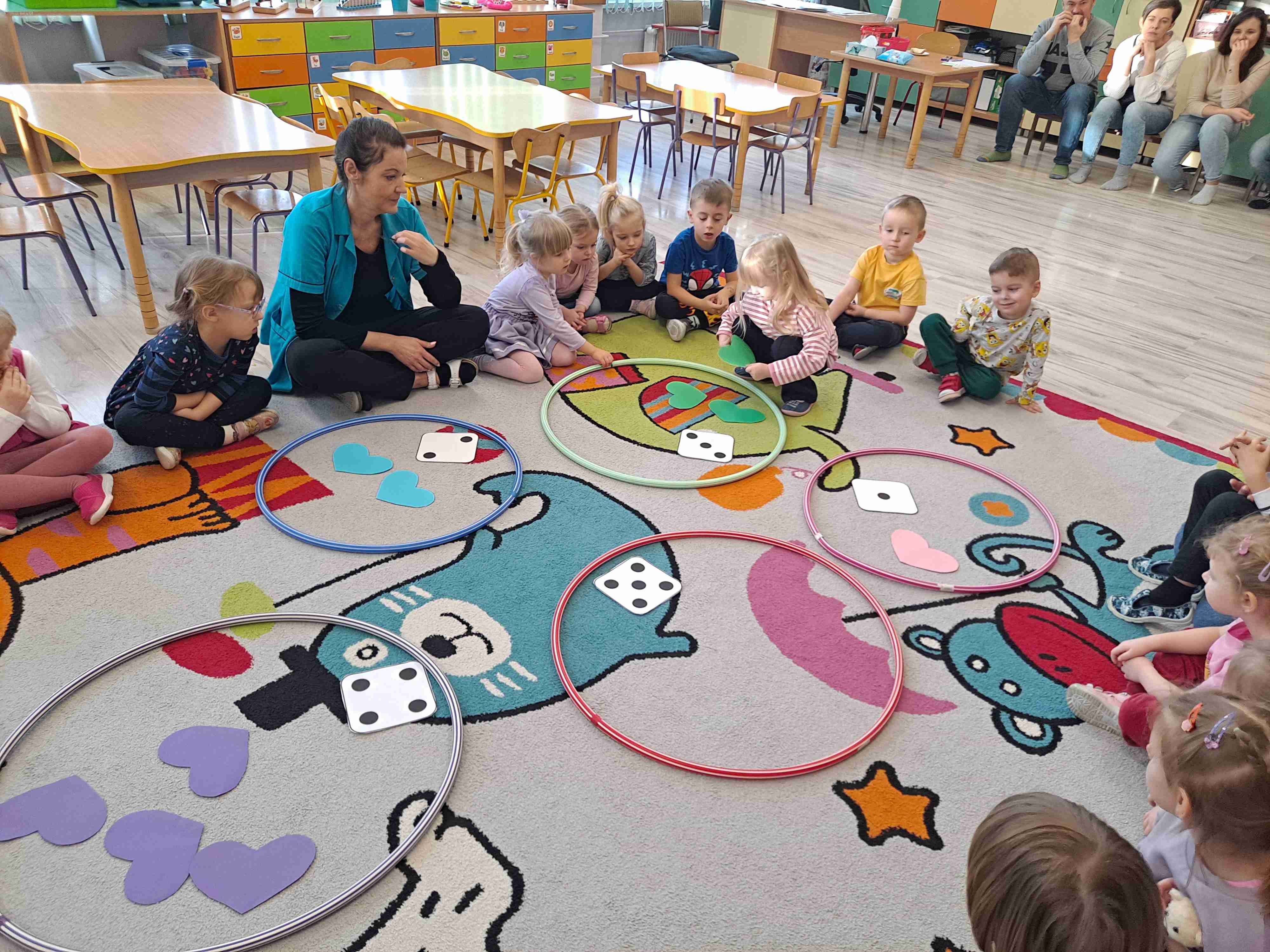Podczas zabaw na dywanie dzieci doskonaliły umiejętności matematyczne, takie jak liczenie i rozpoznawanie ilości, ucząc się poprzez ruch i działanie. Wspólne zadania sprzyjały także współpracy w grupie, wzajemnemu czekaniu na swoją kolej oraz przestrzeganiu ustalonych zasad.