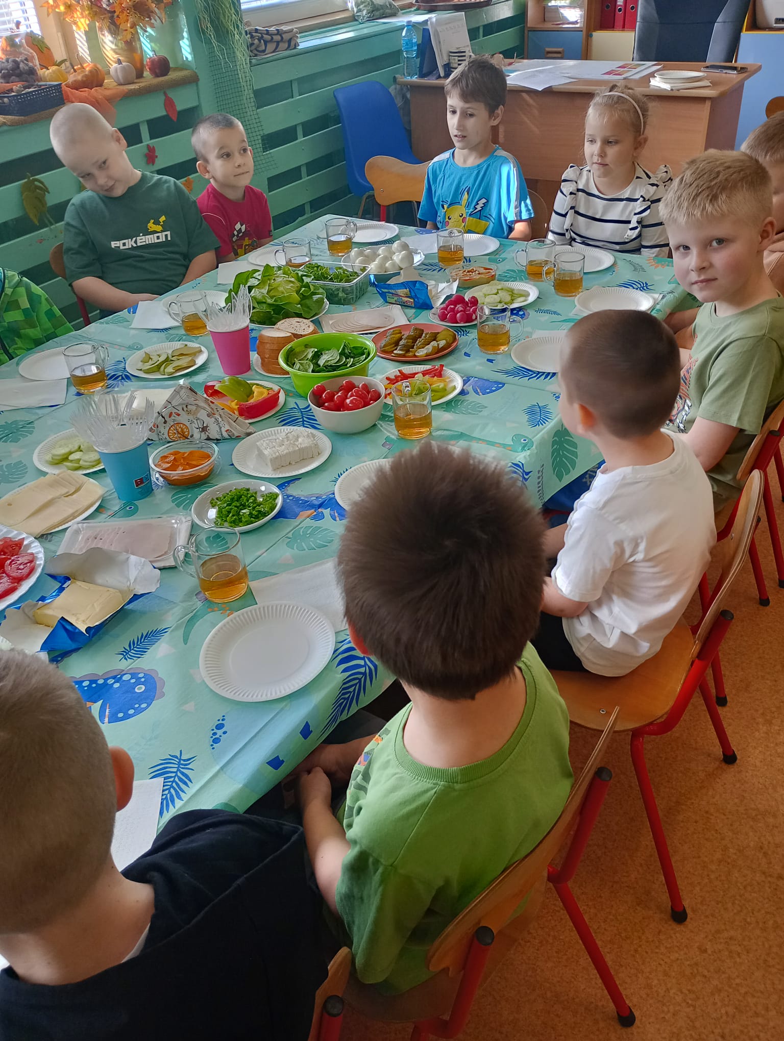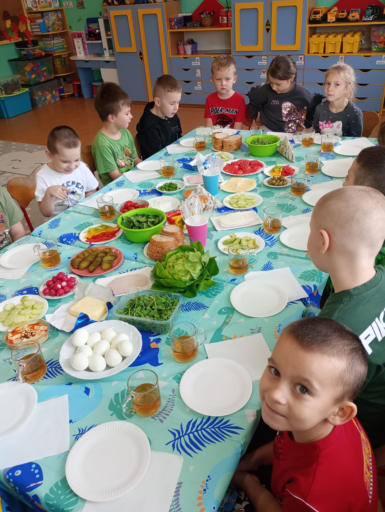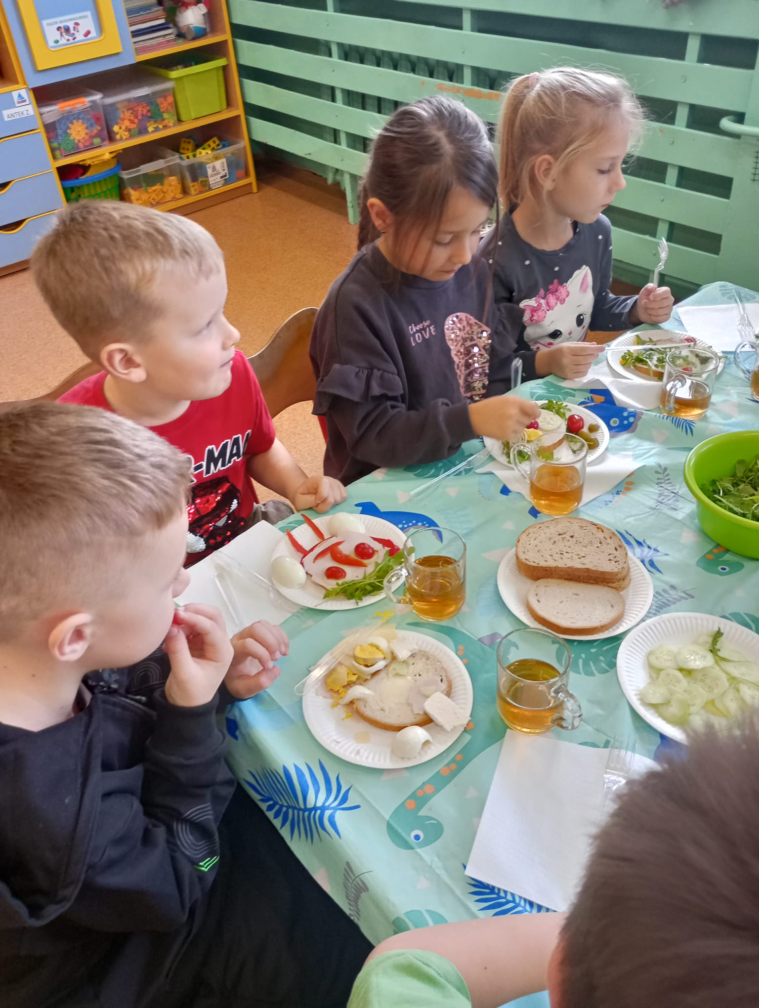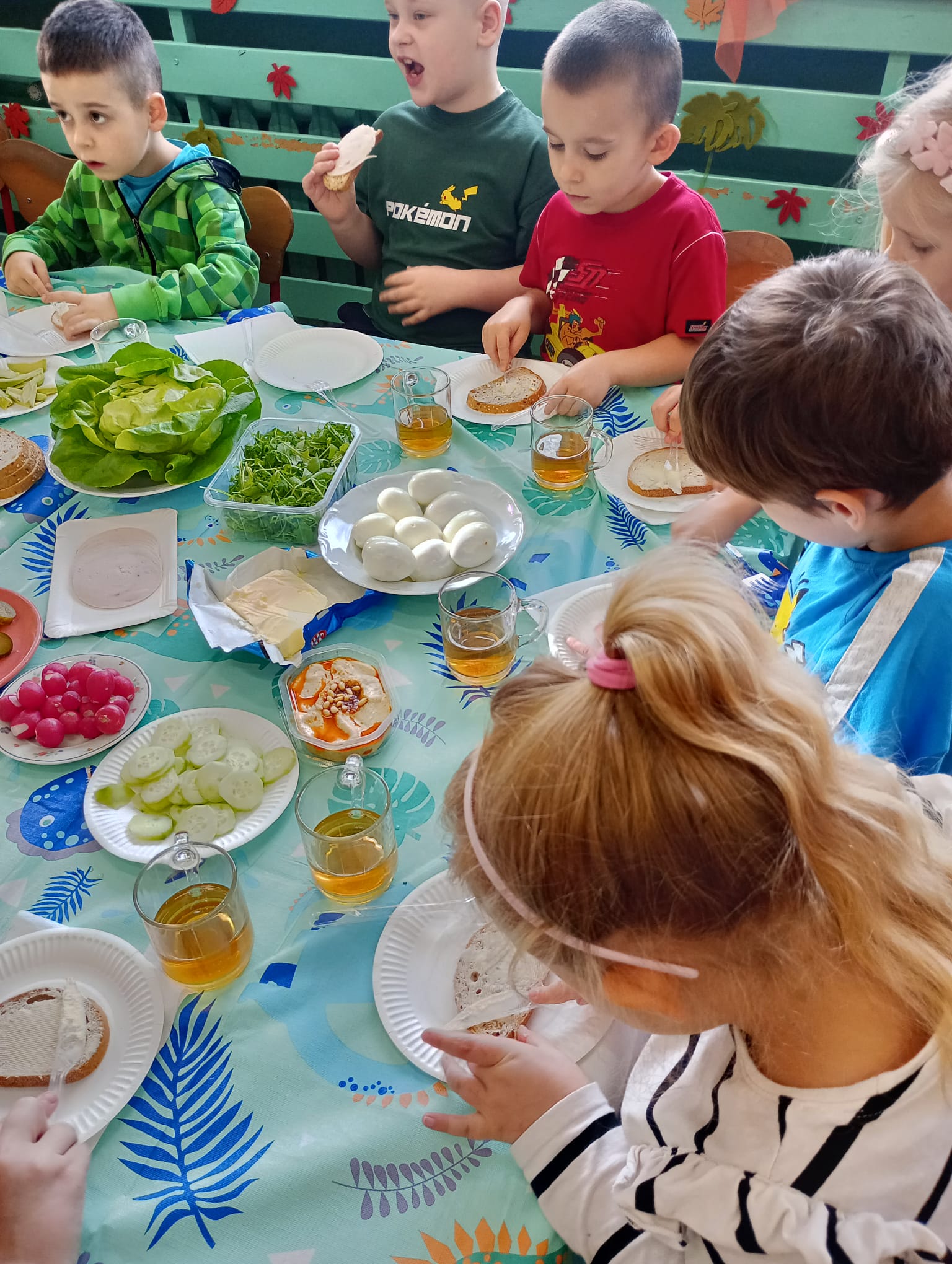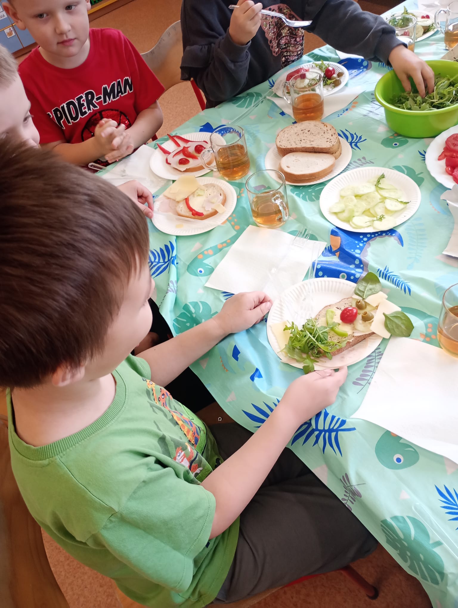 Dzieci z grupy Rumianki dbając o zdrowie wspólnie przygotowały warzywną sałatkę oraz na śniadanie zdrowe, kolorowe kanapeczki z różnych warzyw. Wspólnie przygotowane śniadanie bardzo smakowało przedszkolakom, następne zapewne przygotują dla rodziców w domu.