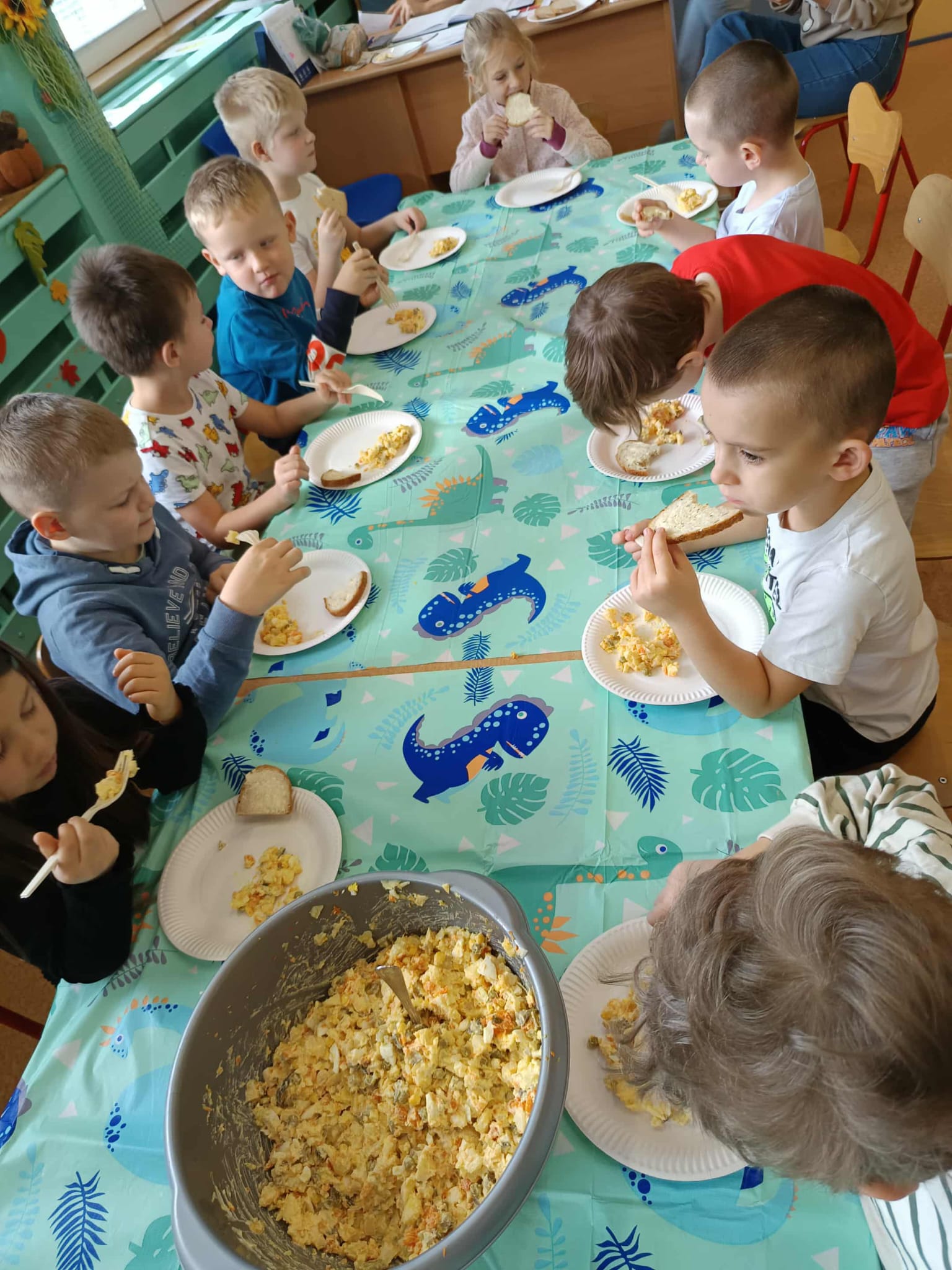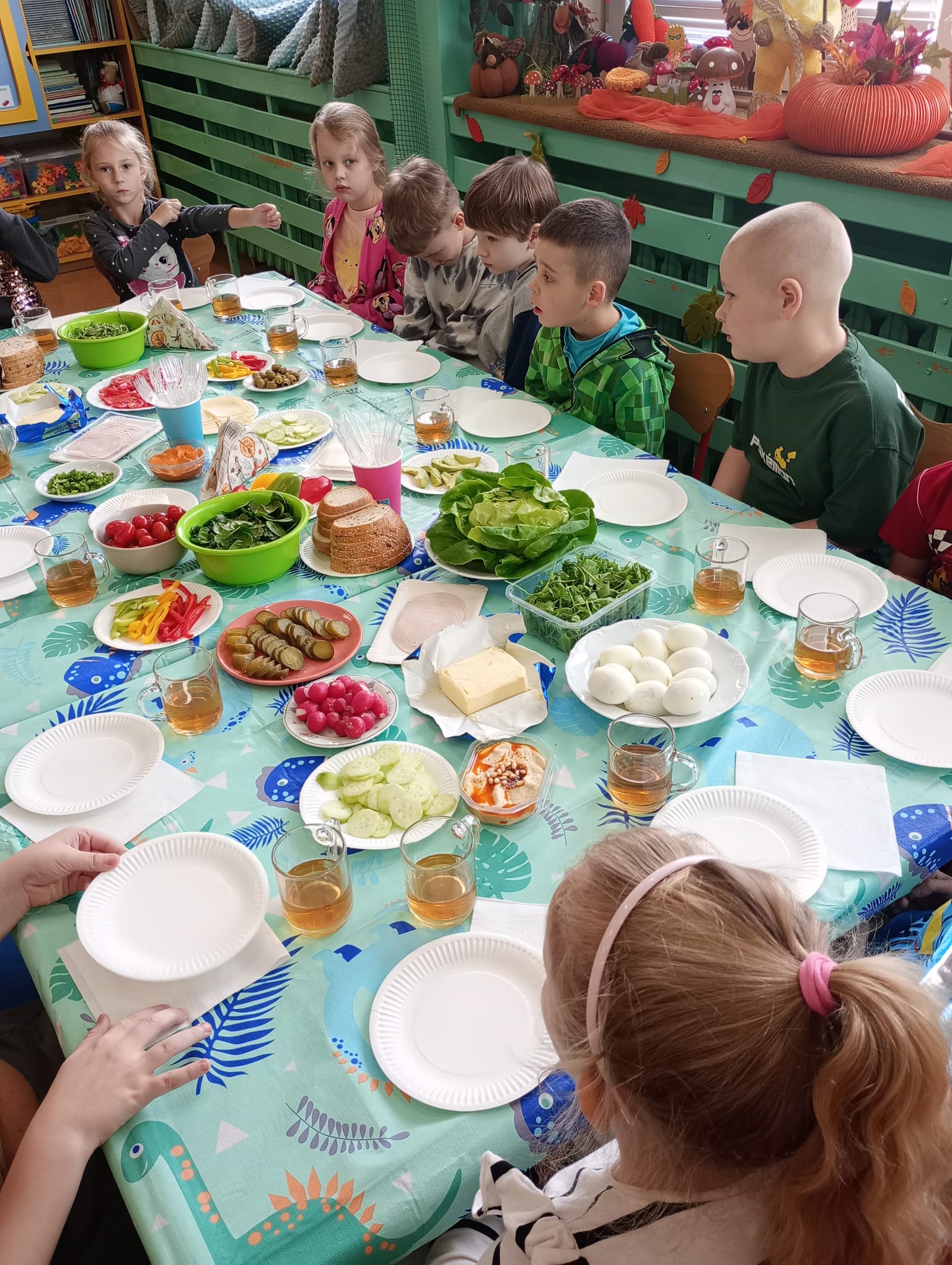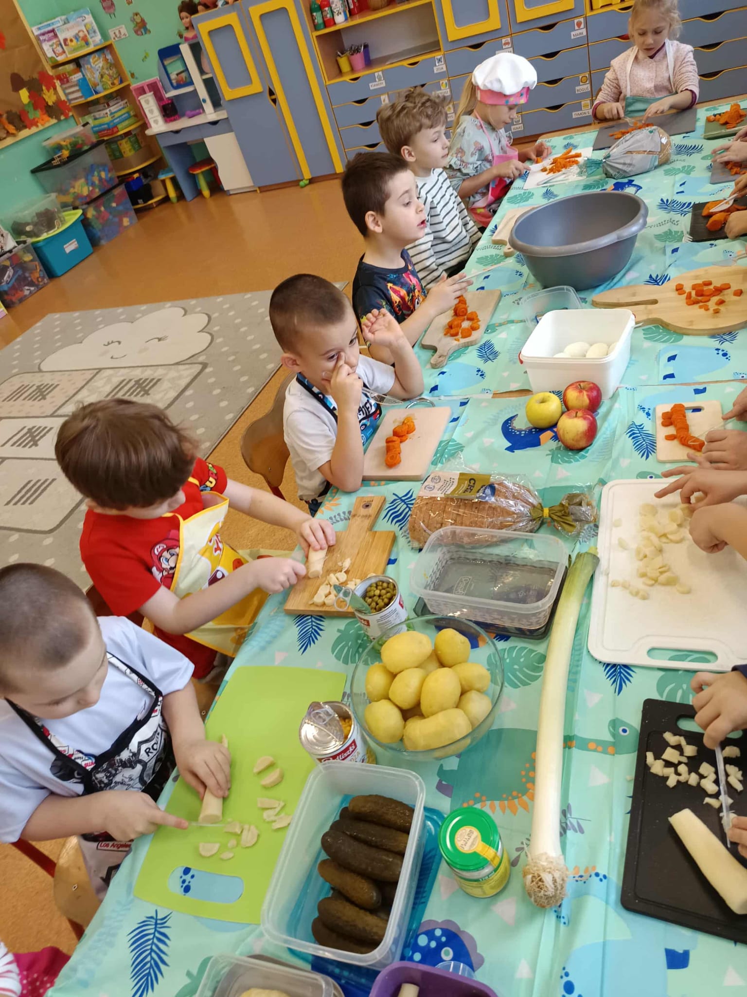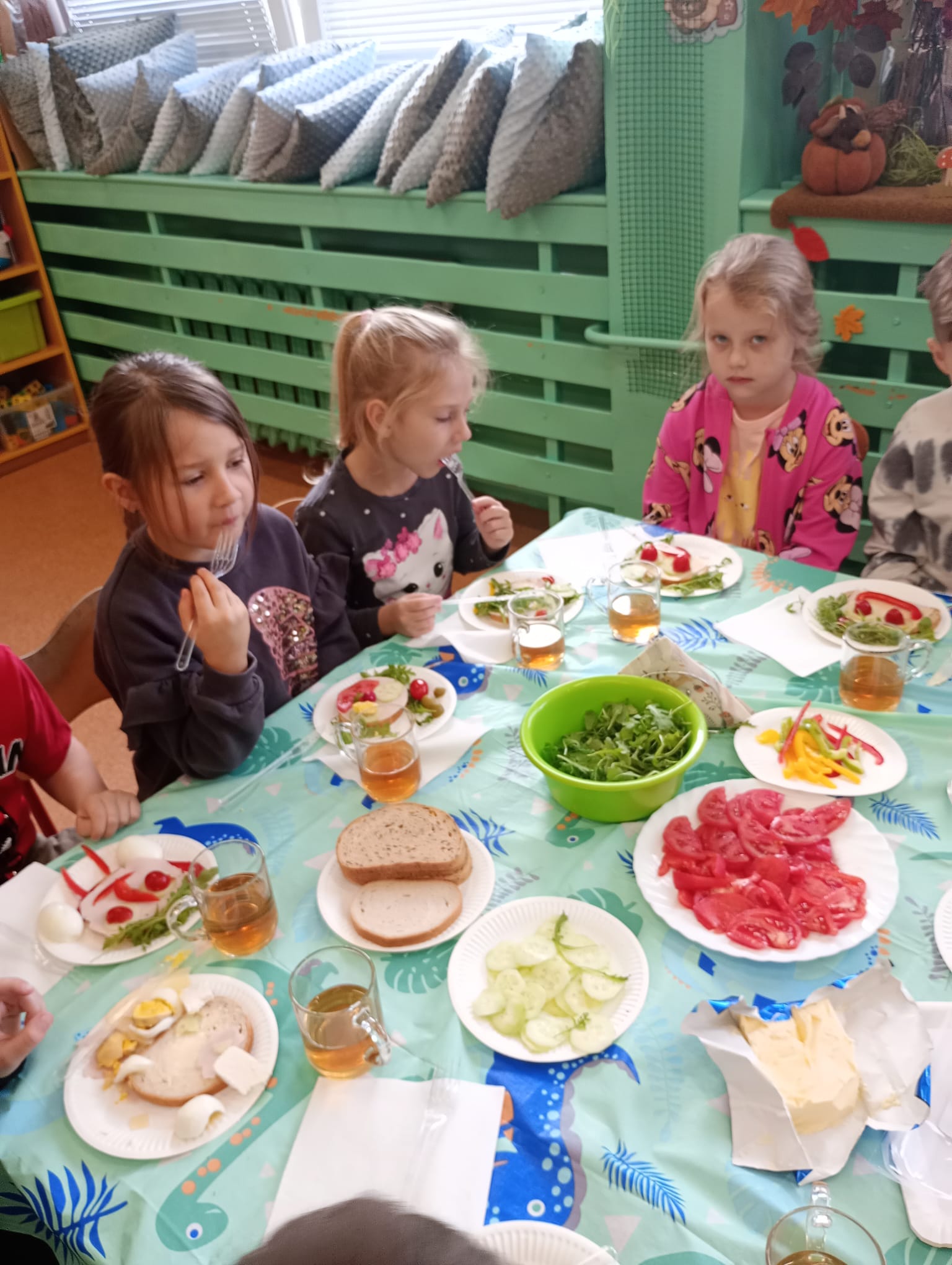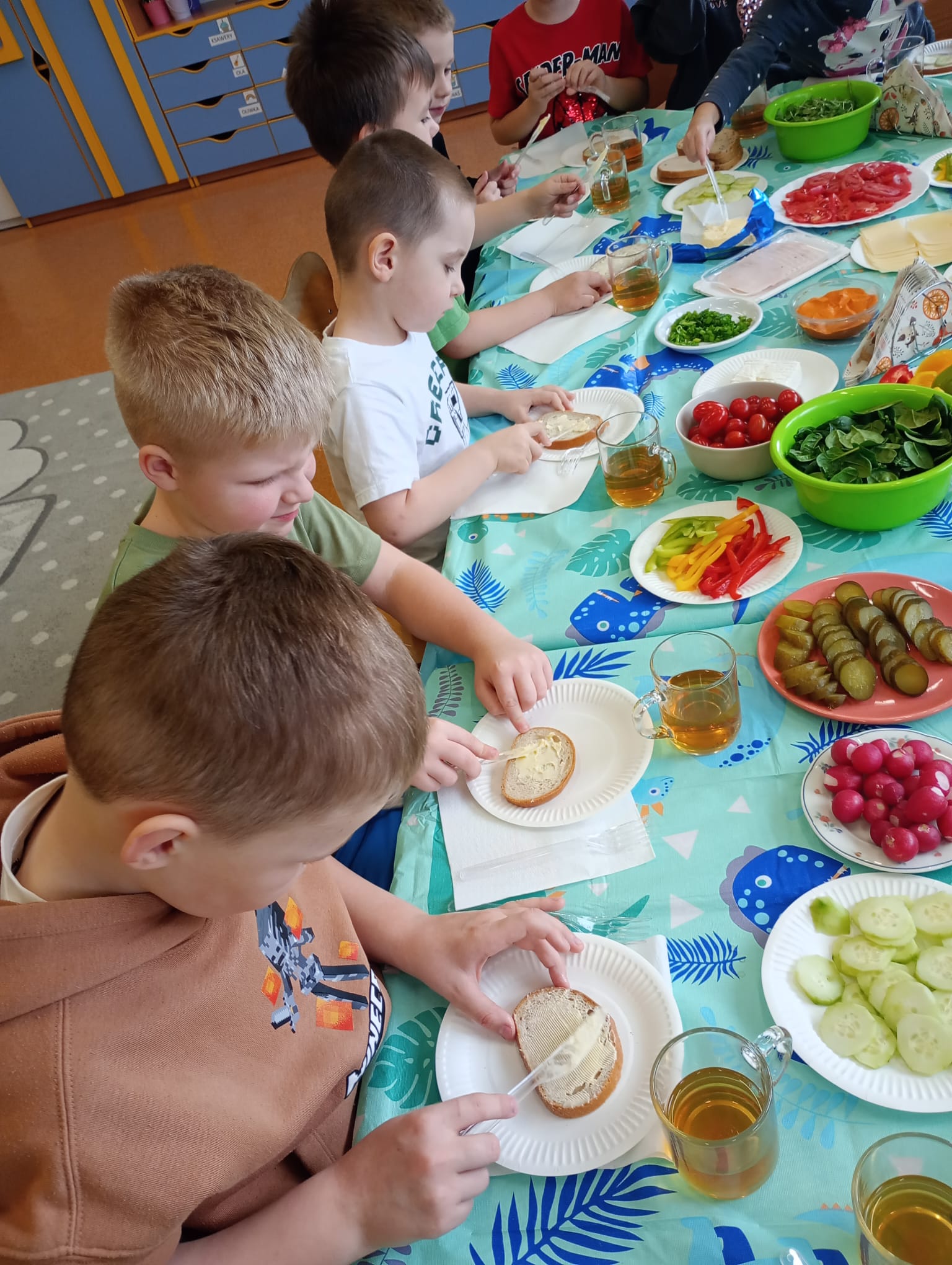 Dzieci z grupy Rumianki dbając o zdrowie wspólnie przygotowały warzywną sałatkę oraz na śniadanie zdrowe, kolorowe kanapeczki z różnych warzyw. Wspólnie przygotowane śniadanie bardzo smakowało przedszkolakom, następne zapewne przygotują dla rodziców w domu.