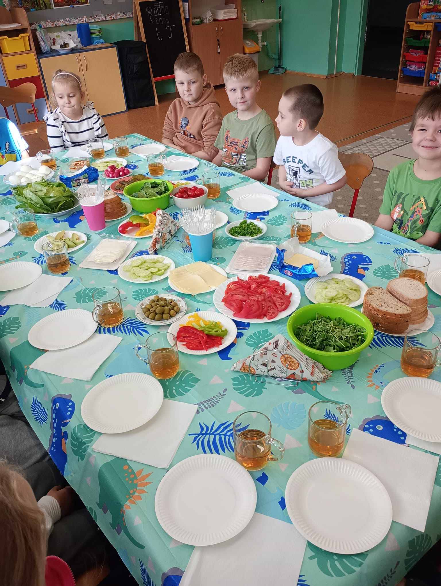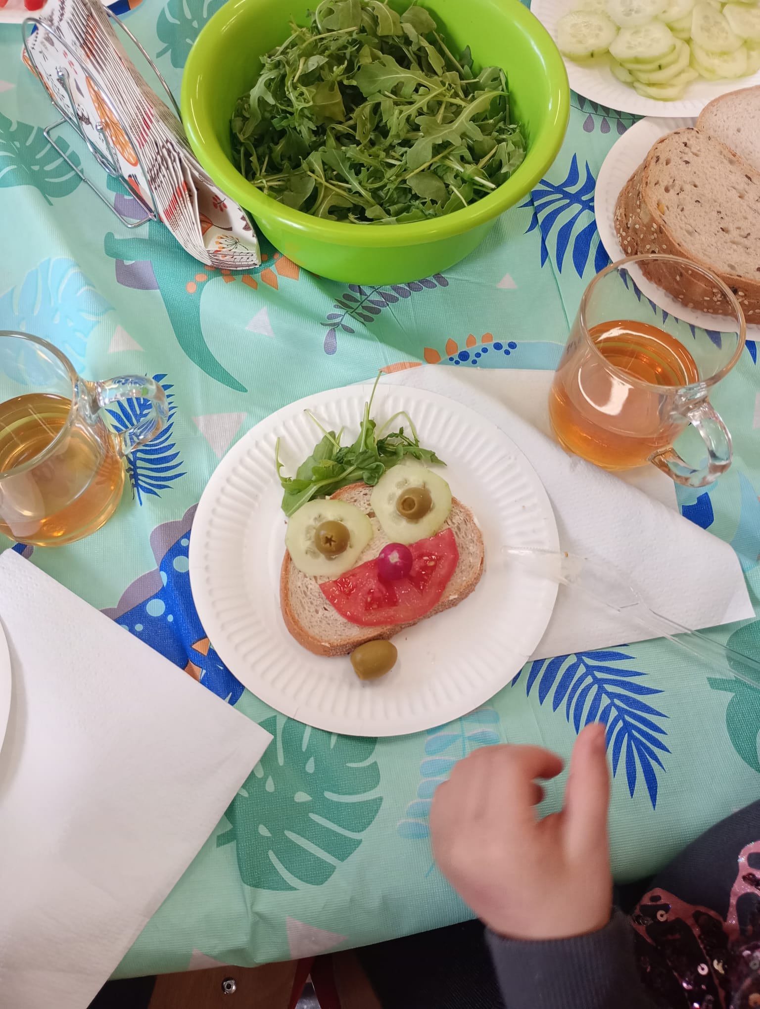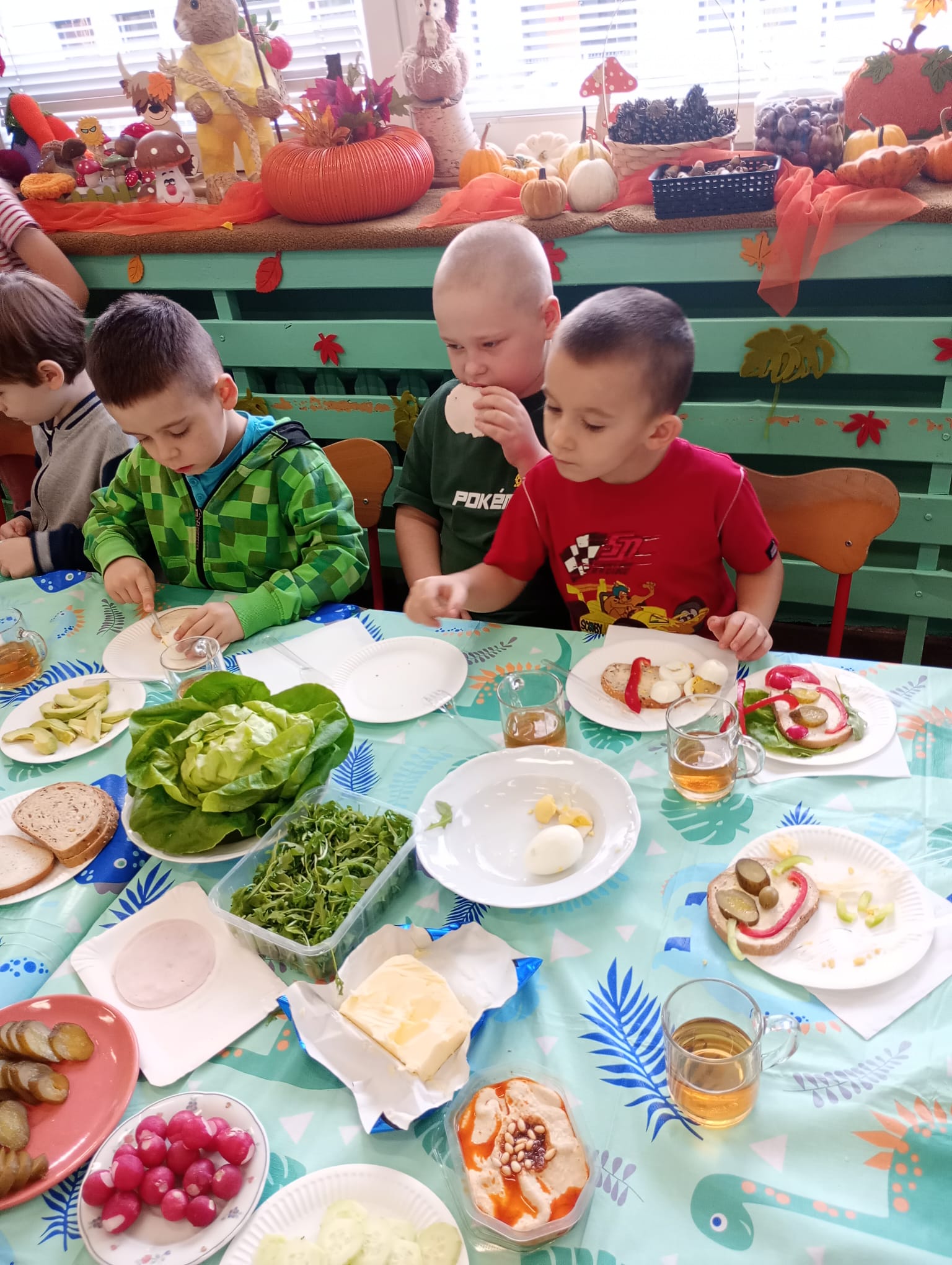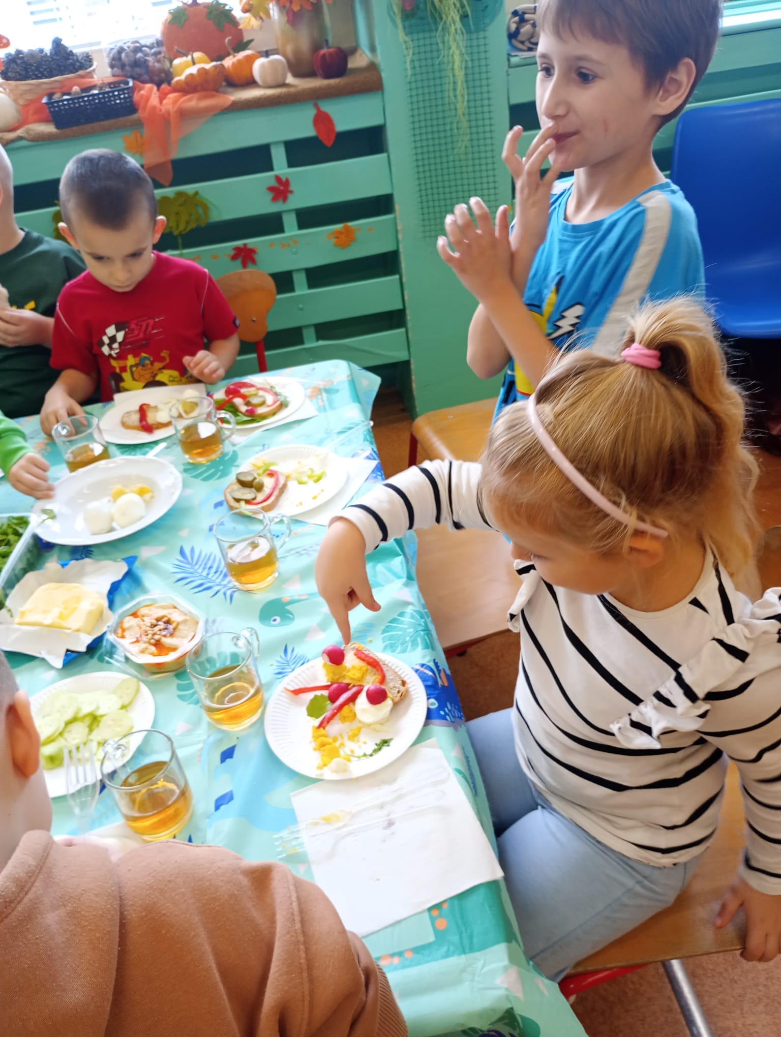 Dzieci z grupy Rumianki dbając o zdrowie wspólnie przygotowały warzywną sałatkę oraz na śniadanie zdrowe, kolorowe kanapeczki z różnych warzyw. Wspólnie przygotowane śniadanie bardzo smakowało przedszkolakom, następne zapewne przygotują dla rodziców w domu.