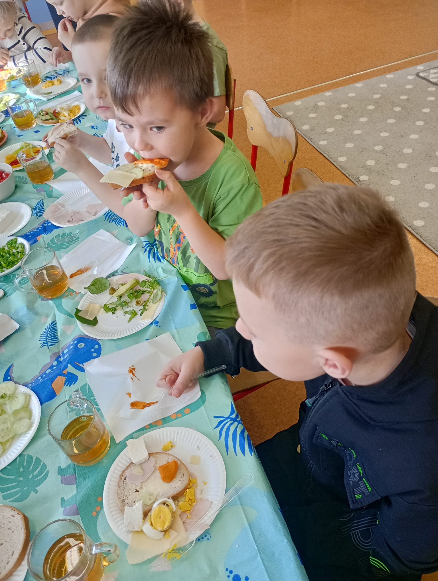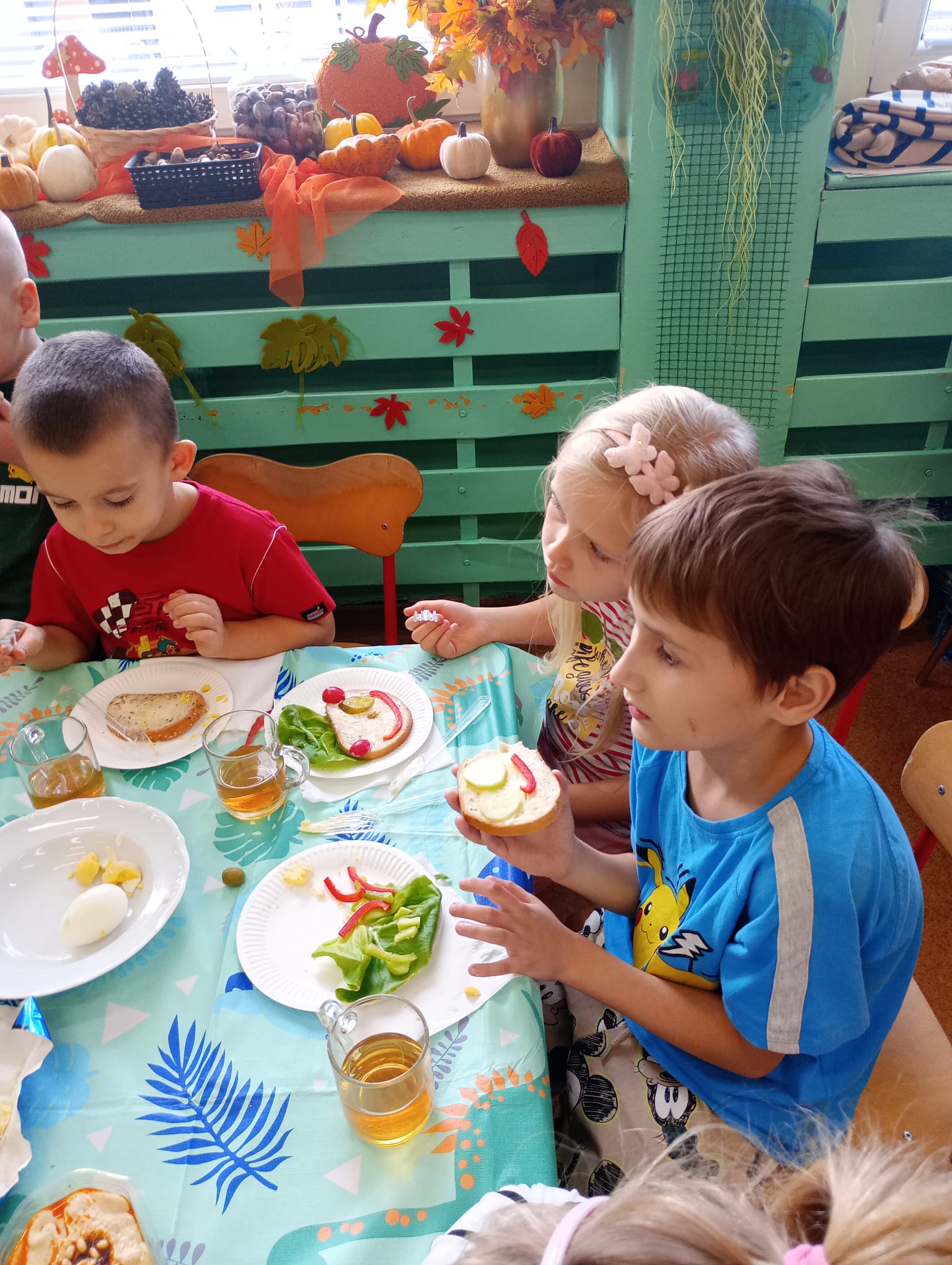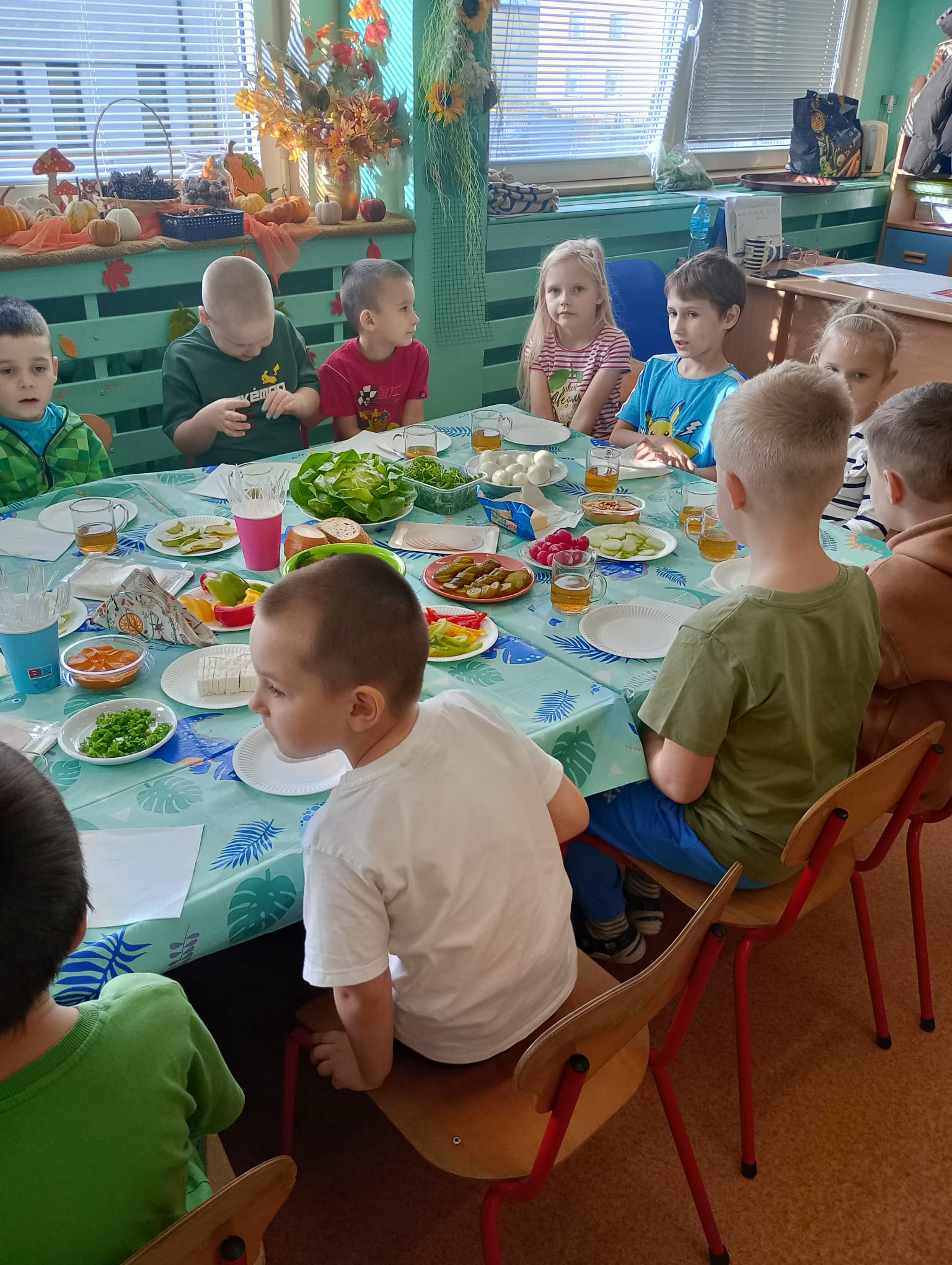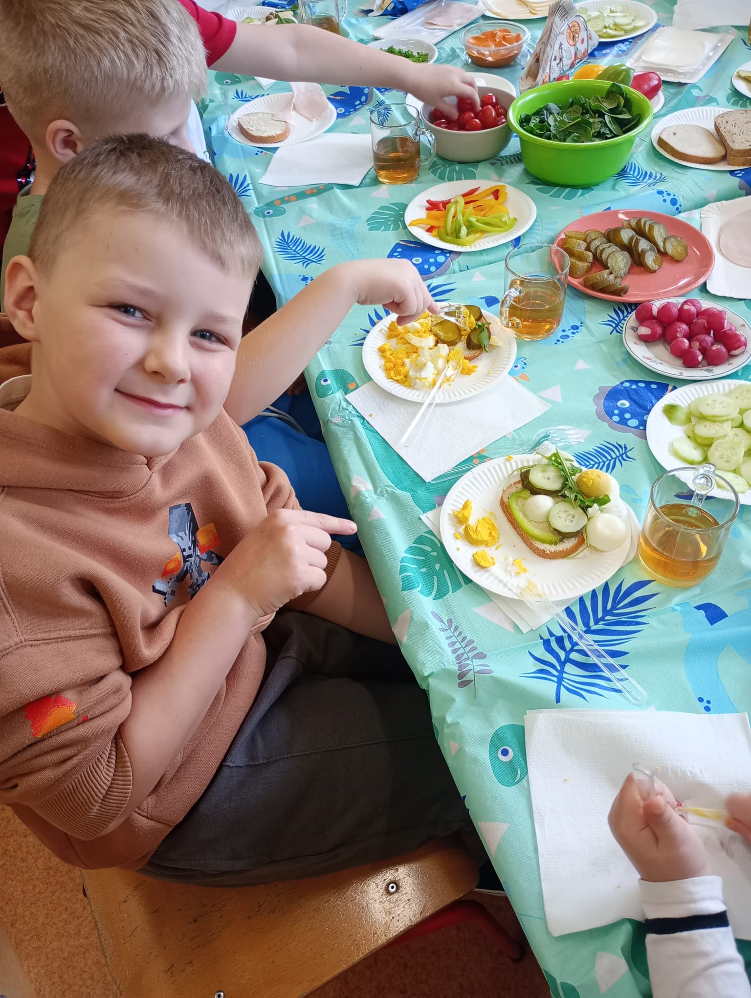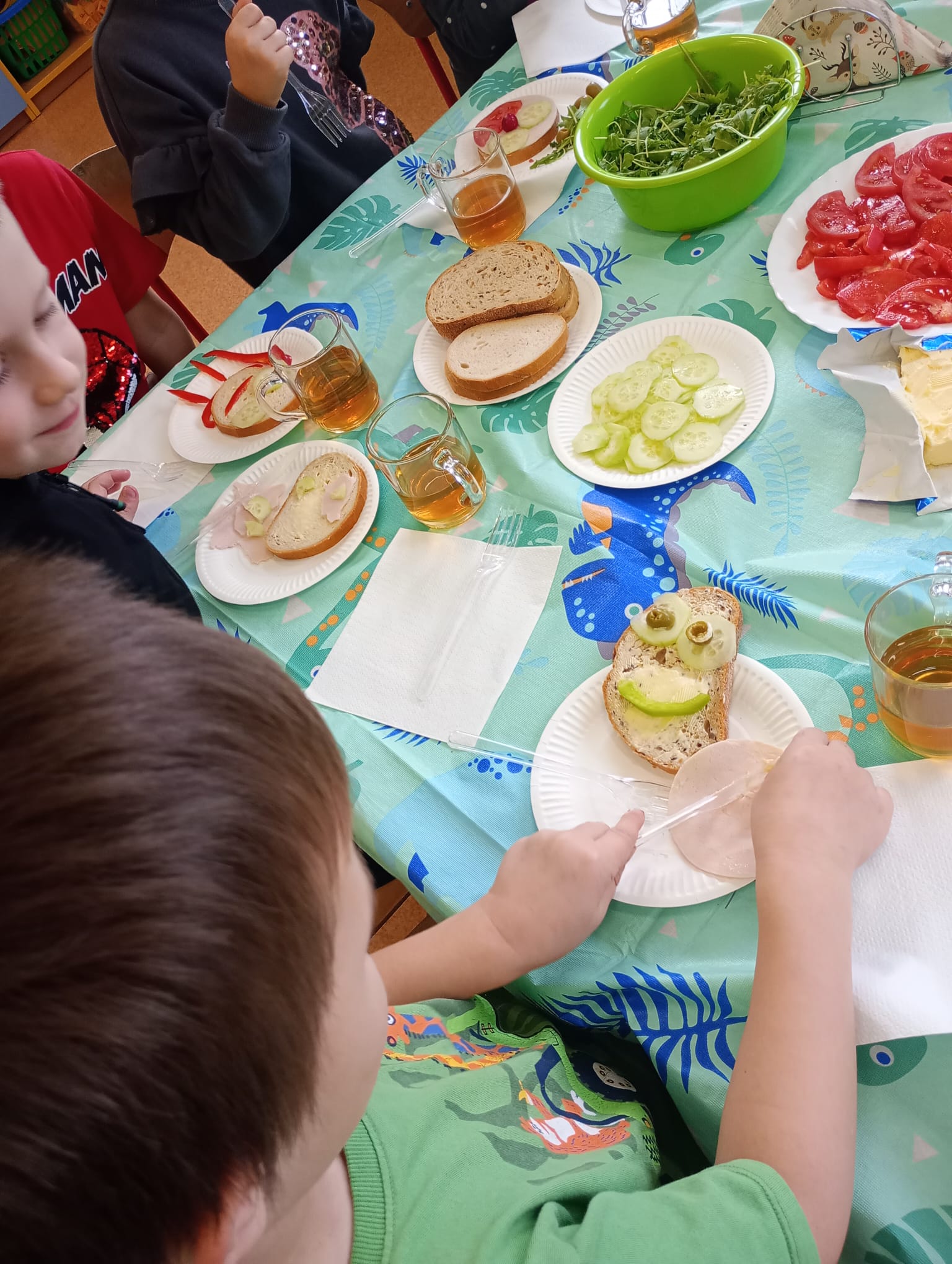 Dzieci z grupy Rumianki dbając o zdrowie wspólnie przygotowały warzywną sałatkę oraz na śniadanie zdrowe, kolorowe kanapeczki z różnych warzyw. Wspólnie przygotowane śniadanie bardzo smakowało przedszkolakom, następne zapewne przygotują dla rodziców w domu.