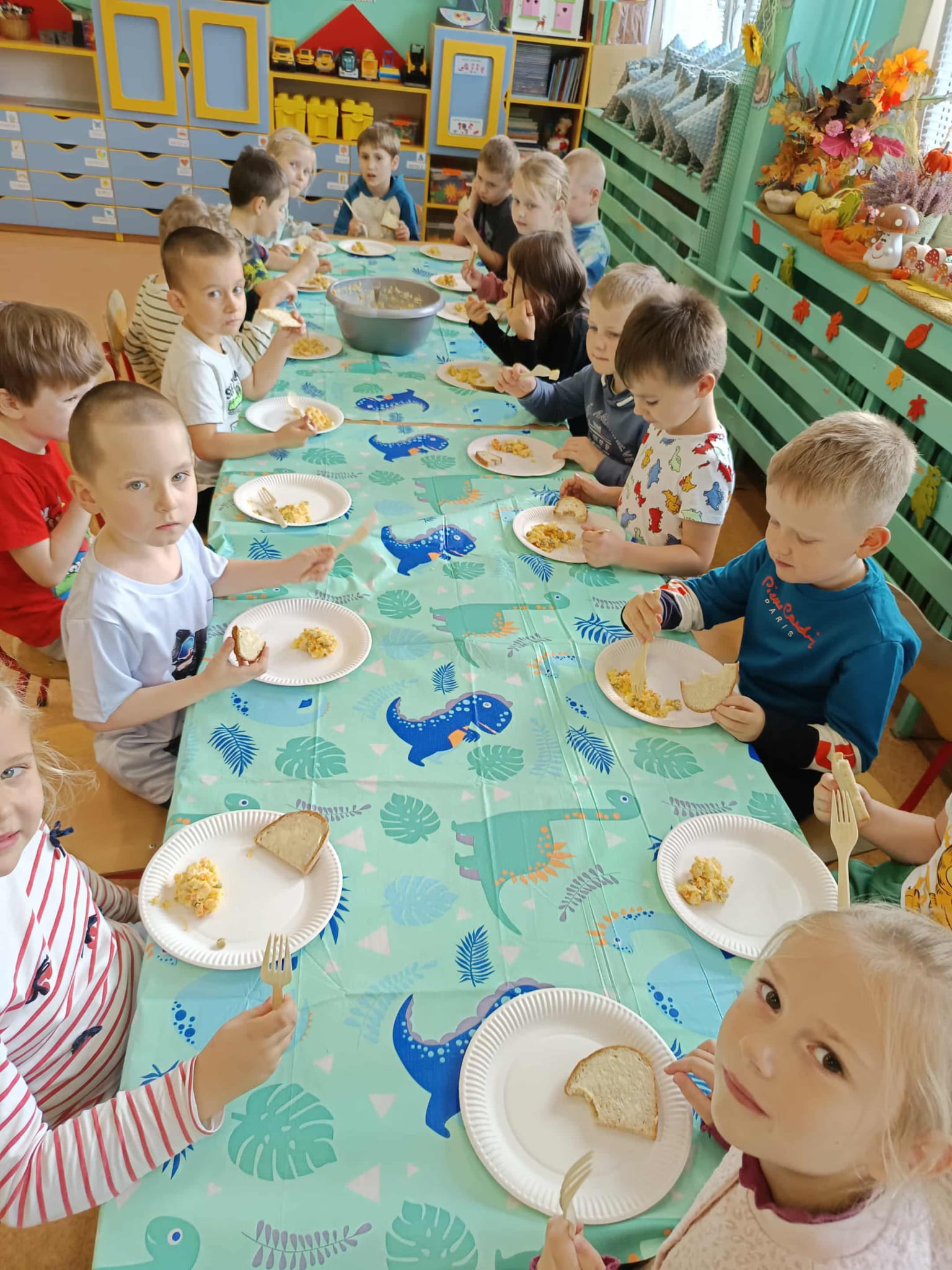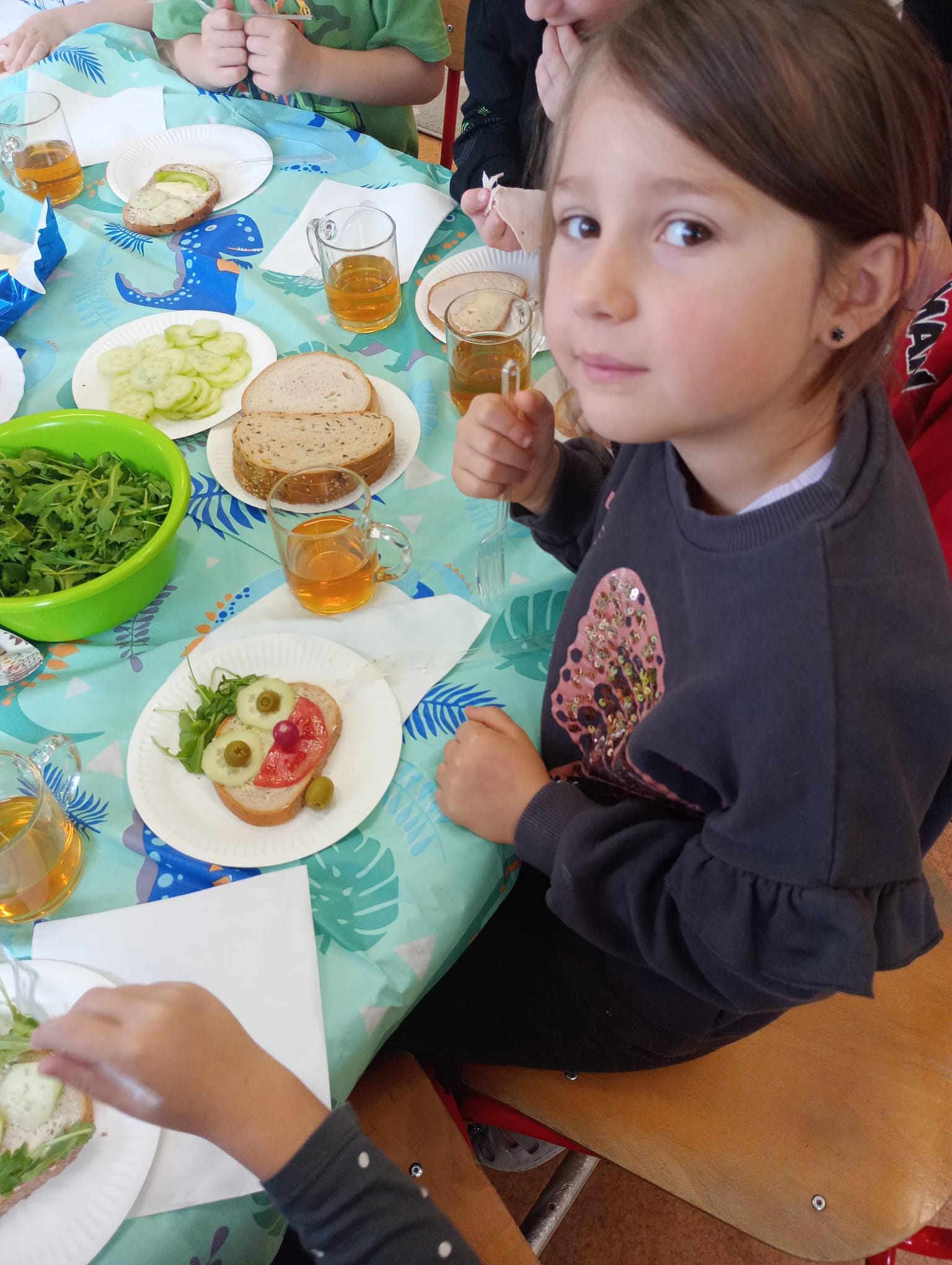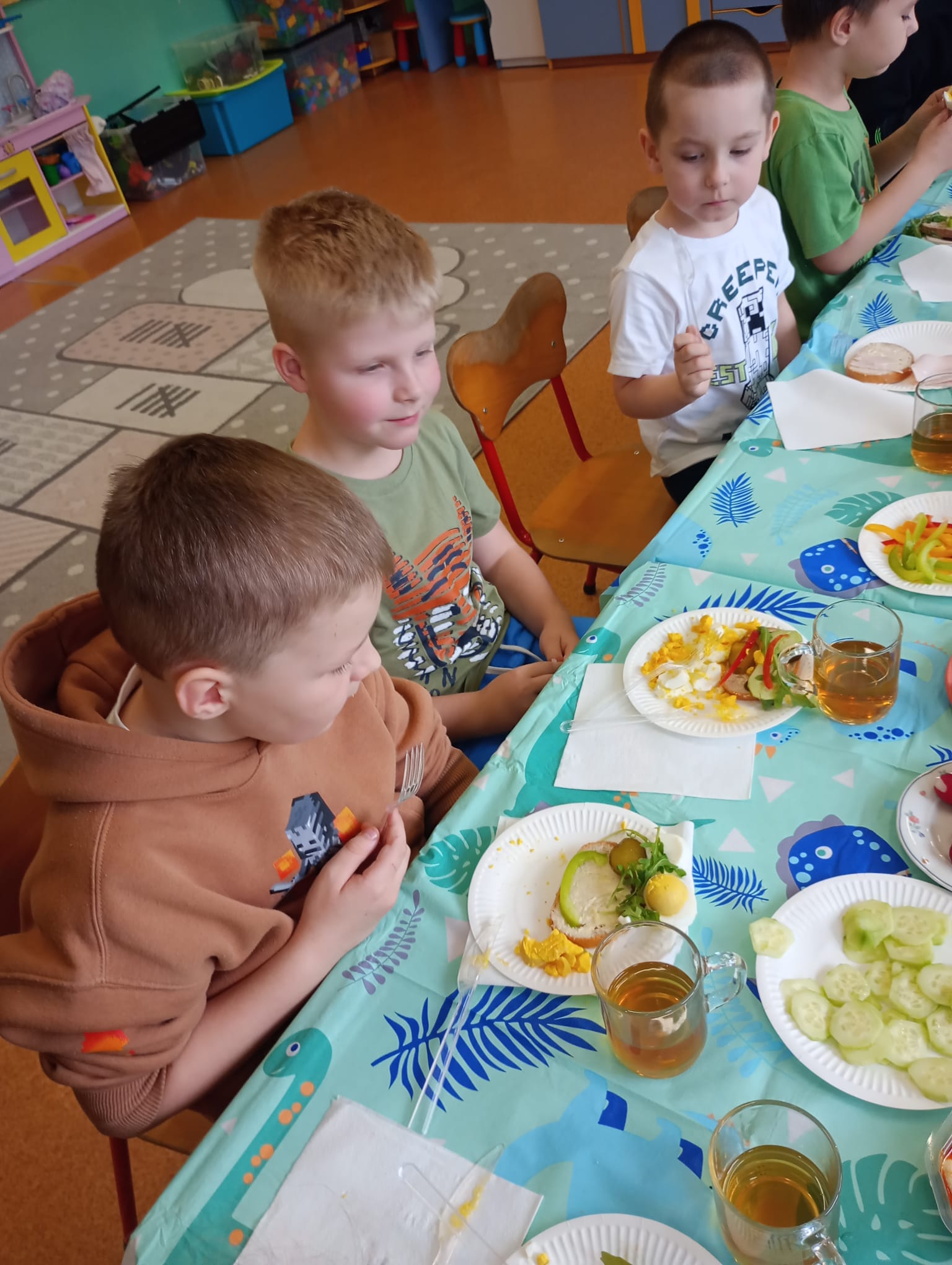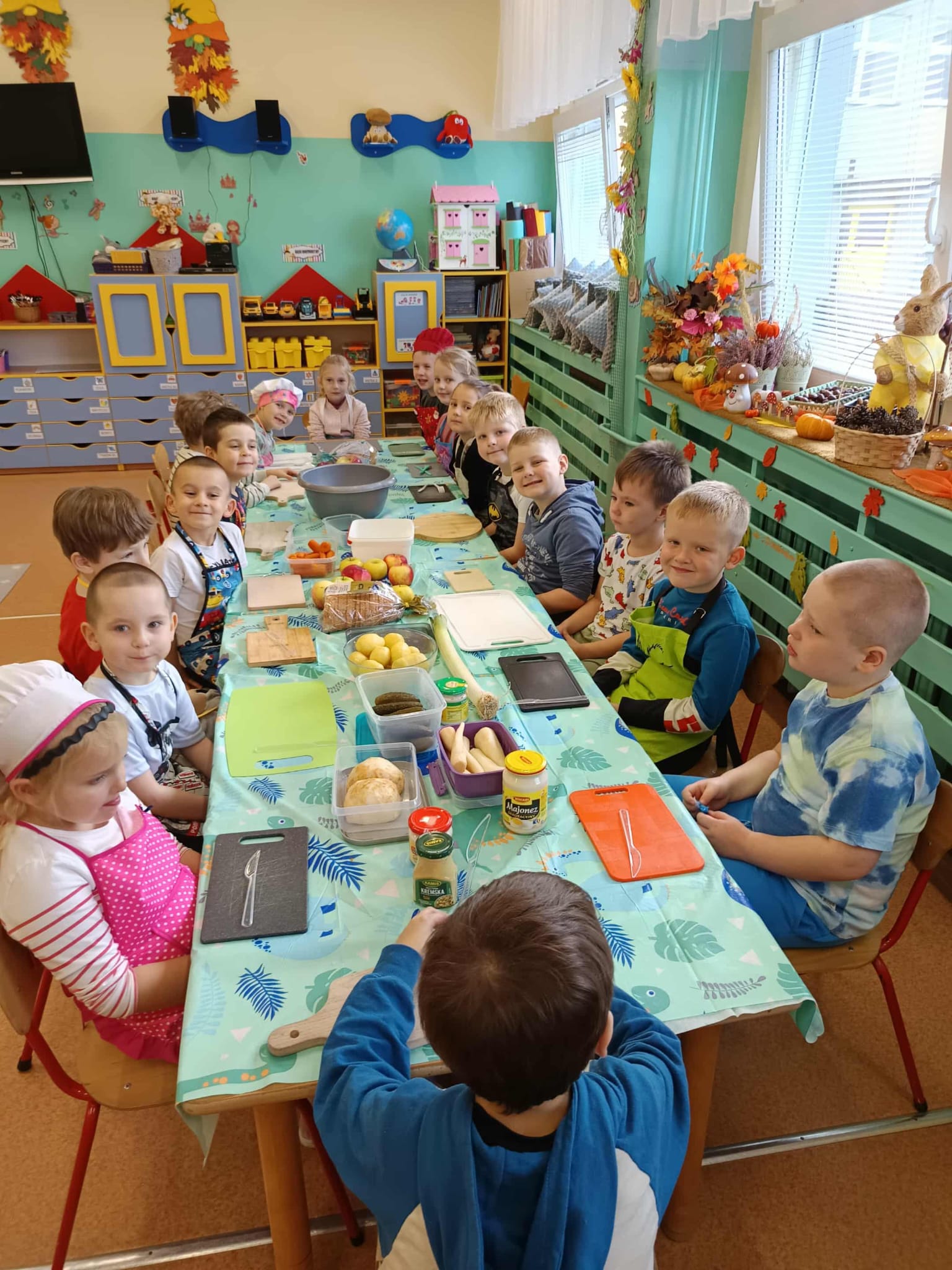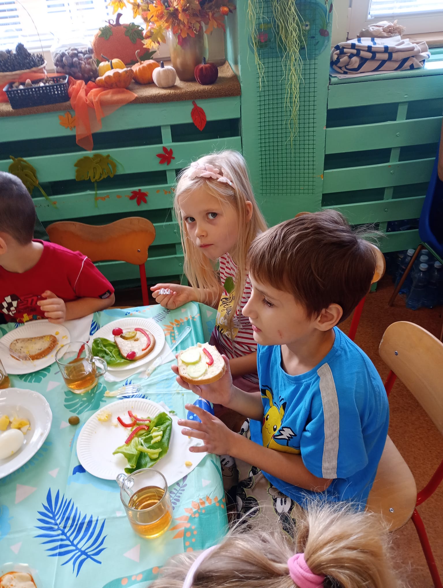 Dzieci z grupy Rumianki dbając o zdrowie wspólnie przygotowały warzywną sałatkę oraz na śniadanie zdrowe, kolorowe kanapeczki z różnych warzyw. Wspólnie przygotowane śniadanie bardzo smakowało przedszkolakom, następne zapewne przygotują dla rodziców w domu.