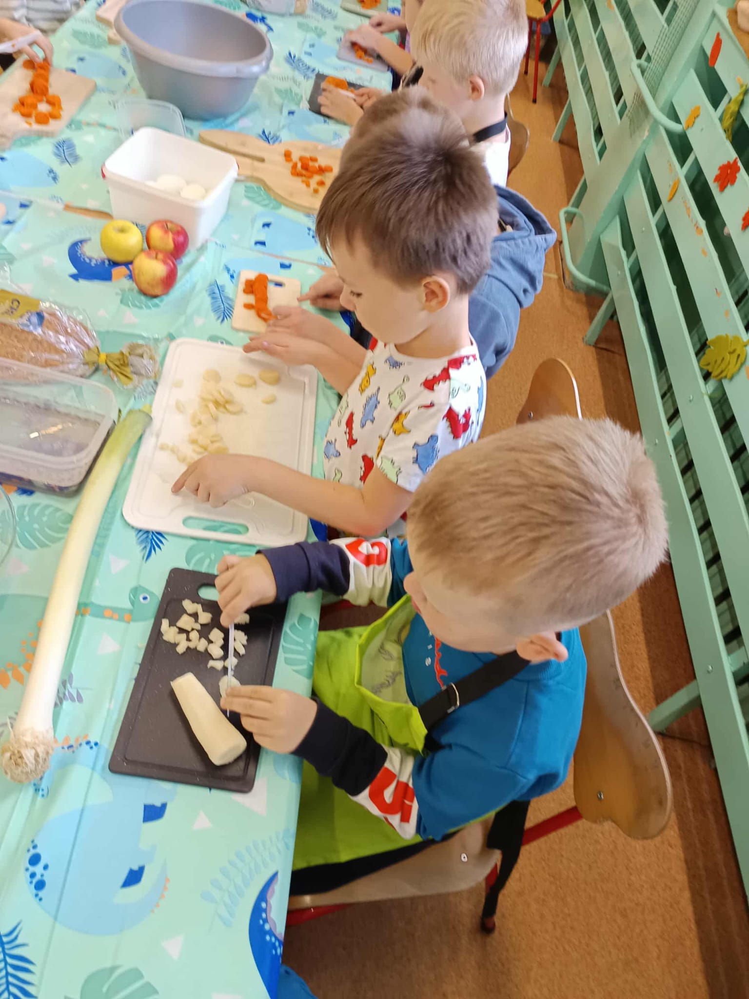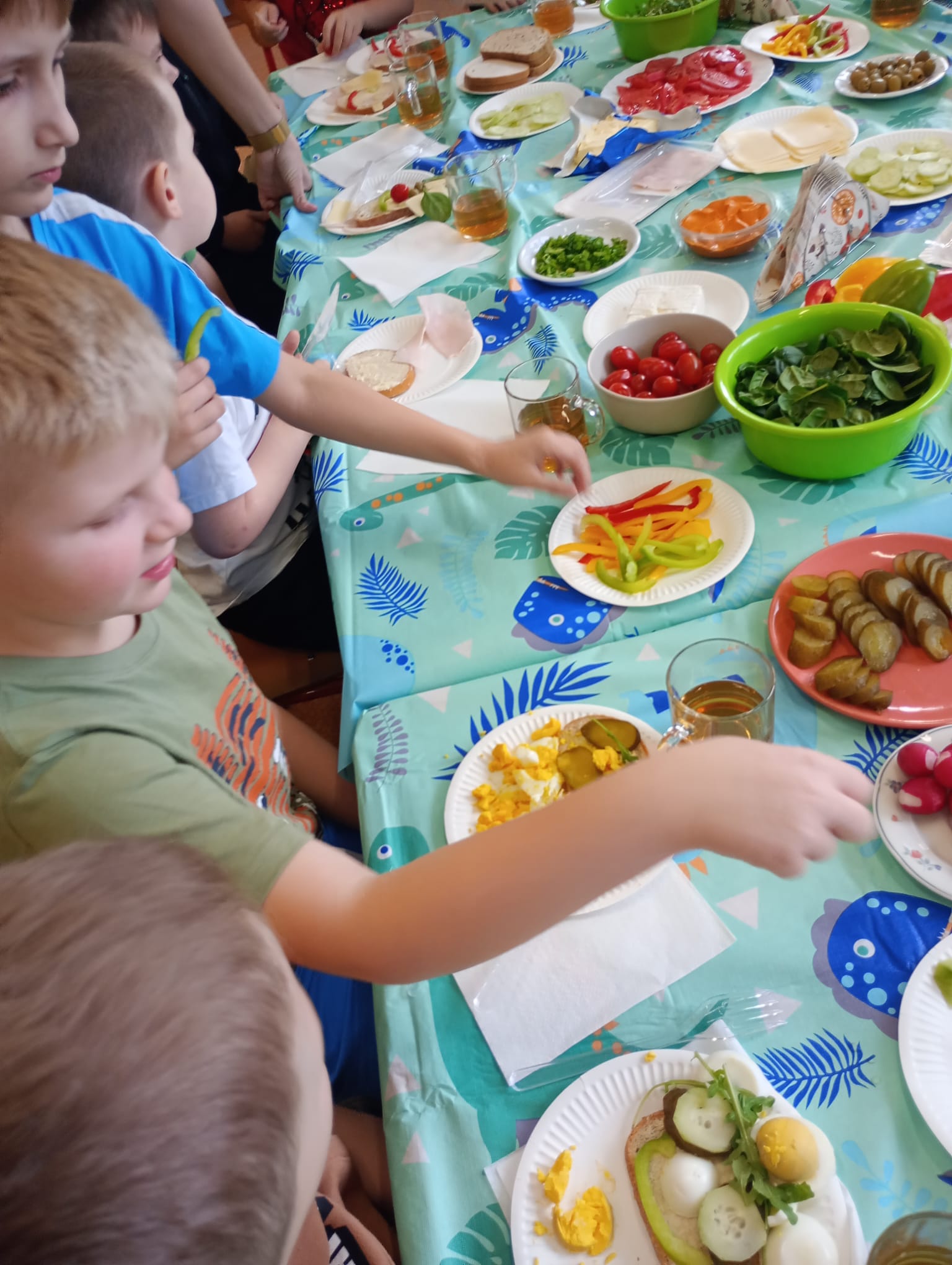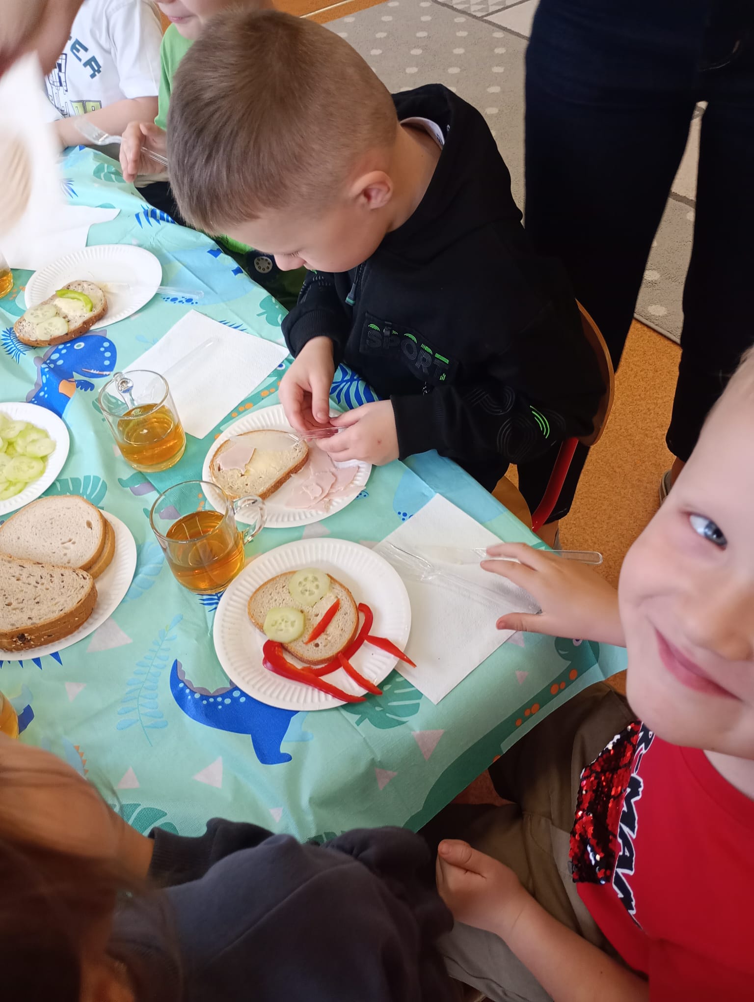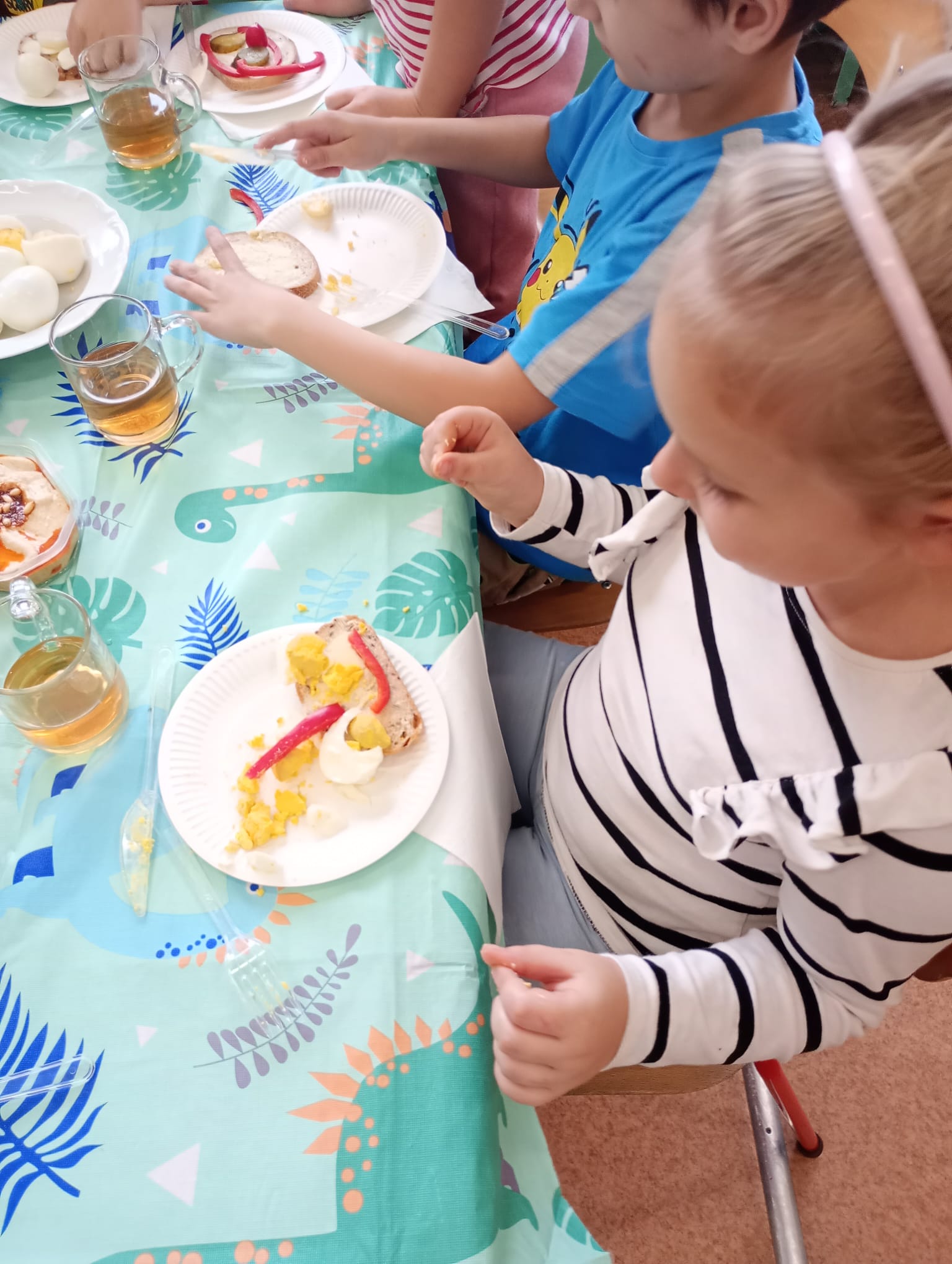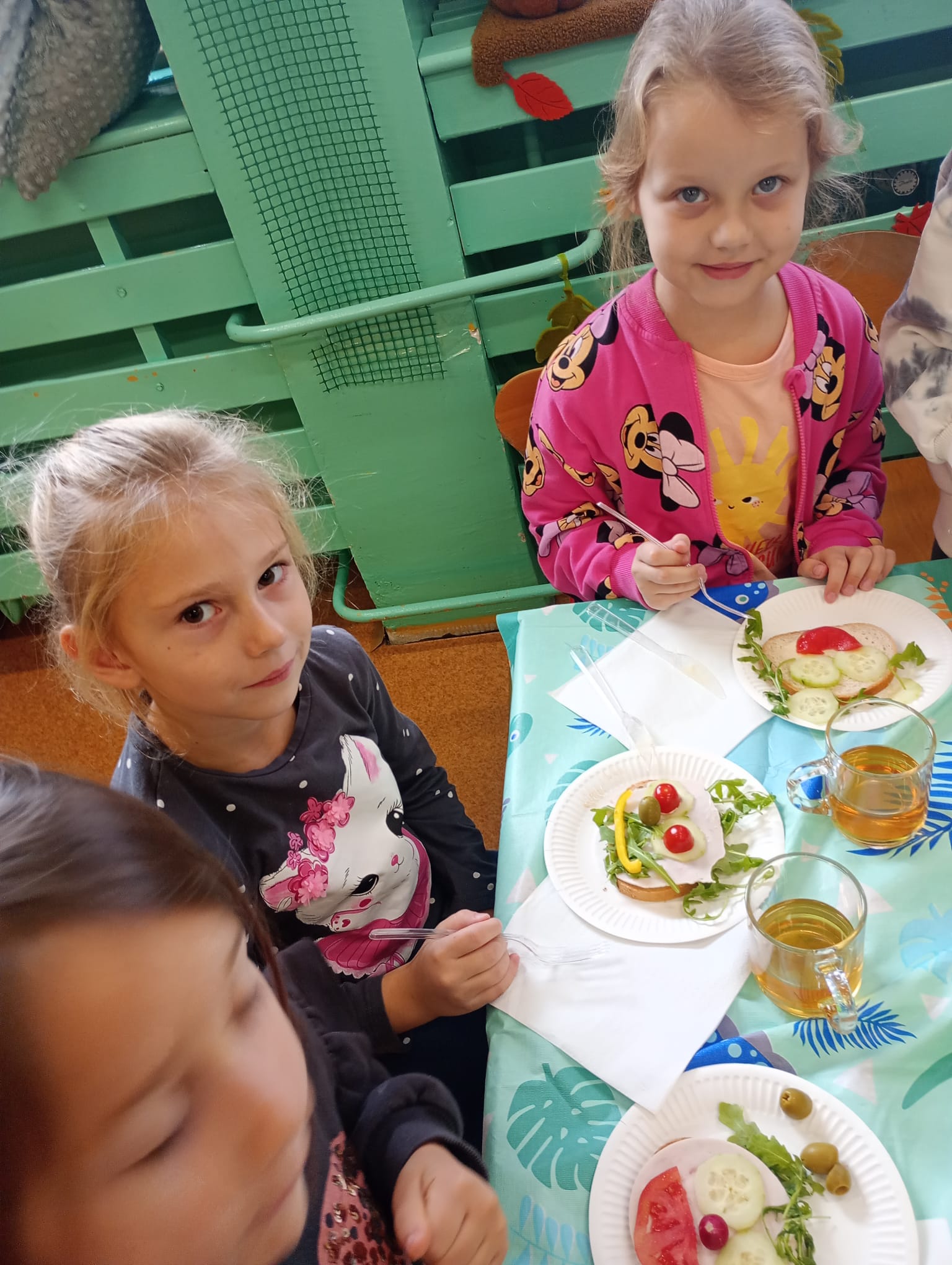 Dzieci z grupy Rumianki dbając o zdrowie wspólnie przygotowały warzywną sałatkę oraz na śniadanie zdrowe, kolorowe kanapeczki z różnych warzyw. Wspólnie przygotowane śniadanie bardzo smakowało przedszkolakom, następne zapewne przygotują dla rodziców w domu.