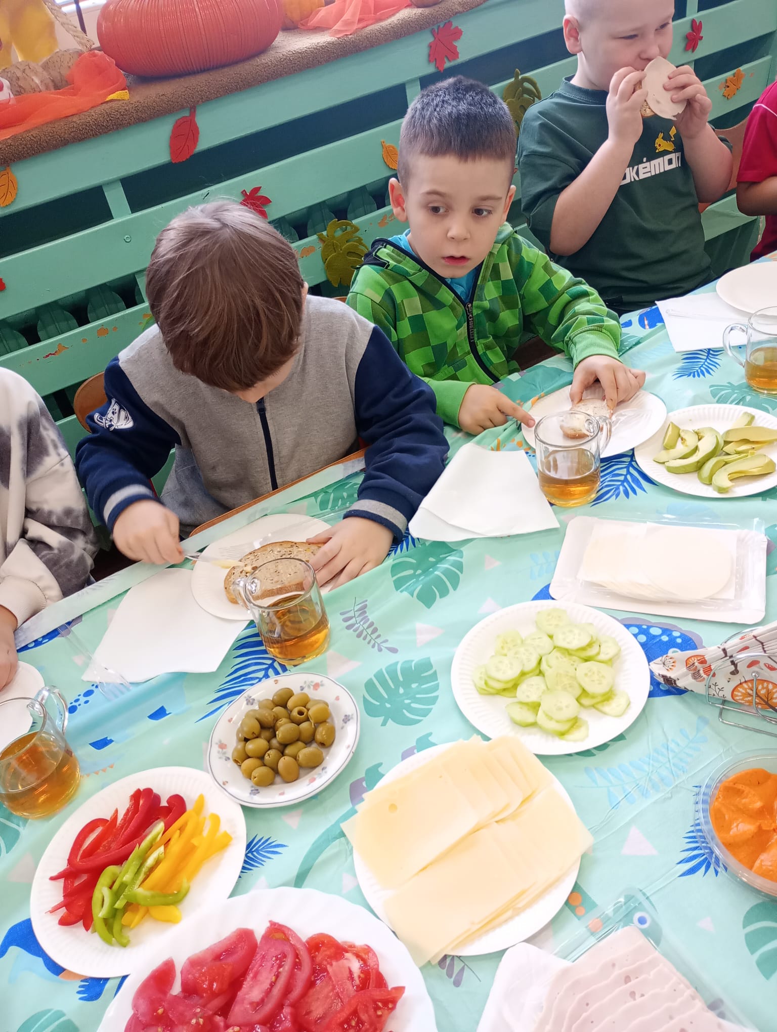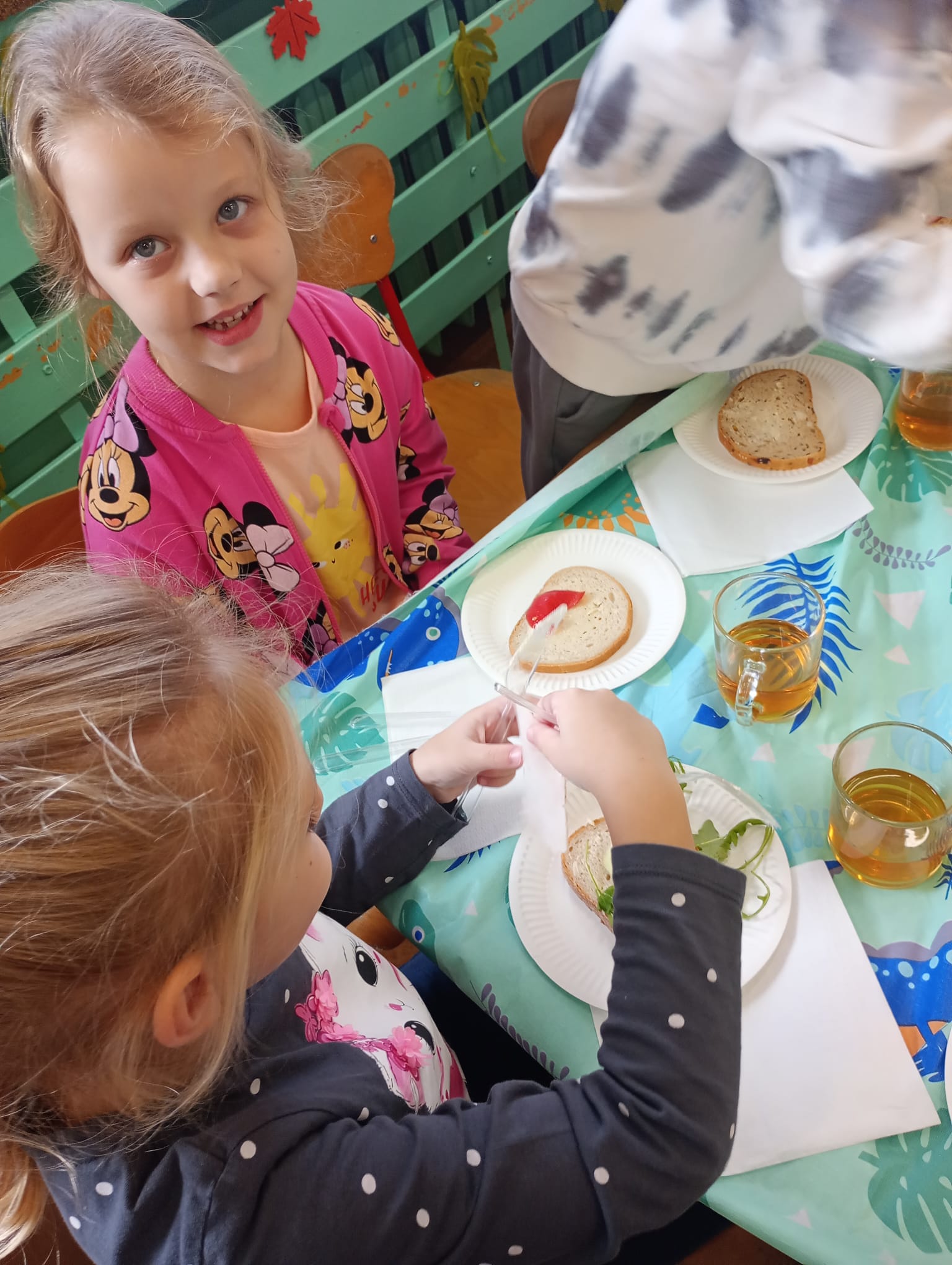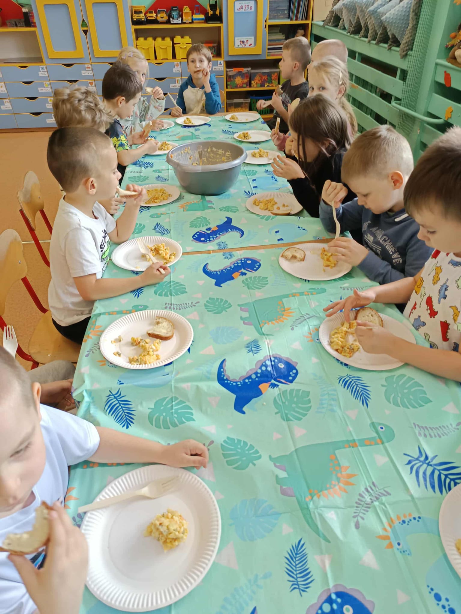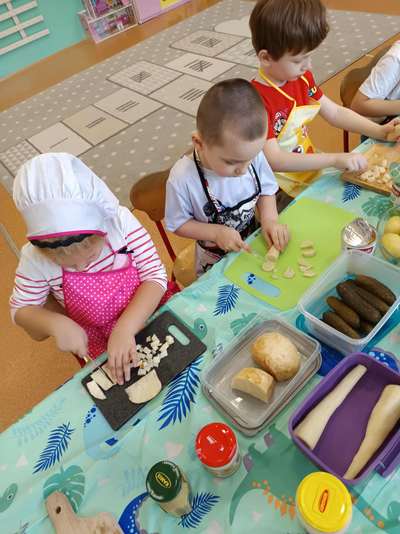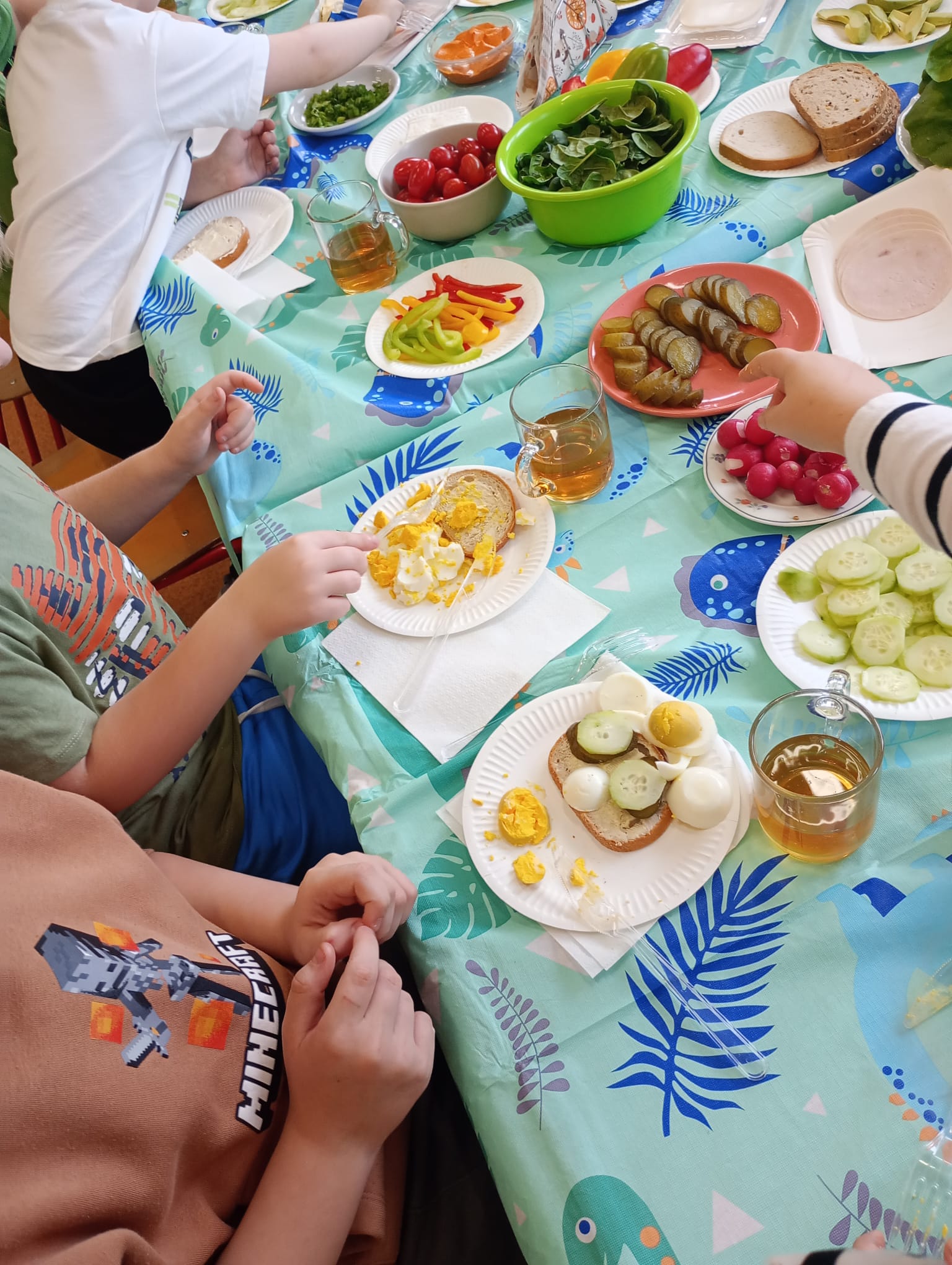 Dzieci z grupy Rumianki dbając o zdrowie wspólnie przygotowały warzywną sałatkę oraz na śniadanie zdrowe, kolorowe kanapeczki z różnych warzyw. Wspólnie przygotowane śniadanie bardzo smakowało przedszkolakom, następne zapewne przygotują dla rodziców w domu.