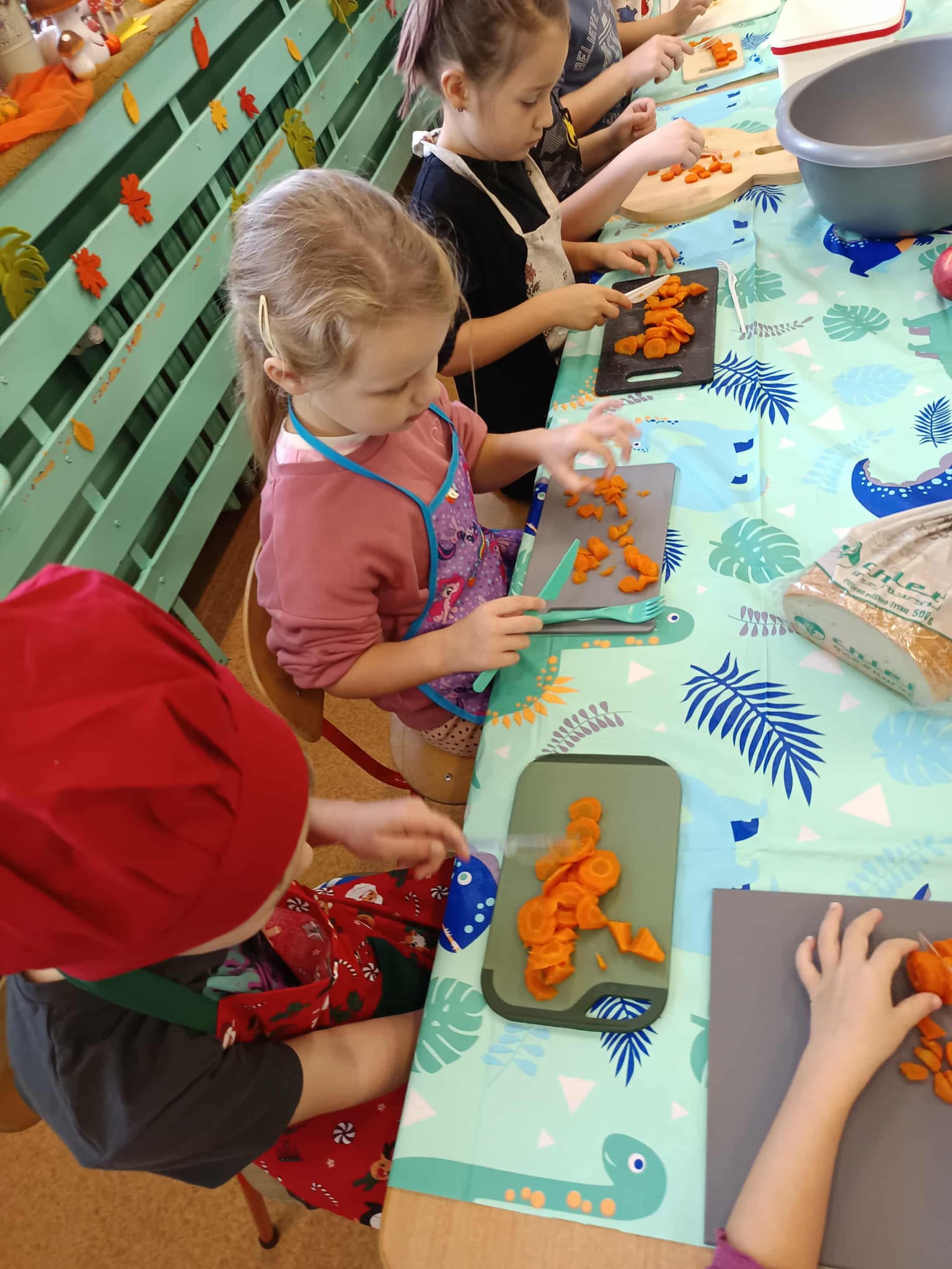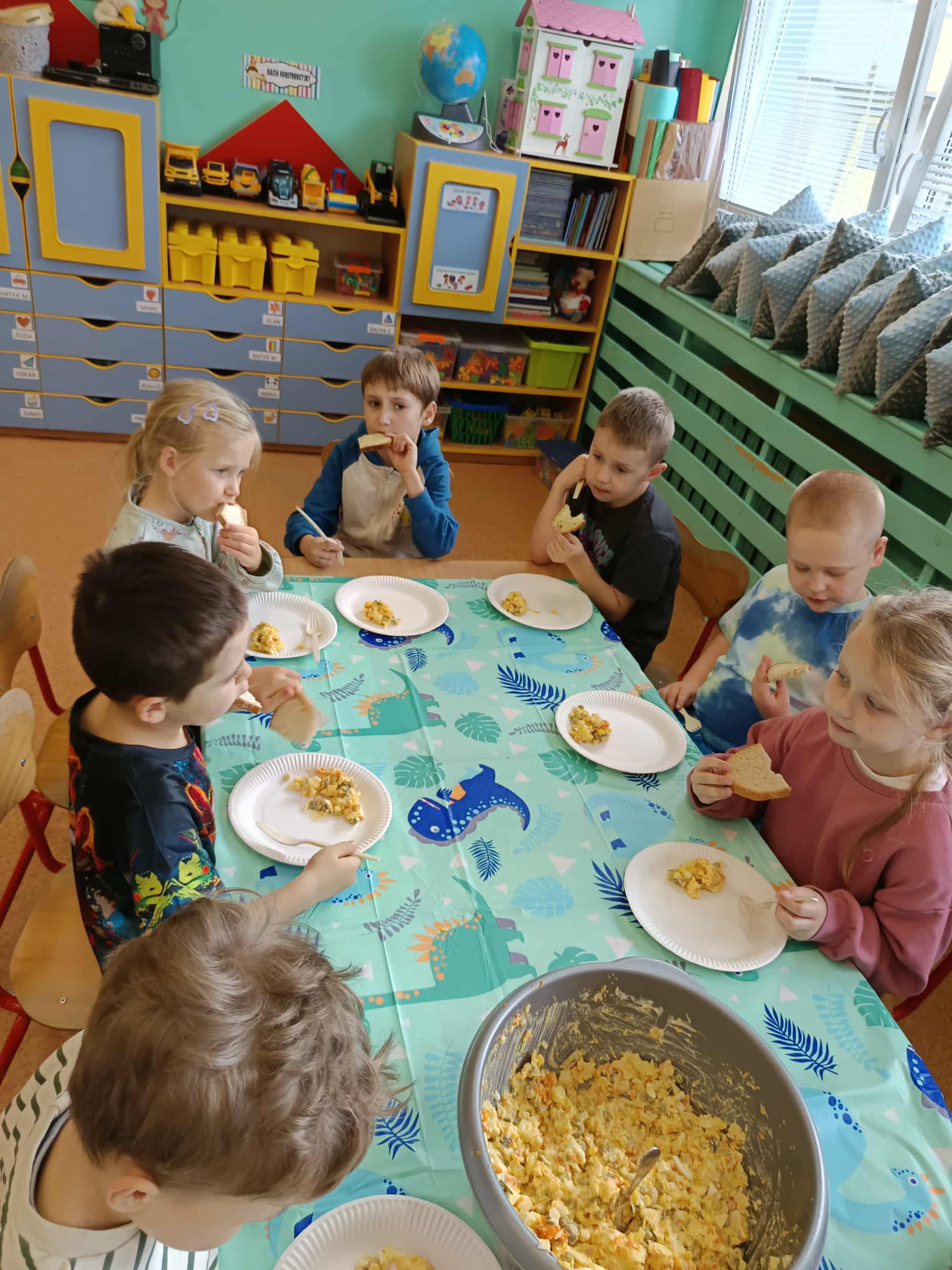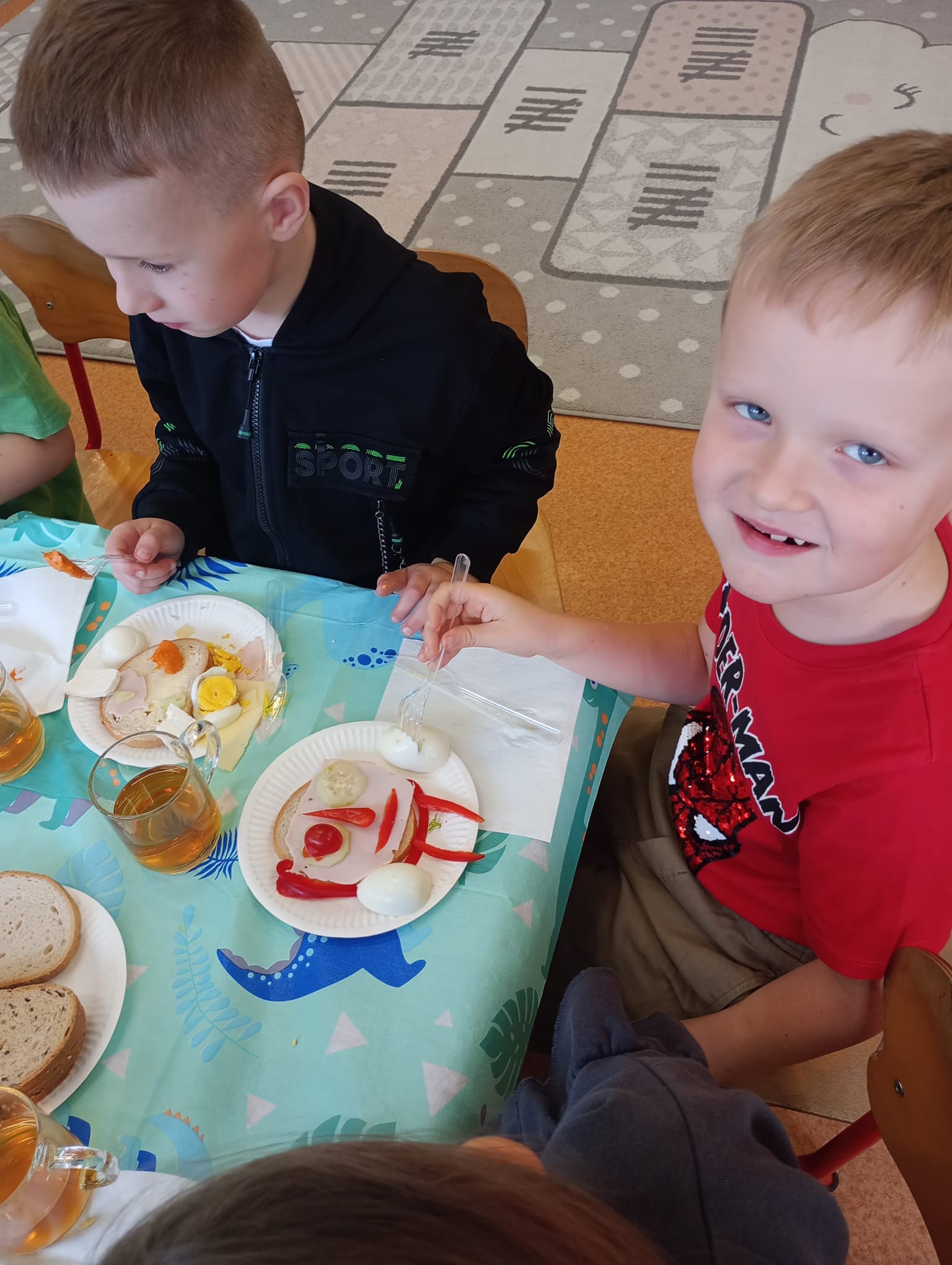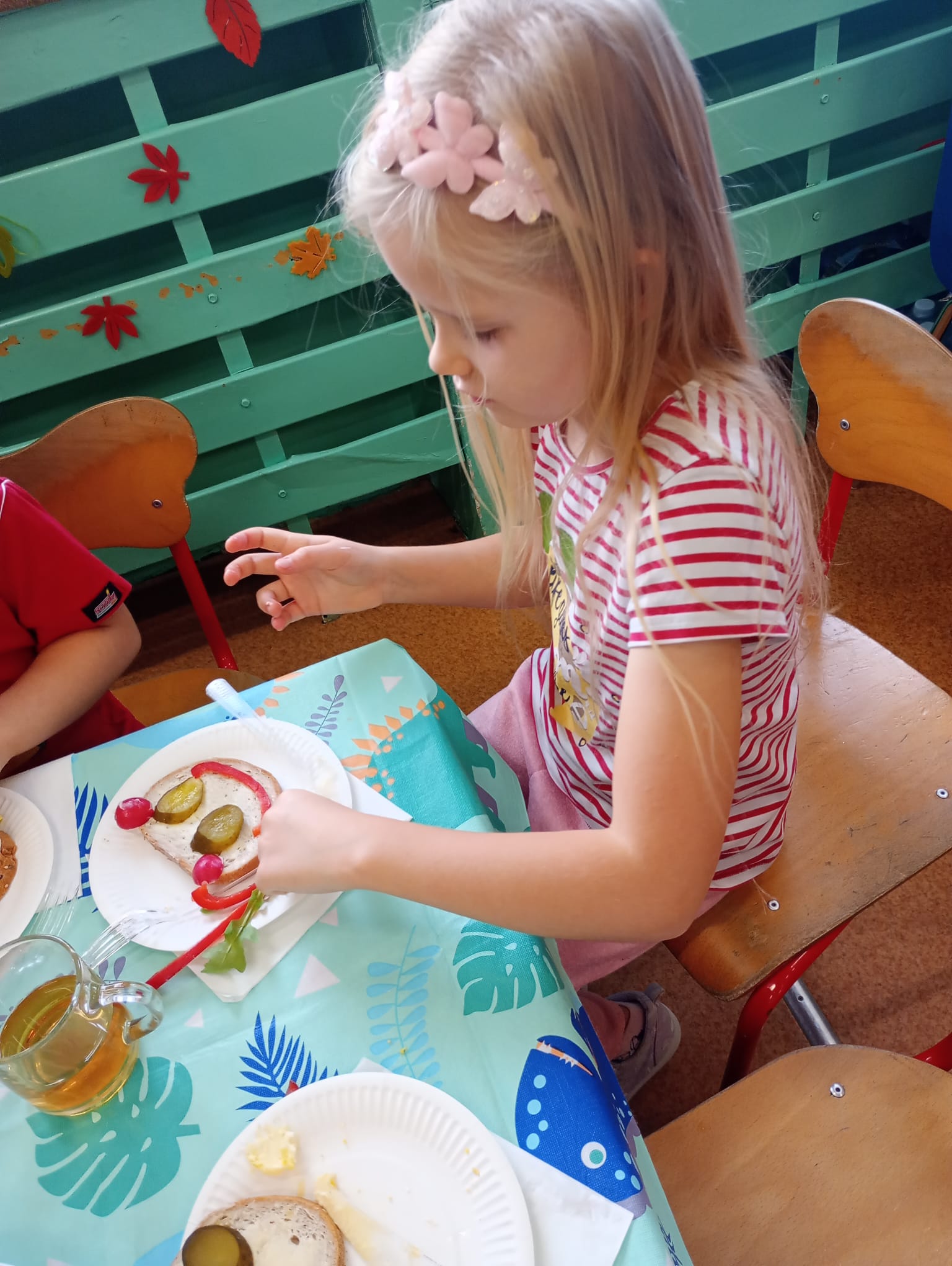 Dzieci z grupy Rumianki dbając o zdrowie wspólnie przygotowały warzywną sałatkę oraz na śniadanie zdrowe, kolorowe kanapeczki z różnych warzyw. Wspólnie przygotowane śniadanie bardzo smakowało przedszkolakom, następne zapewne przygotują dla rodziców w domu.