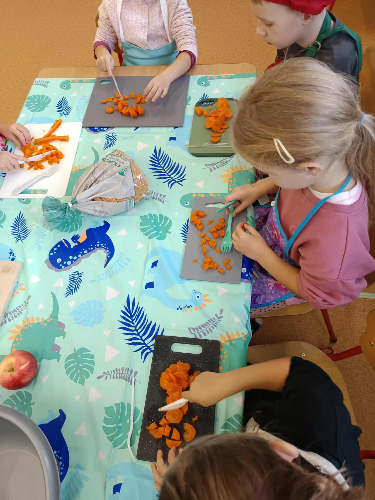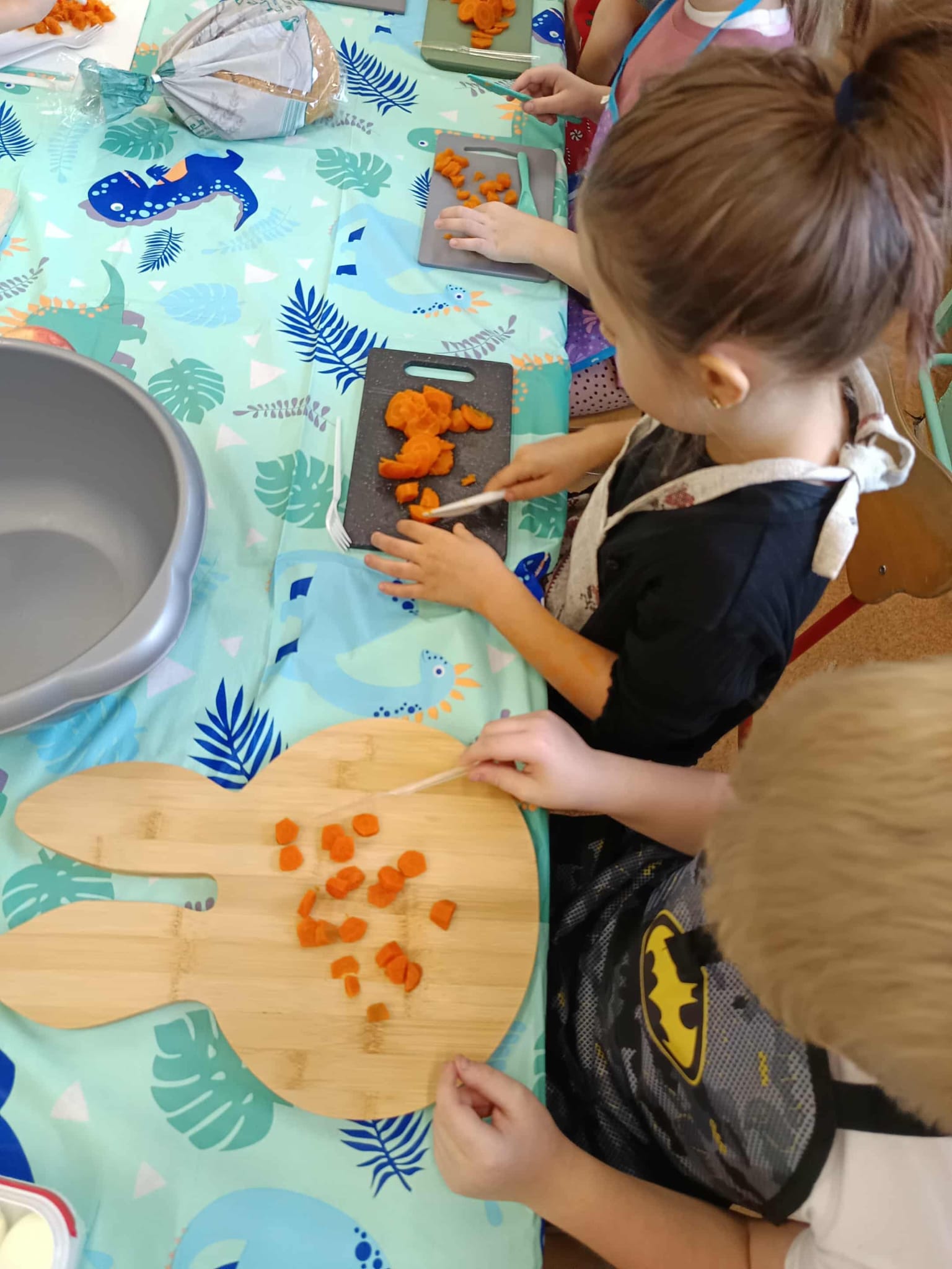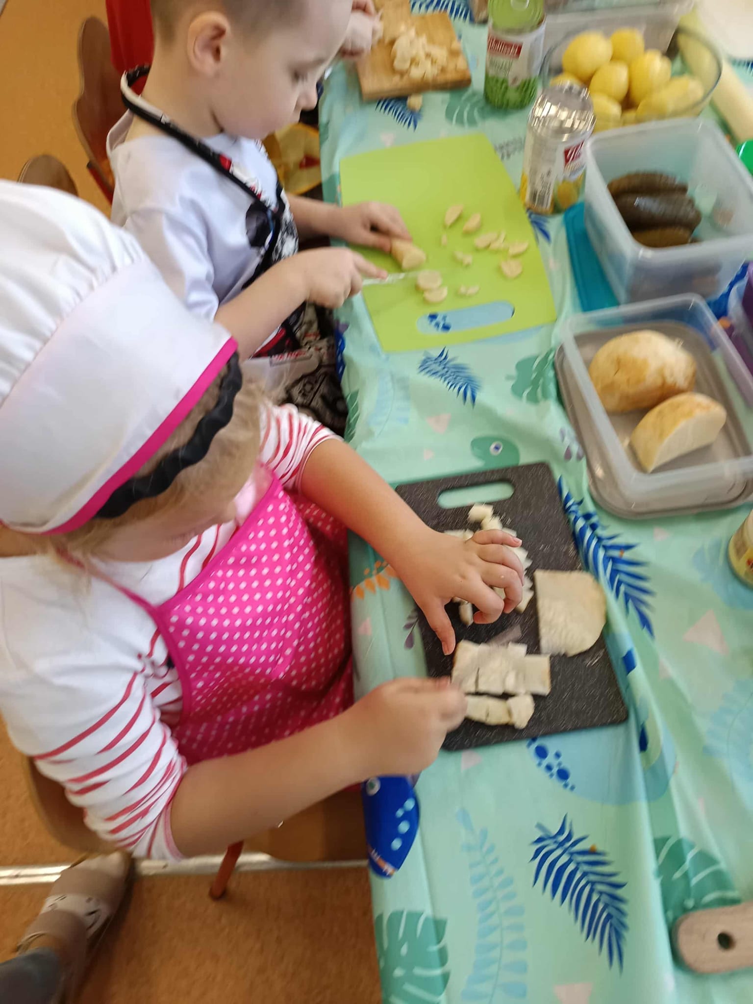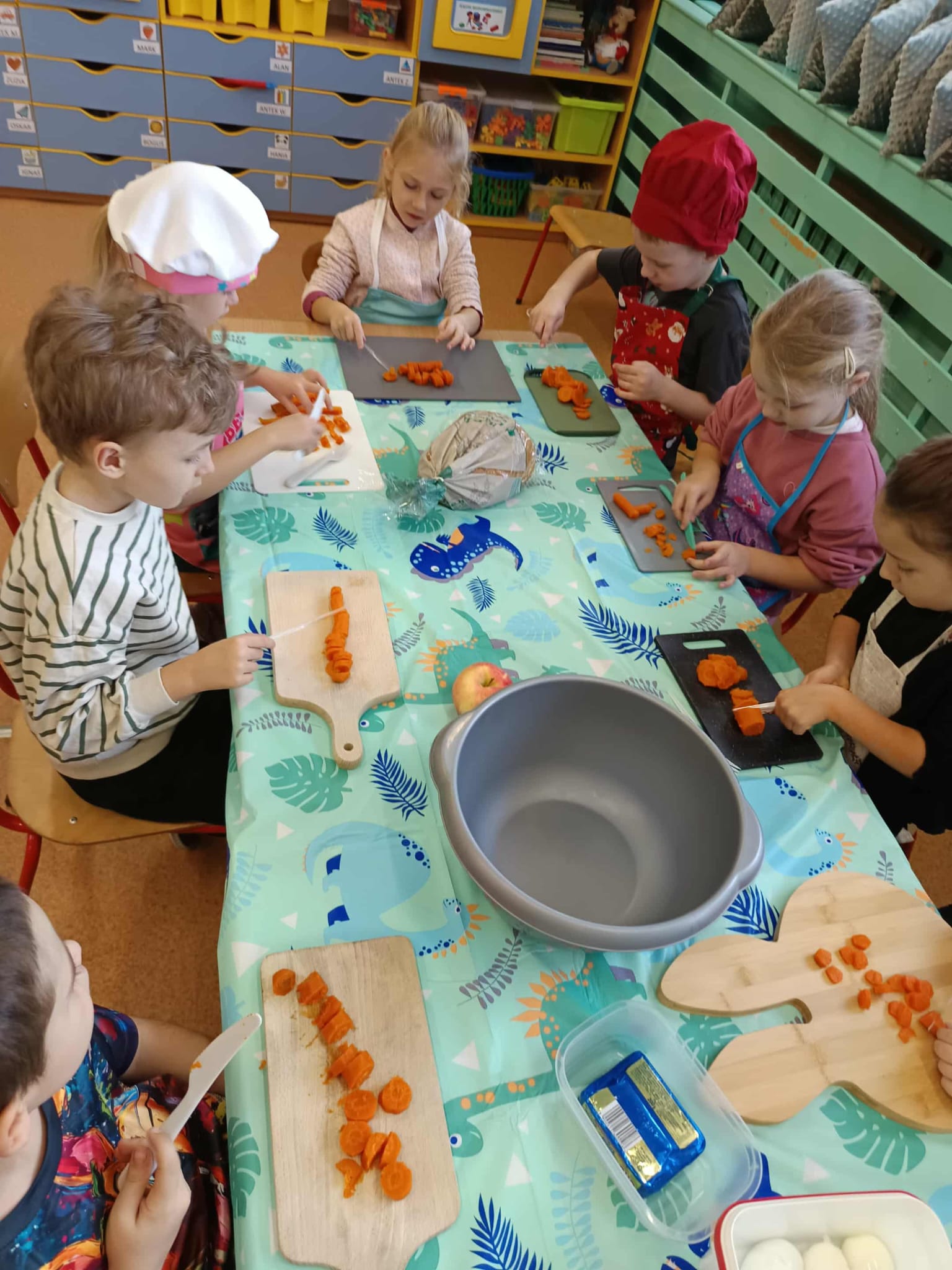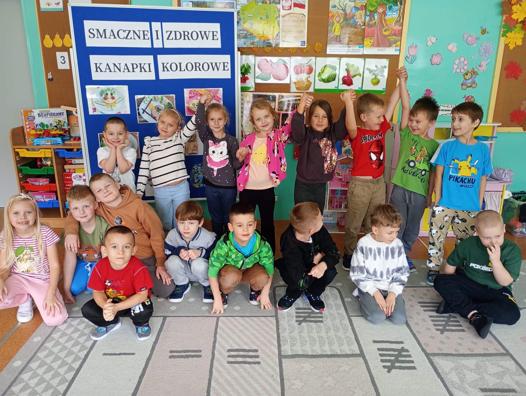 Dzieci z grupy Rumianki dbając o zdrowie wspólnie przygotowały warzywną sałatkę oraz na śniadanie zdrowe, kolorowe kanapeczki z różnych warzyw. Wspólnie przygotowane śniadanie bardzo smakowało przedszkolakom, następne zapewne przygotują dla rodziców w domu.