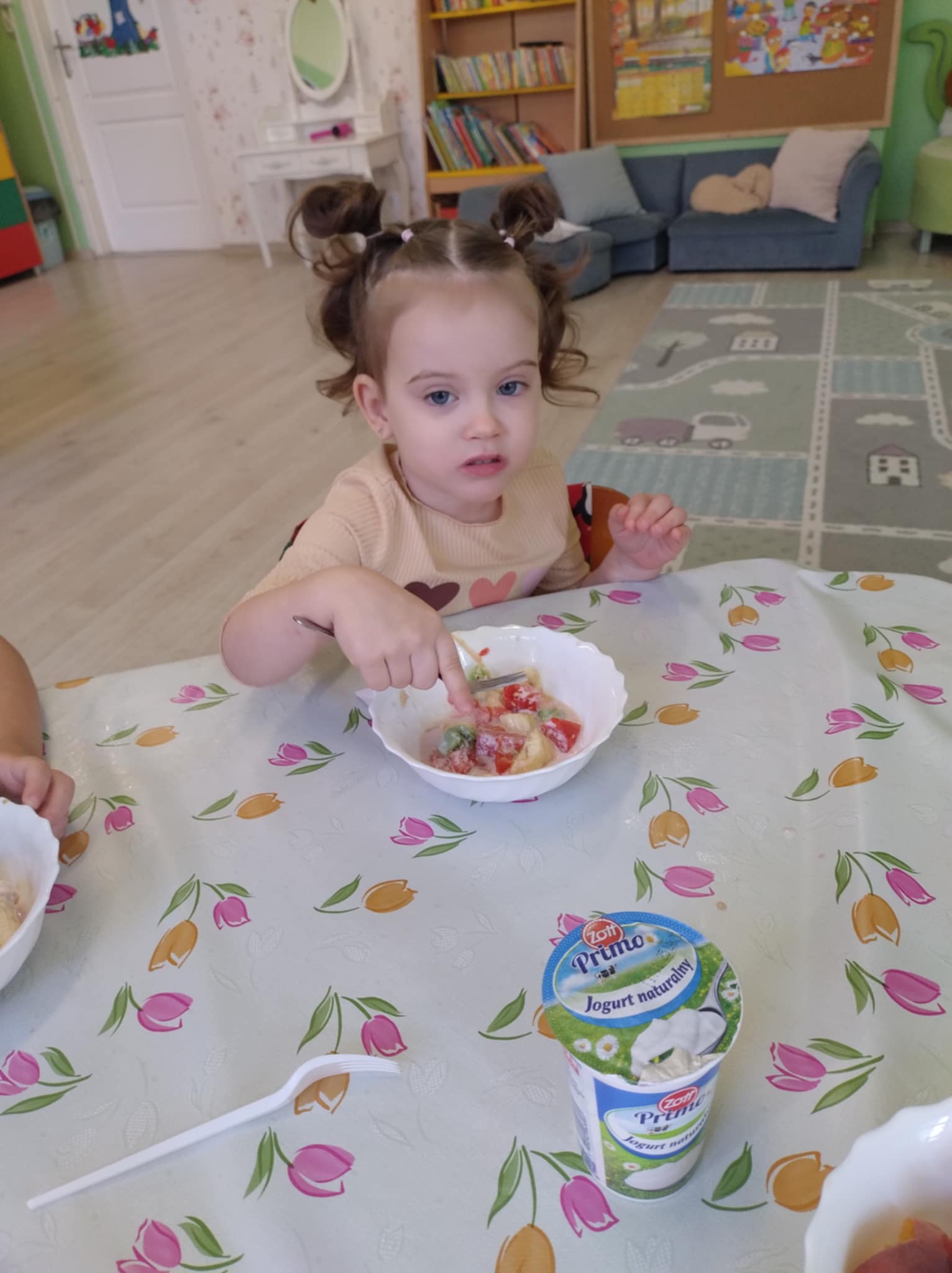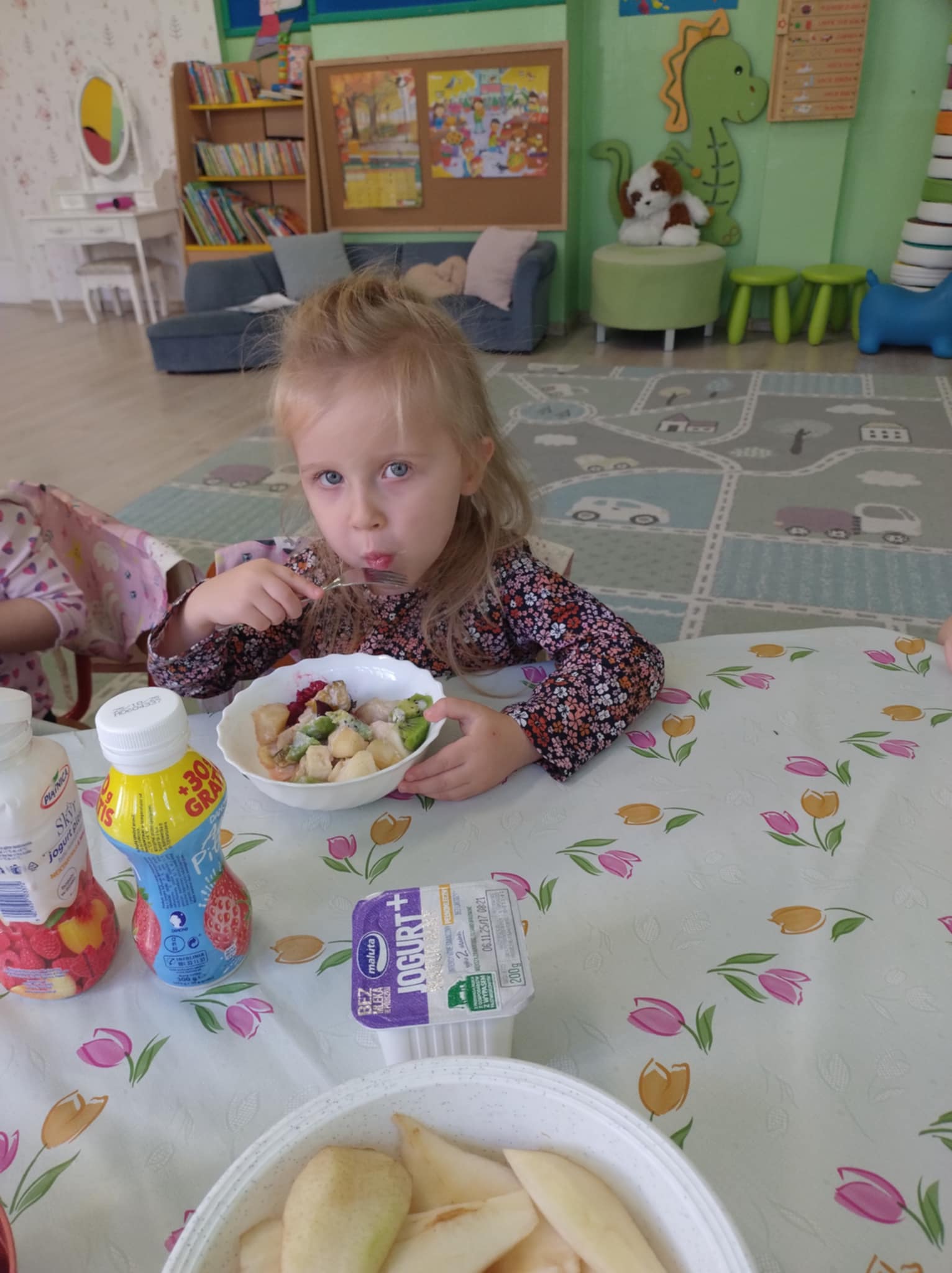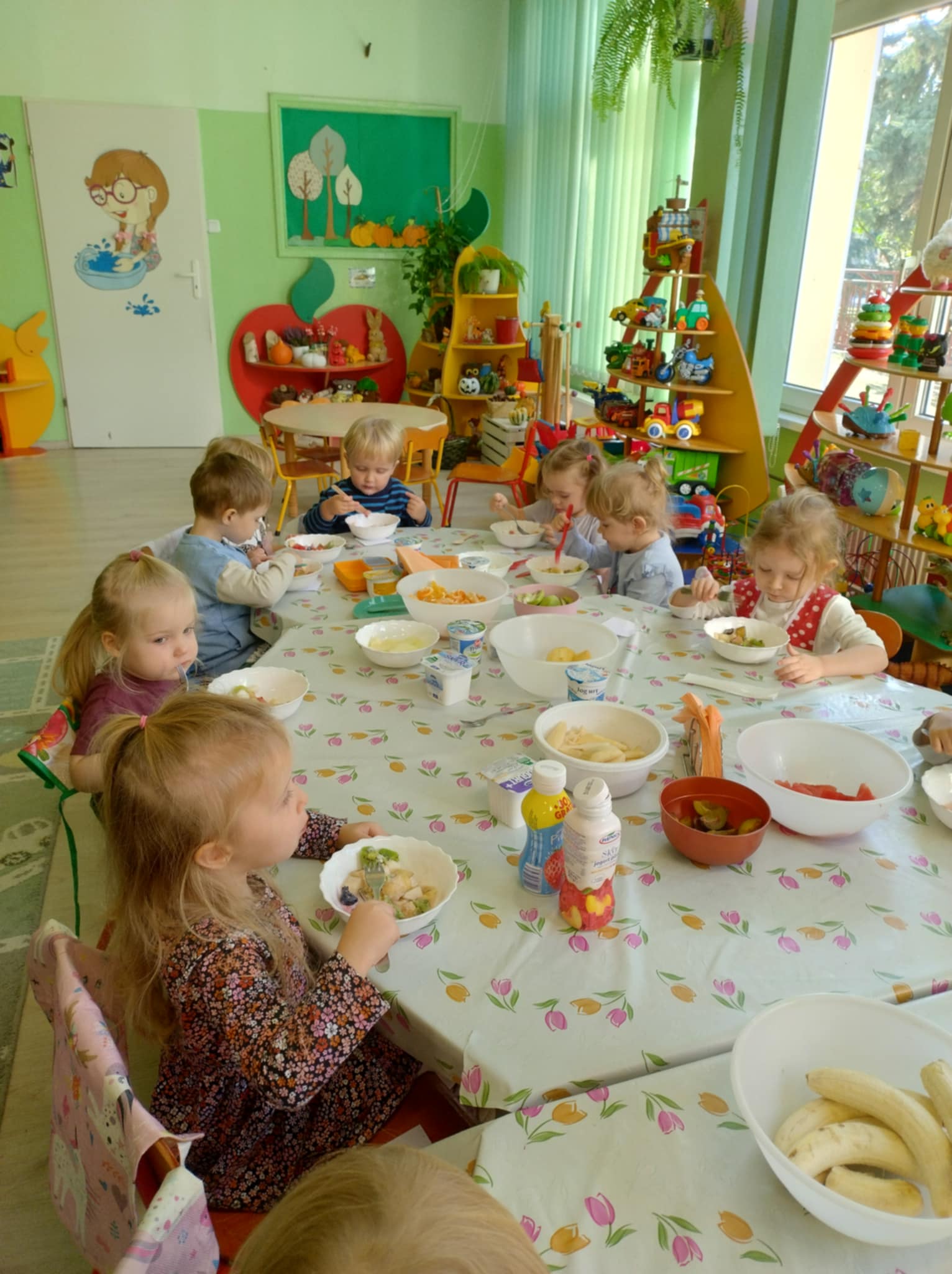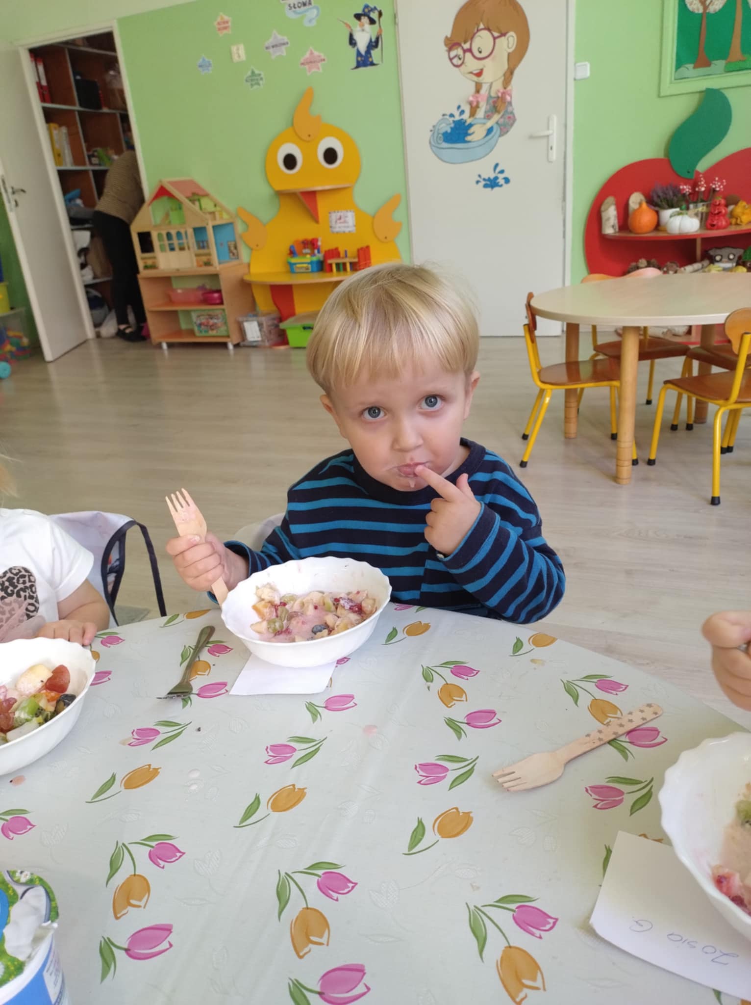Najpierw rozmawialiśmy o tym, jakie owoce znamy i które z nich najbardziej lubimy. Pani pokazała: jabłka, gruszki, banany, winogrona, kiwi, śliwki, mandarynki, arbuza, mango, melona, borówki, maliny i pomarańcze. Wąchaliśmy je, dotykaliśmy i opowiadaliśmy, jak wyglądają i smakują. Potem przyszła pora na przygotowanie owoców. Wszyscy dokładnie umyliśmy ręce, a następnie założyliśmy fartuszki. Pani obierała owoce, a my pomagaliśmy kroić i wrzucać je do miski. Każdy mógł dorzucić coś od siebie – trochę jabłka, banana albo kilka winogron. Było przy tym dużo śmiechu! Kiedy ulubione owoce były już w misce, dodaliśmy jogurt i wymieszaliśmy sałatkę łyżką. W całej sali pachniało słodko i świeżo. Na koniec nadszedł najlepszy moment – degustacja! Każde dziecko miało swoją miseczkę kolorowej sałatki. Wszyscy zajadali się ze smakiem. Po zjedzeniu sałatki rozmawialiśmy o tym, dlaczego warto jeść owoce i jak pomagają nam rosnąć zdrowo i silnie.
