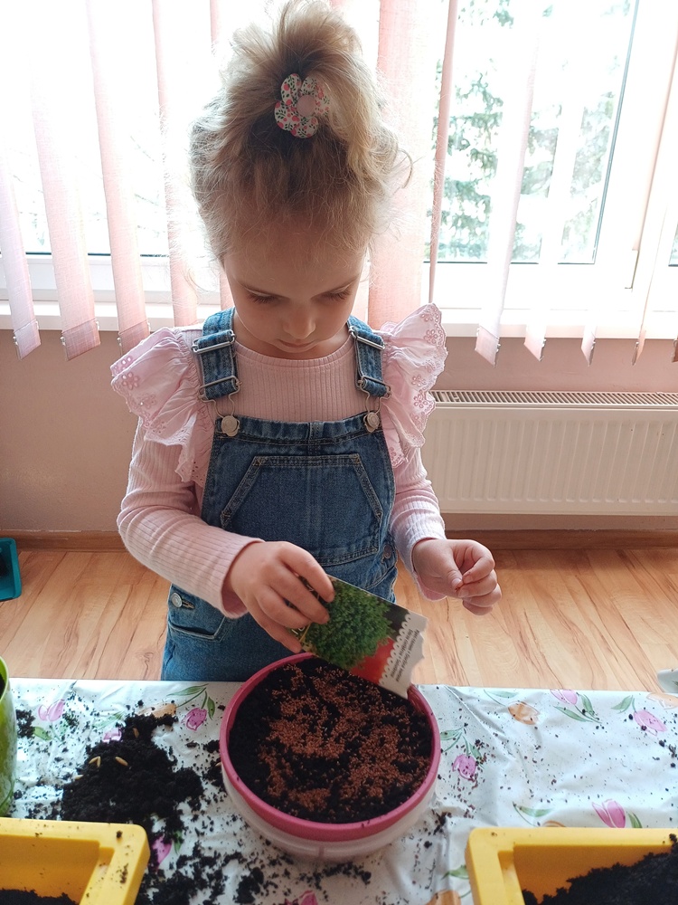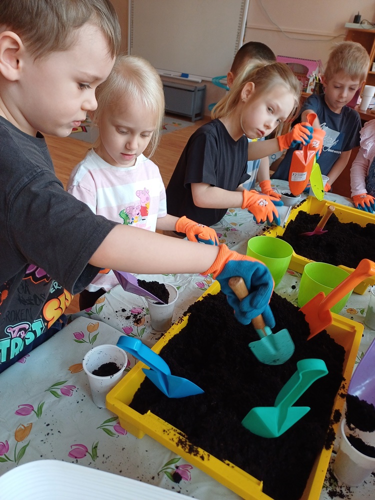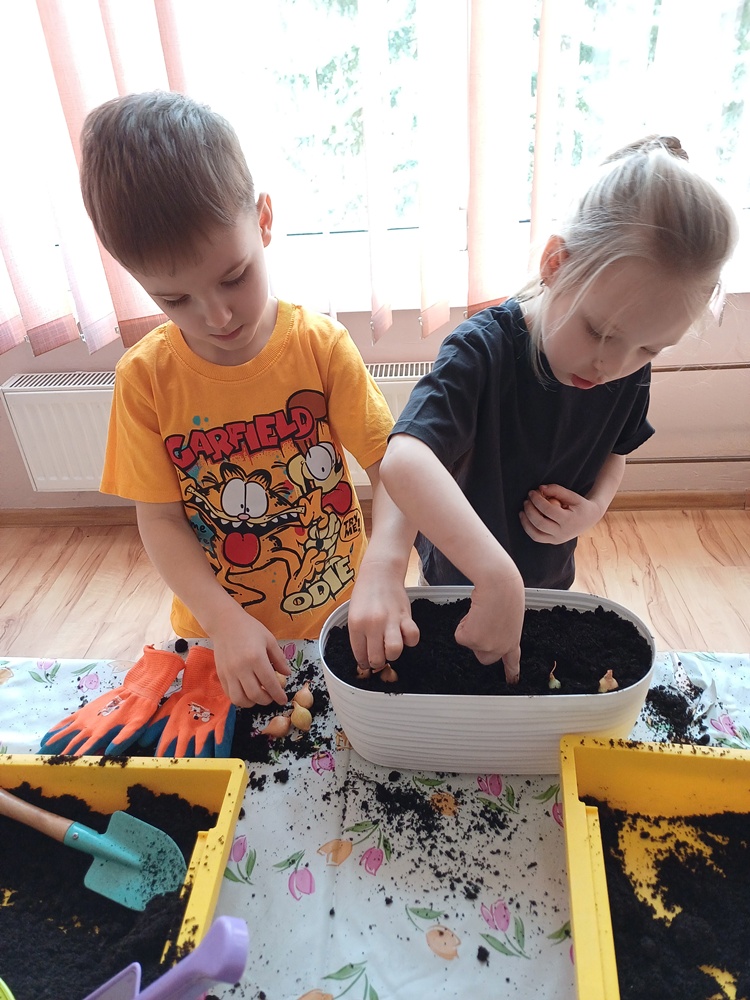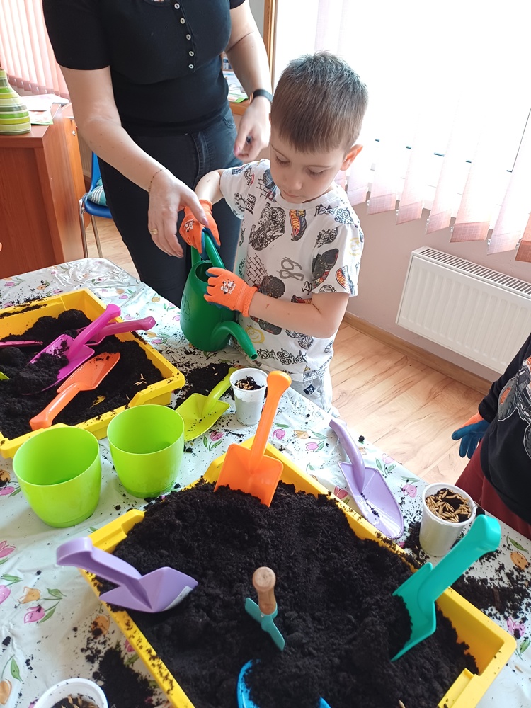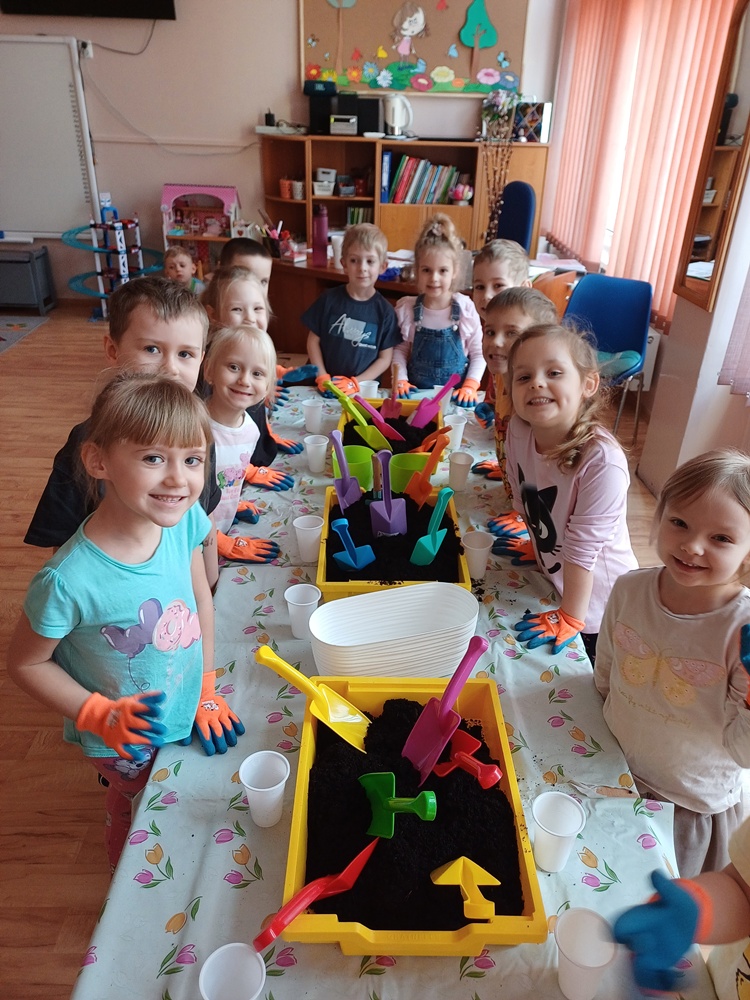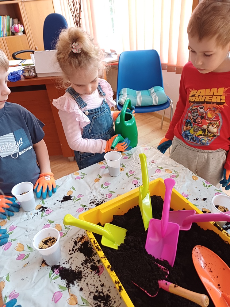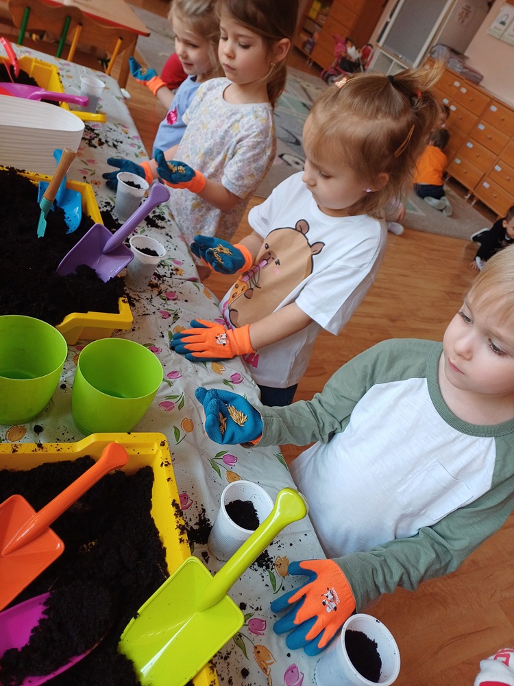 Ww wtorek podczas zajęć dzieci zmieniły się w małych ogrodników. Wyposażone w rękawiczki i łopatki z zaangażowaniem pracowały, sadząc cebulki oraz wysiewając owies wielkanocny i rzeżuchę. Nie zabrakło radości i "brudnych rąk", bo dzieci z wielkim entuzjazmem poznawały tajniki ogrodnictwa, świetnie bawiąc się przy pracy z ziemią.