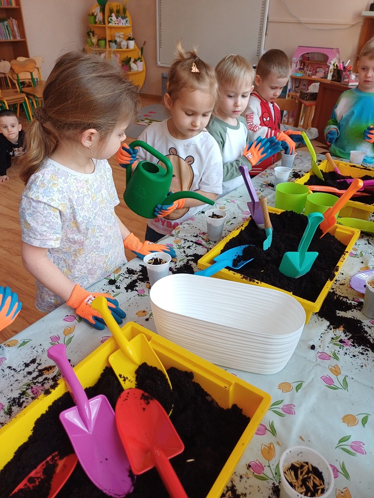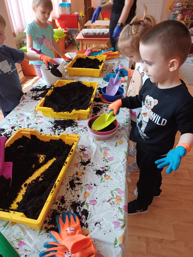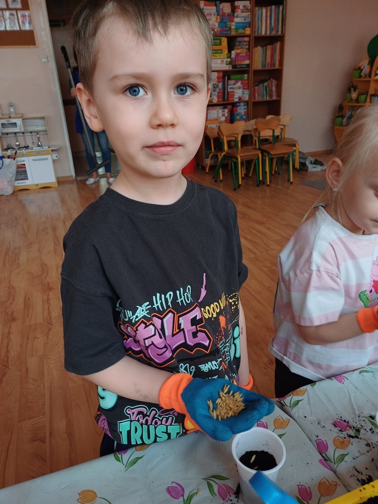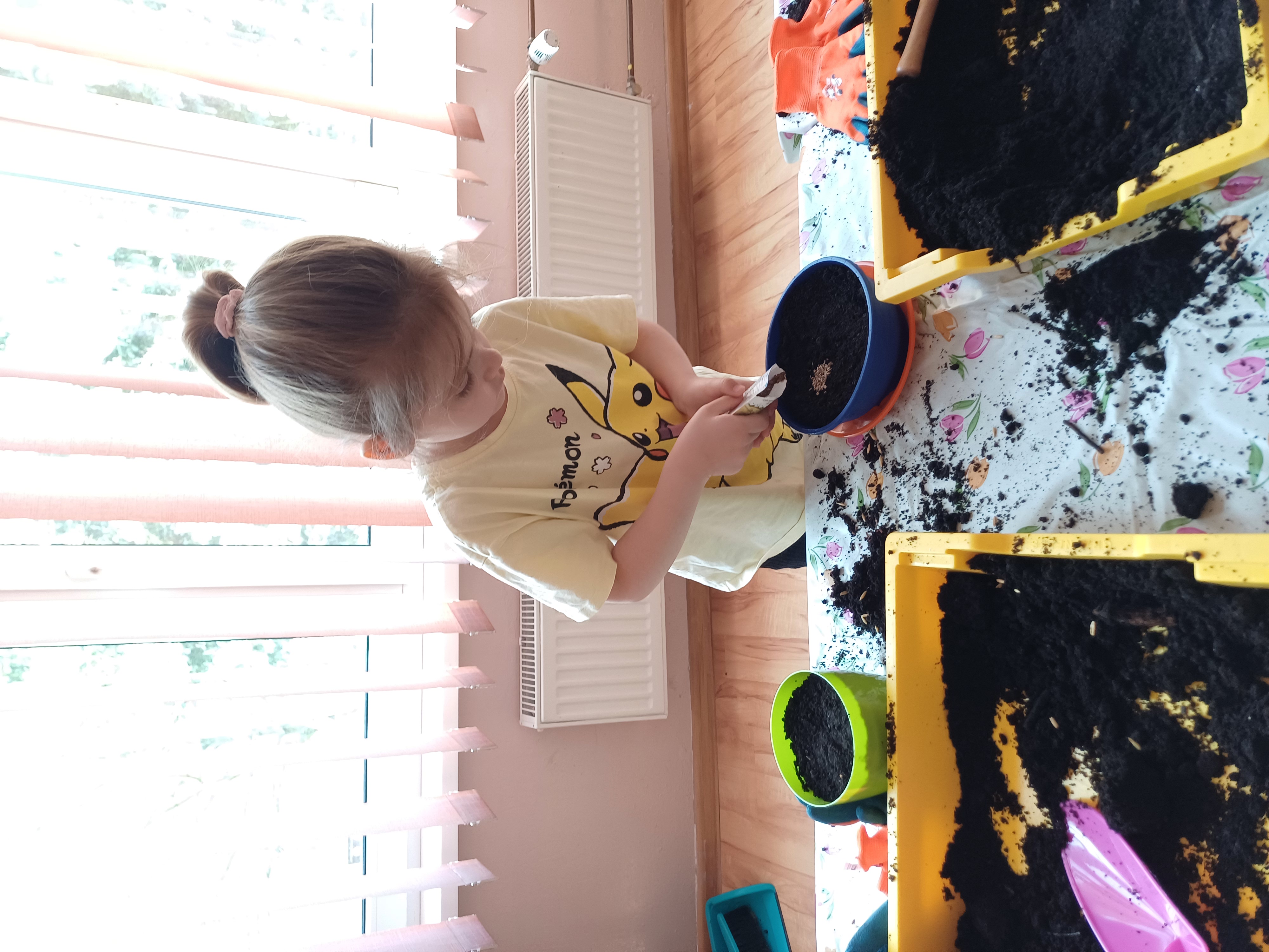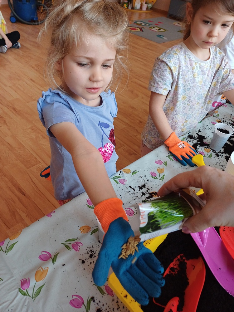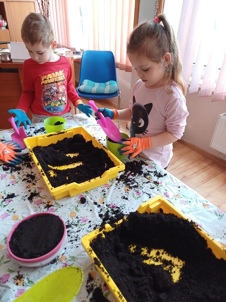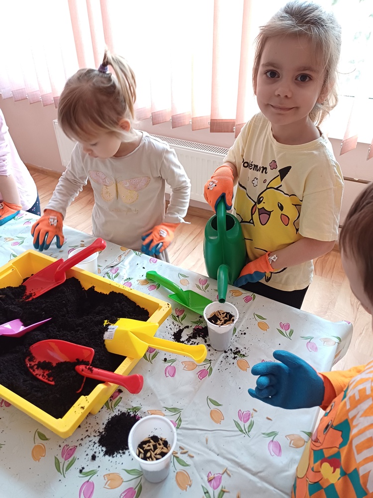 Ww wtorek podczas zajęć dzieci zmieniły się w małych ogrodników. Wyposażone w rękawiczki i łopatki z zaangażowaniem pracowały, sadząc cebulki oraz wysiewając owies wielkanocny i rzeżuchę. Nie zabrakło radości i "brudnych rąk", bo dzieci z wielkim entuzjazmem poznawały tajniki ogrodnictwa, świetnie bawiąc się przy pracy z ziemią.