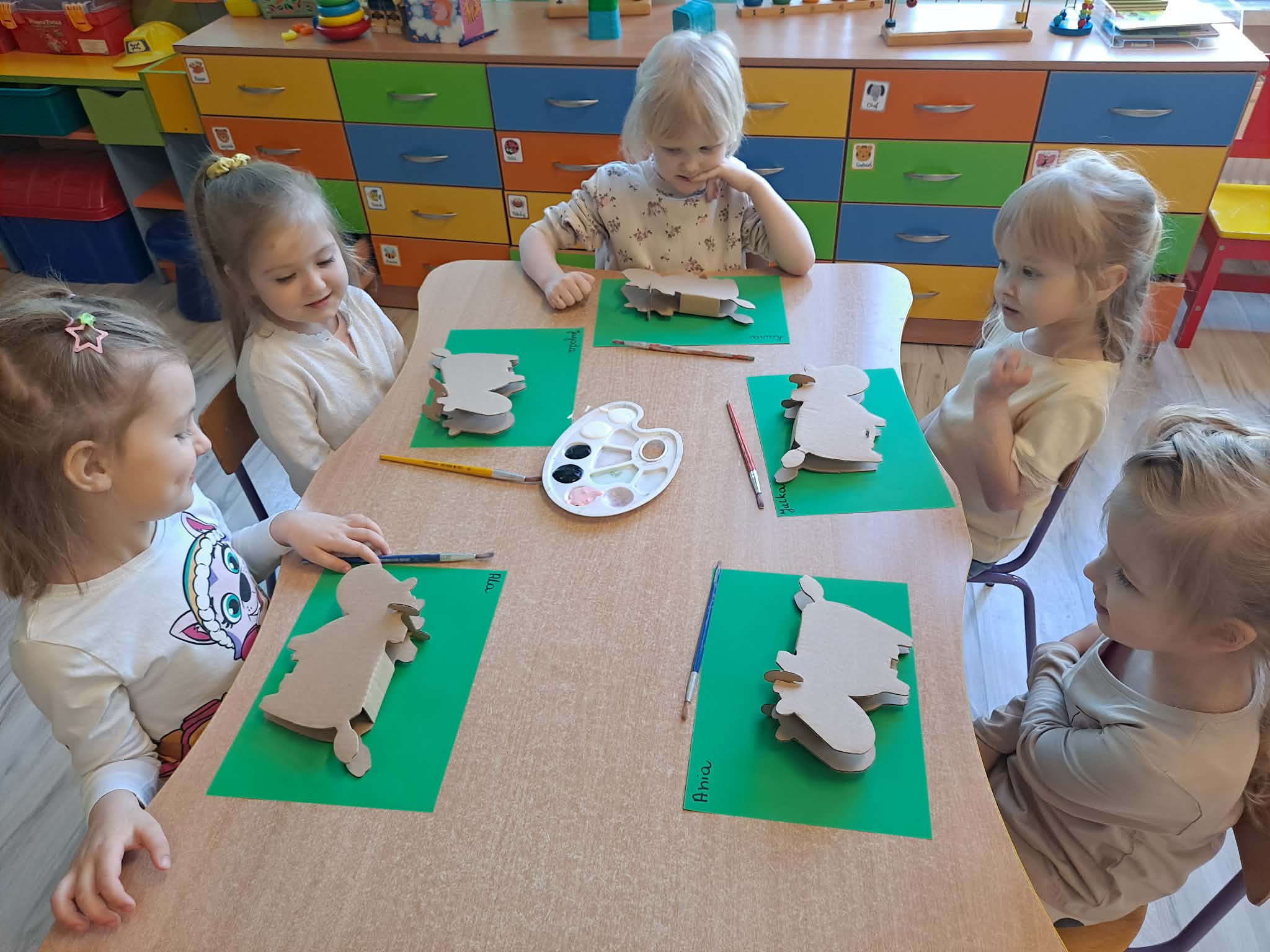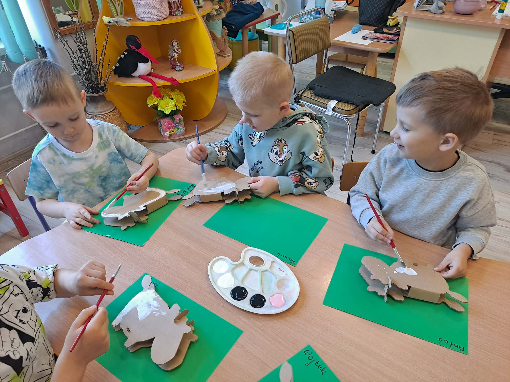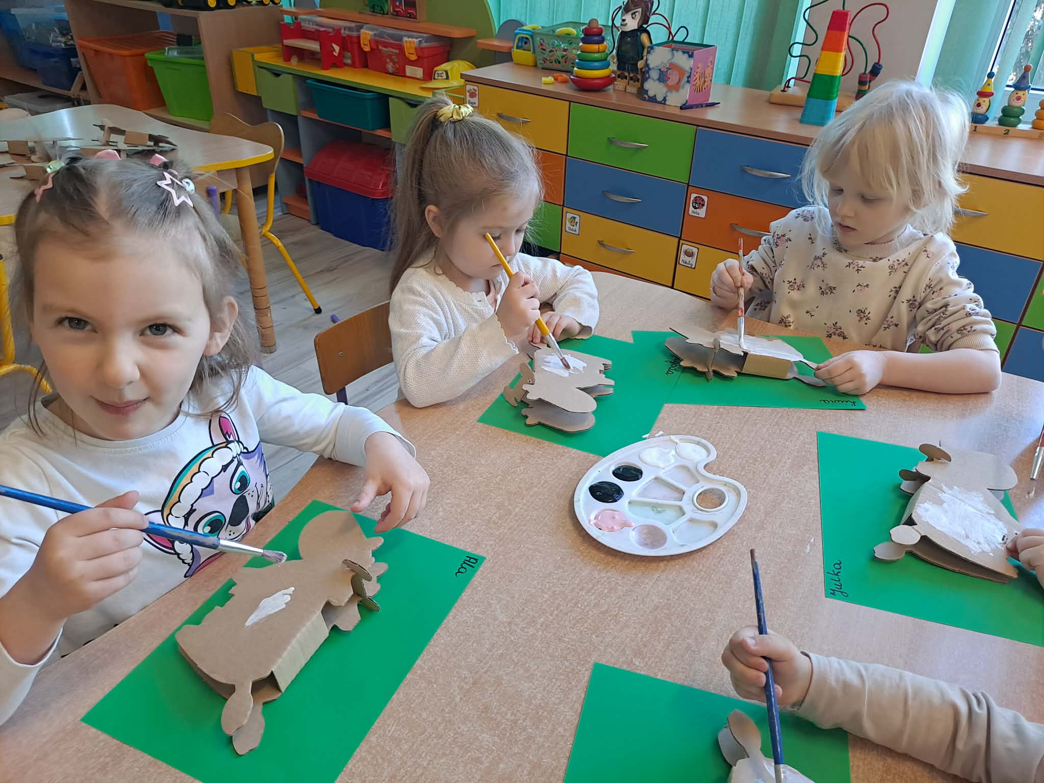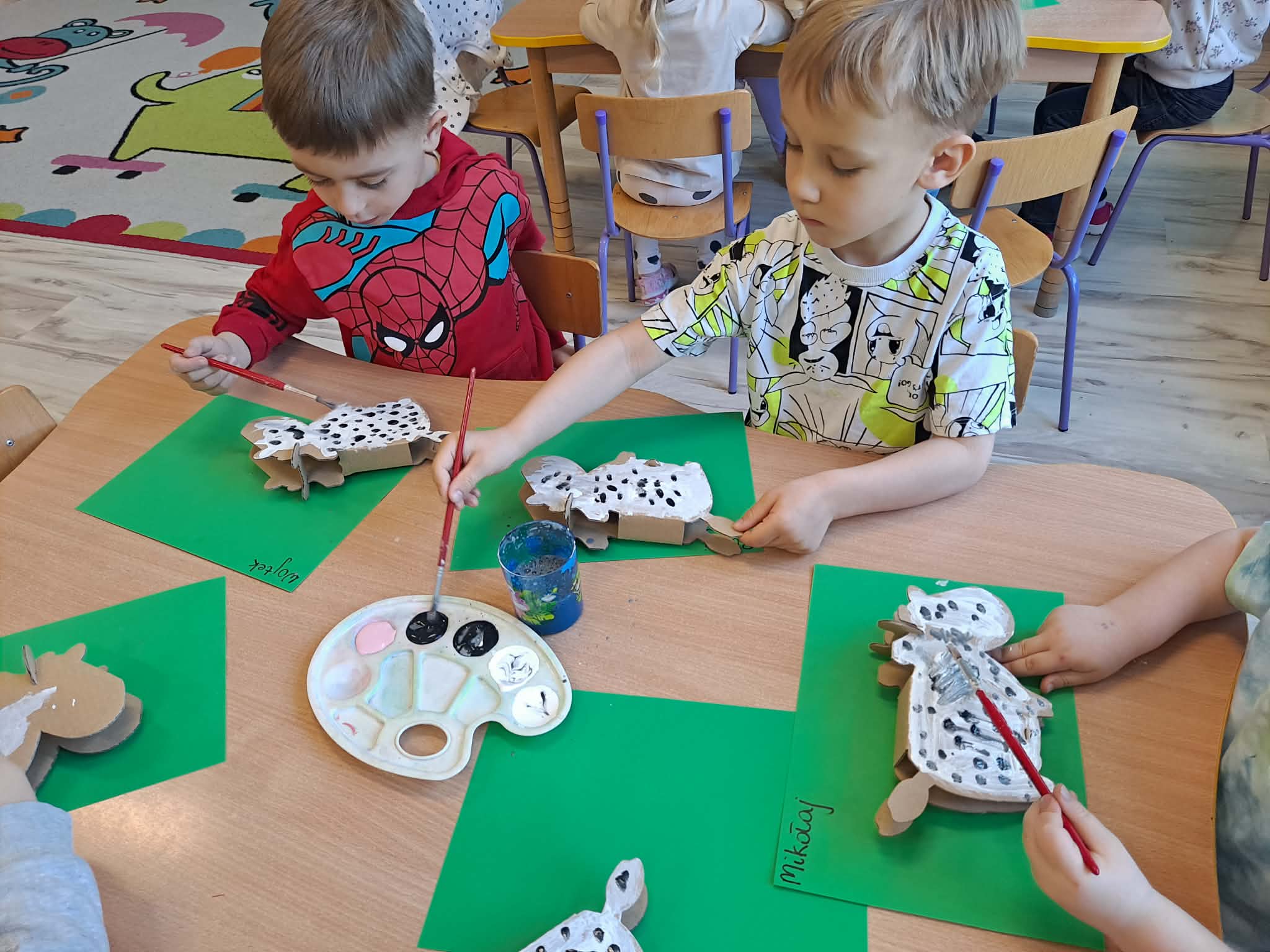 Zwieńczeniem zajęć była praca plastyczna – krowa wykonana z tekturowego papieru. Przedszkolaki z ogromnym zaangażowaniem i radością tworzyły swoje prace, rozwijając przy tym kreatywność oraz sprawność manualną.